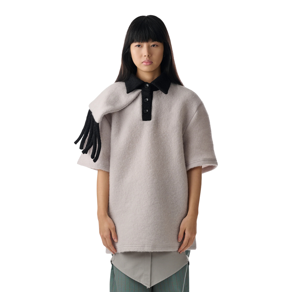 Short-sleeve pullover top crafted in soft brushed wool with contrast navy collar and button placket.
