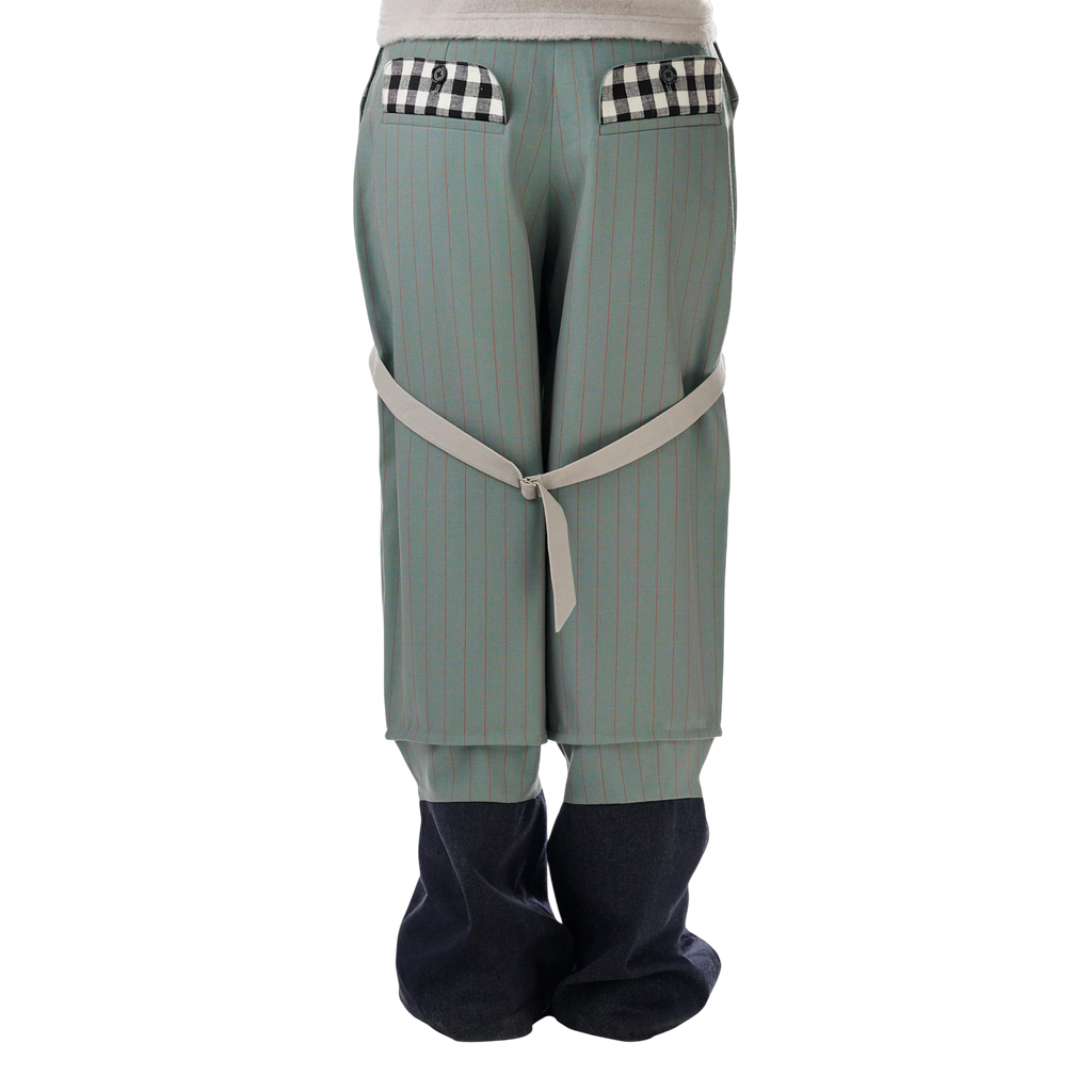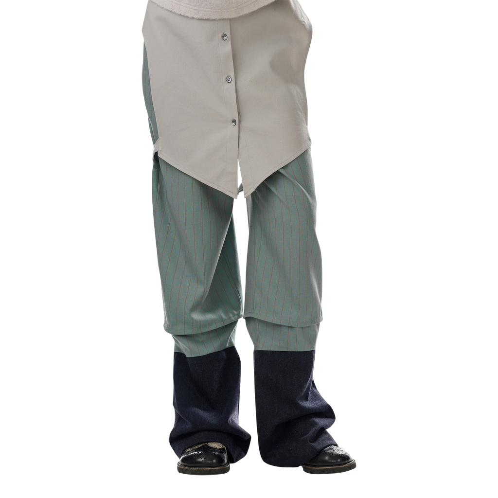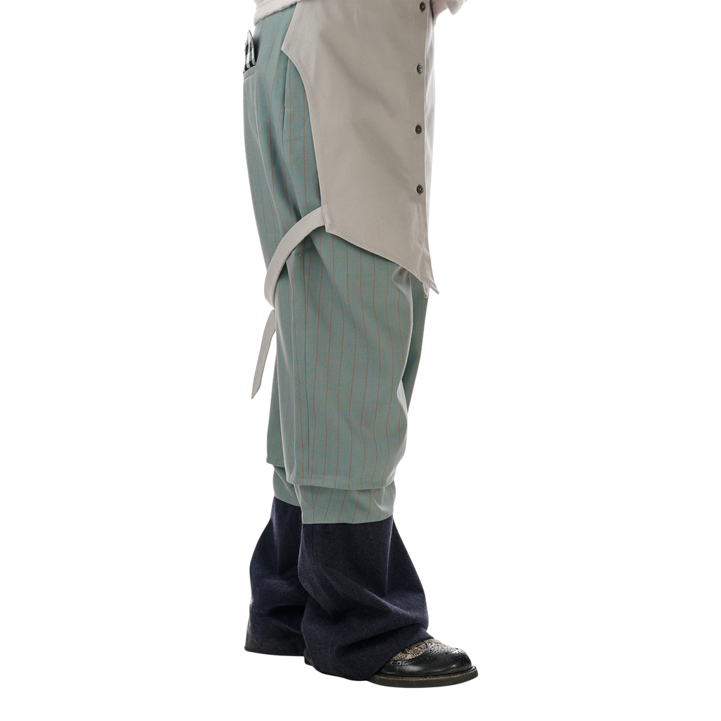 Wide-leg pants with attached cotton shirt panel wrapping around the waist and front.