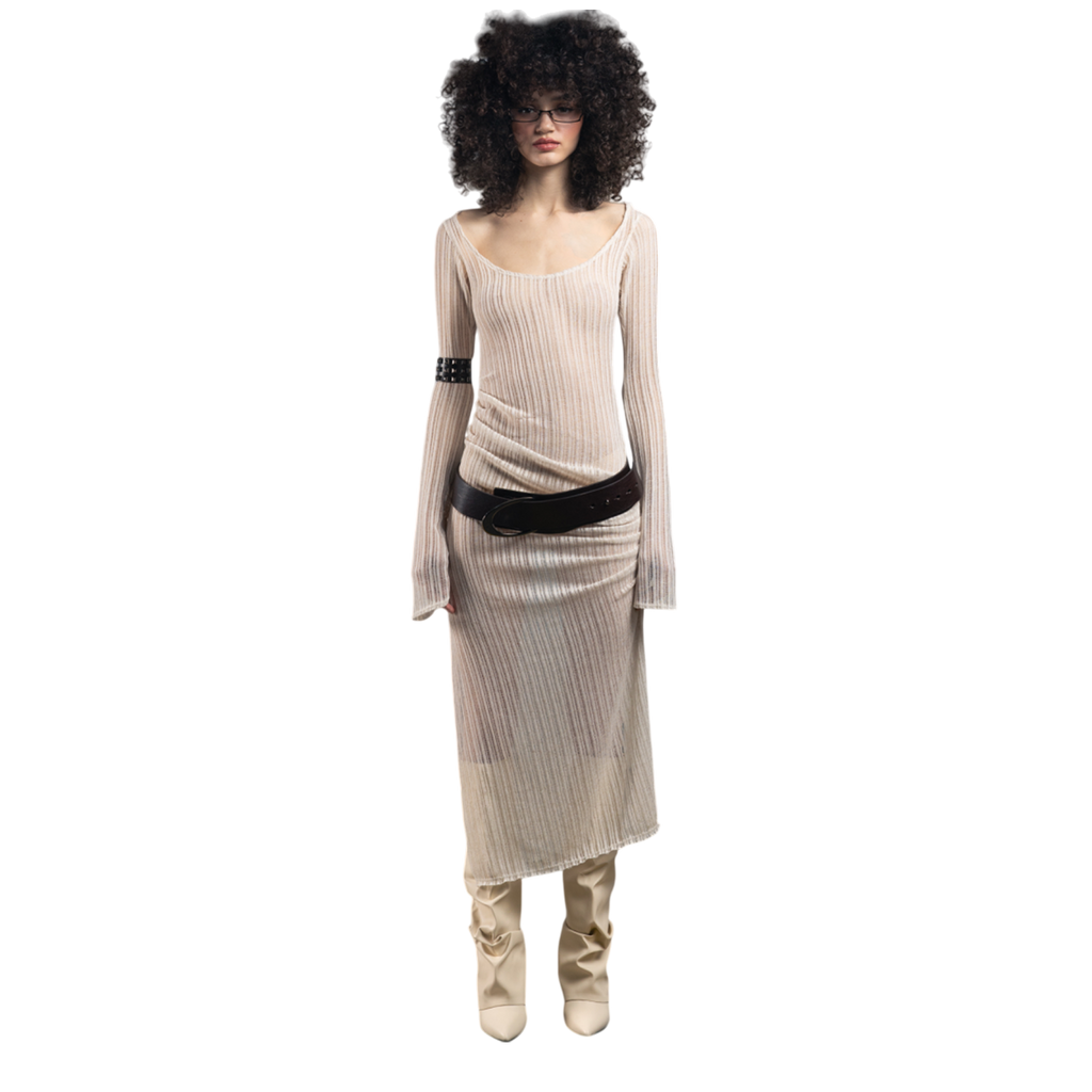 An open-weave long sleeve knit dress with a cozy, relaxed feel.
