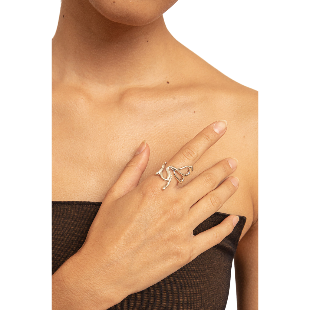 Freya Douglas Ferguson, a London-based sculptor and self-taught jeweler, blends her unique style, influenced by Biomorphism and sci-fi imagery. Collaborating with renowned designers and worn by artists like Caroline Polachek, her one-of-a-kind pieces are handmade in recycled sterling silver, emphasizing process and materiality.