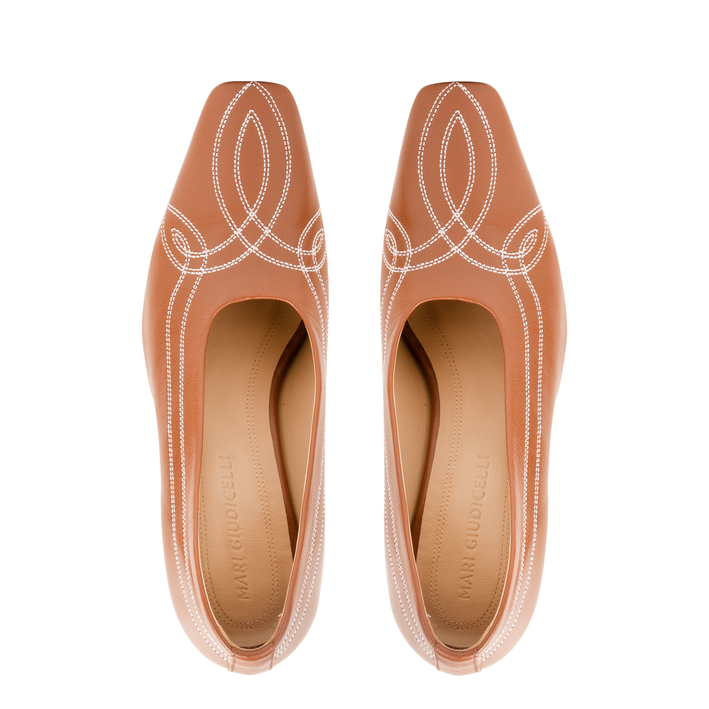 Suela calf embroidered leather with tonal stitching, square toe, padded footpad, leather Lining and leather sole. Fits true to size. Approx. 2" wooden heel.