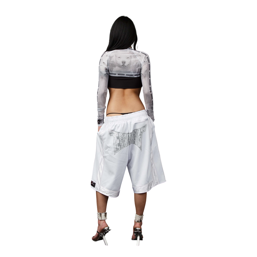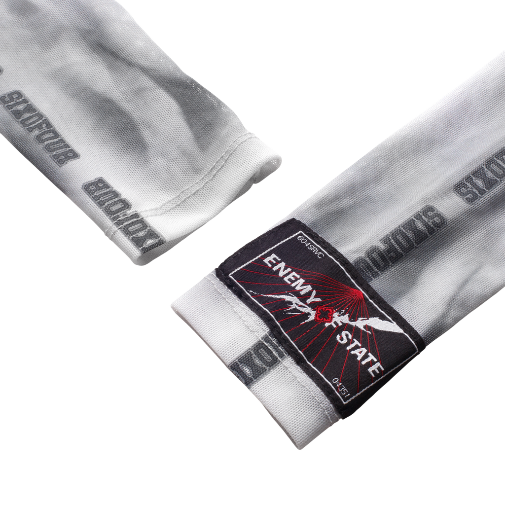A slim-fit bolero cardigan crafted from lightweight mesh, featuring an all-over printed graphic artwork by 604SERVICE. Finished with a 604 woven label detail on the sleeve for a subtle branded touch. Designed to layer effortlessly over tanks or dresses.