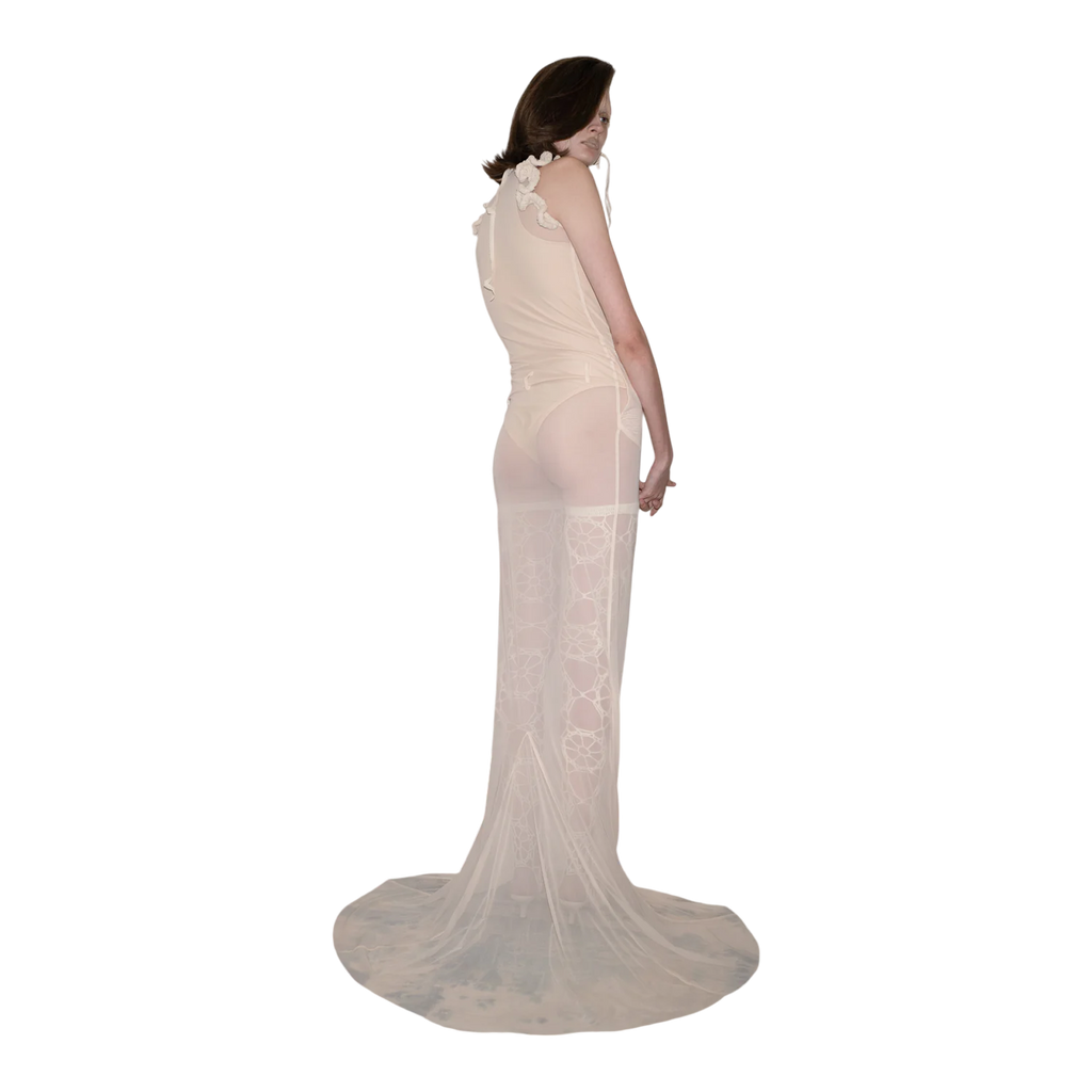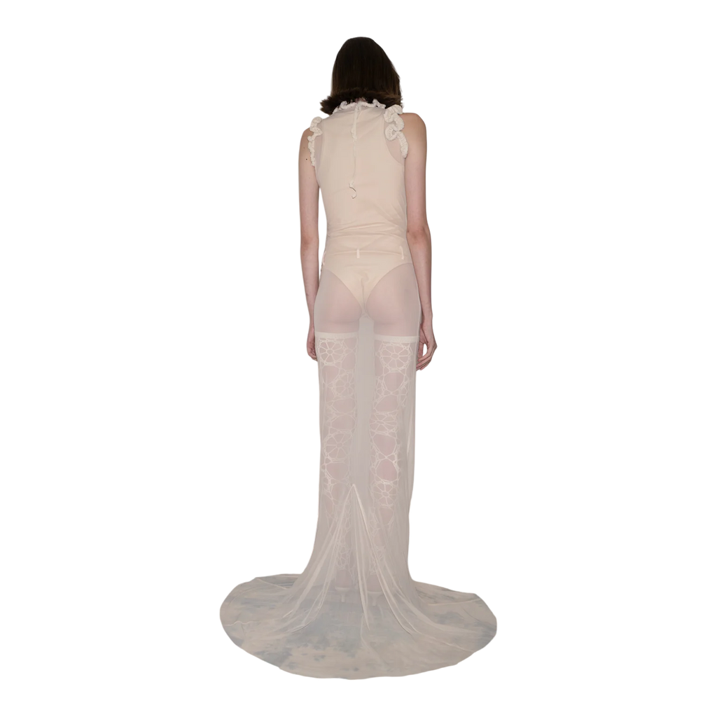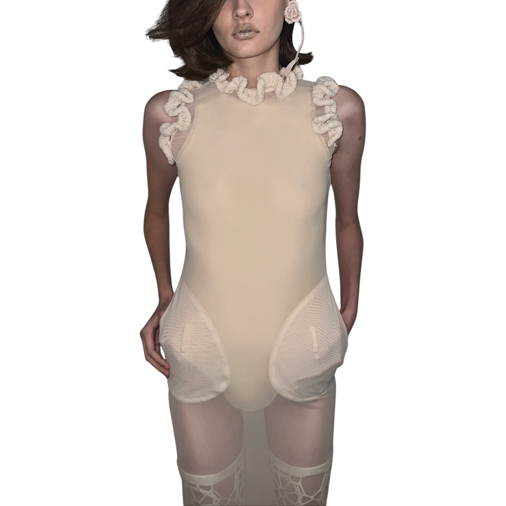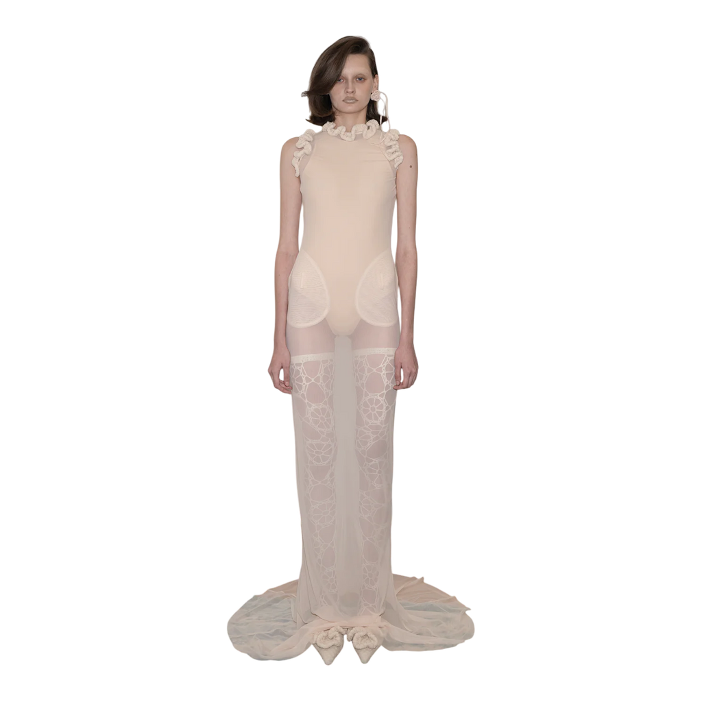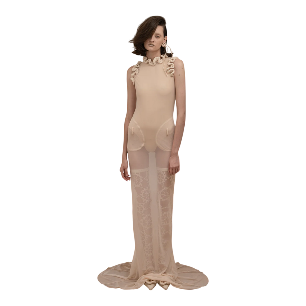 The Mesh Dress with Ruffle Details by Nastyamasha is designed with a blend of 100% polyester and ruffle details made from 80% polyester and 20% elastane, offering a bit of stretch for a comfortable fit.