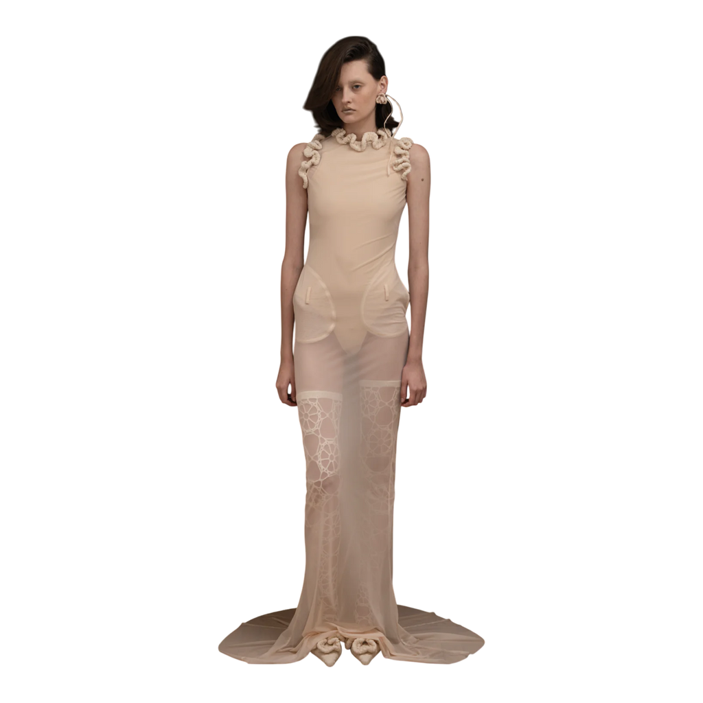 Nastyamasha is a fashion label founded in 2020 by twin sisters Anastasia and Maria Vaniushina. The brand focuses on designing wearable and comfortable garments that prioritize easy movement. Nastyamasha incorporates mesh fabrics and crocheted knitwear to offer a fresh take on conventional, often restrictive clothing. The collections feature structured corsets, textured miniskirts, and strapless tops, combining style with flexibility.