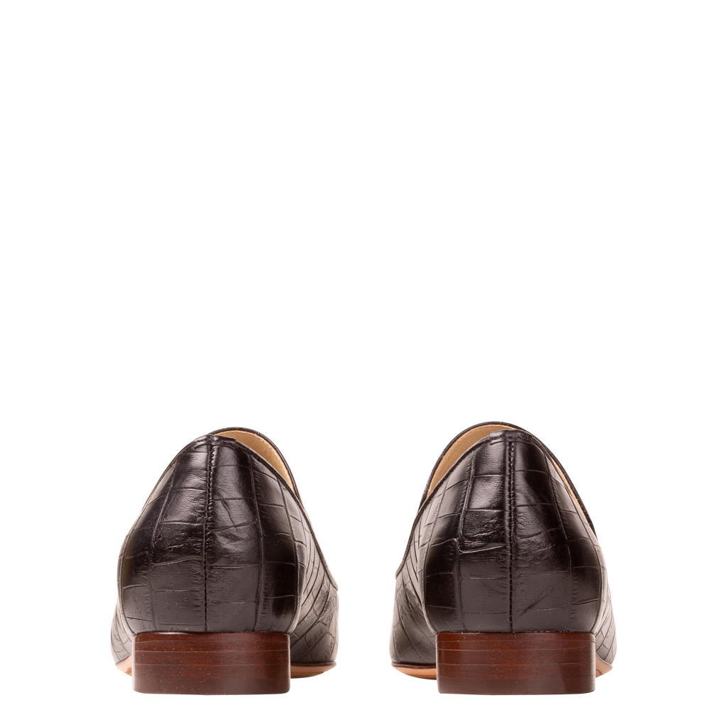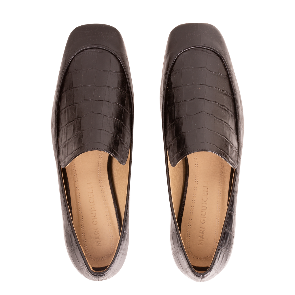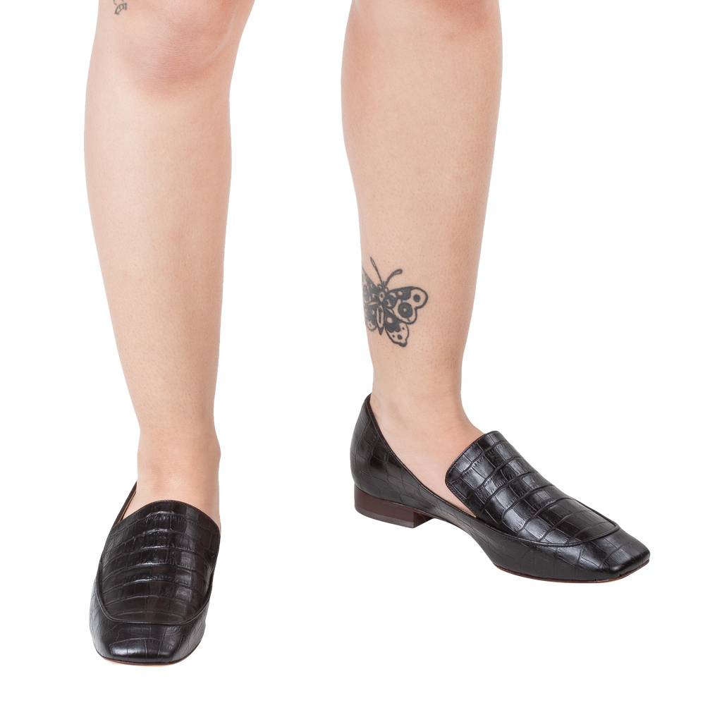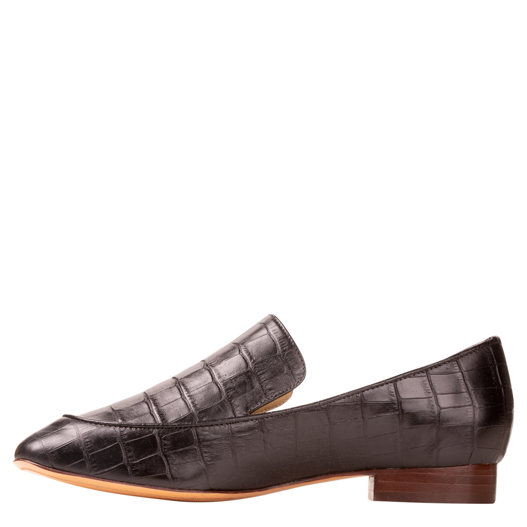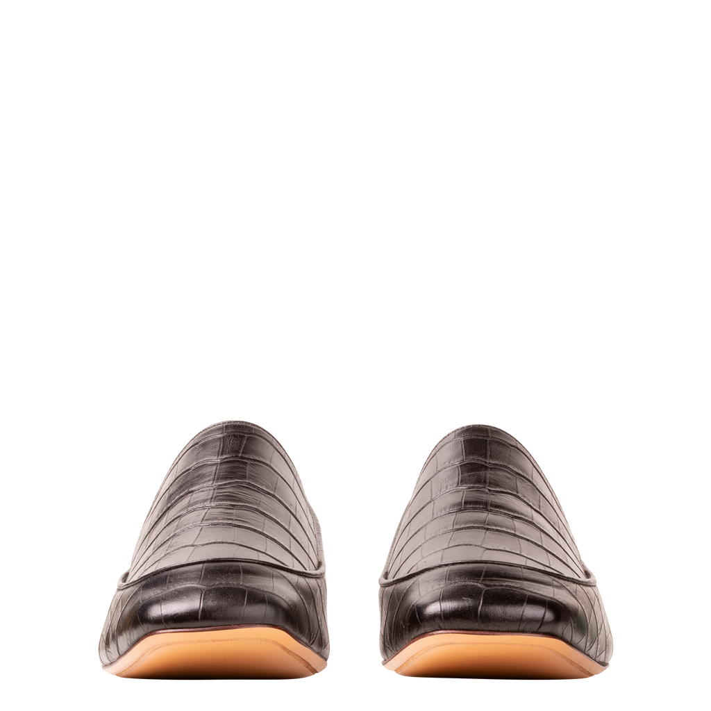 Black croco embossed leather with tonal stitching, square toe, padded footpad, leather Lining and leather sole. Fits true to size. Approx. 1/2" wooden heel.