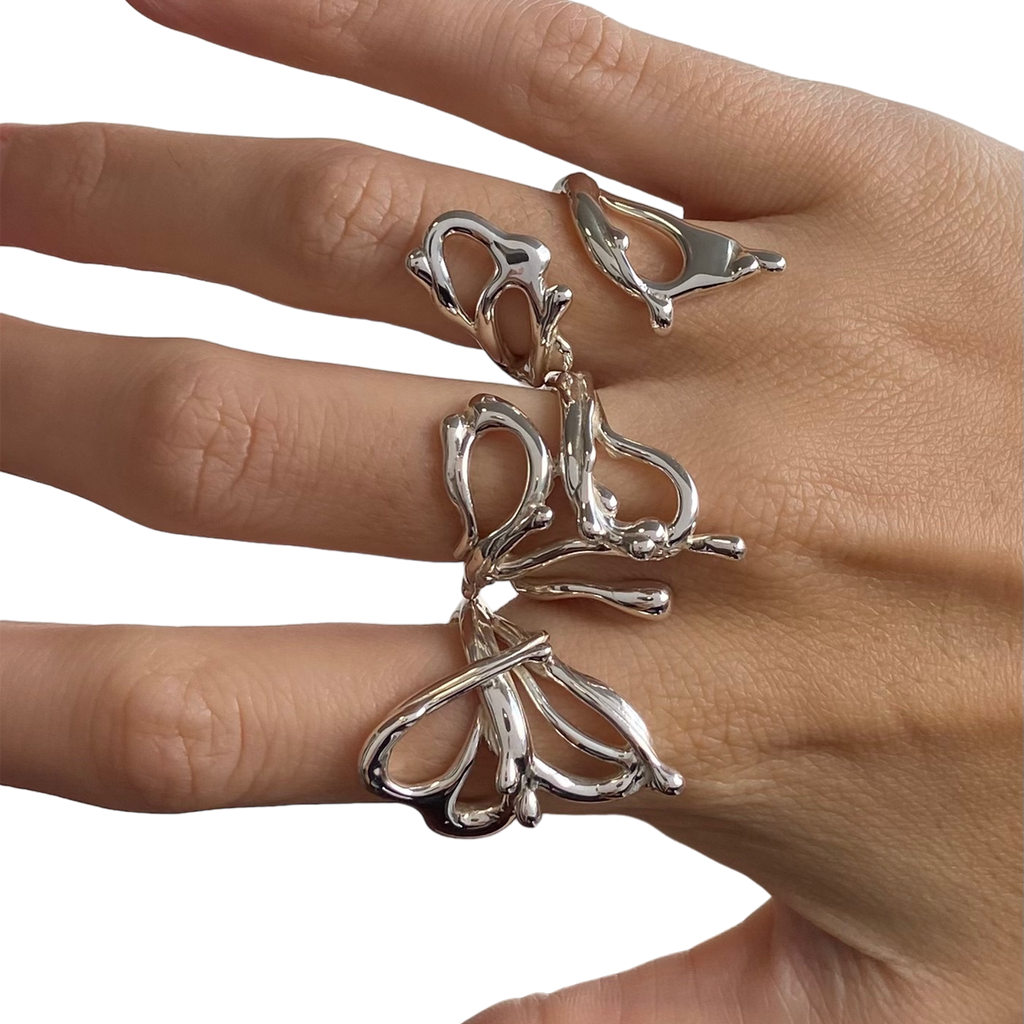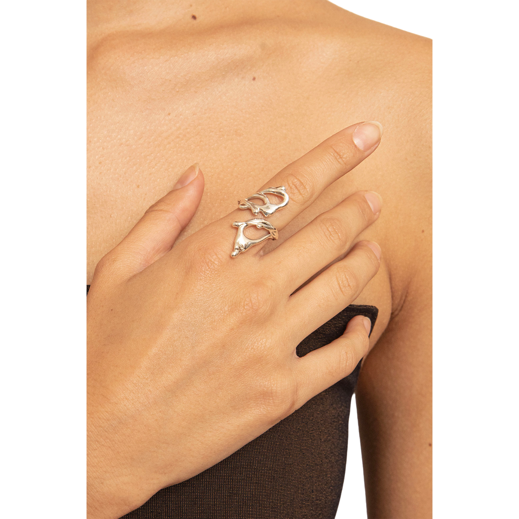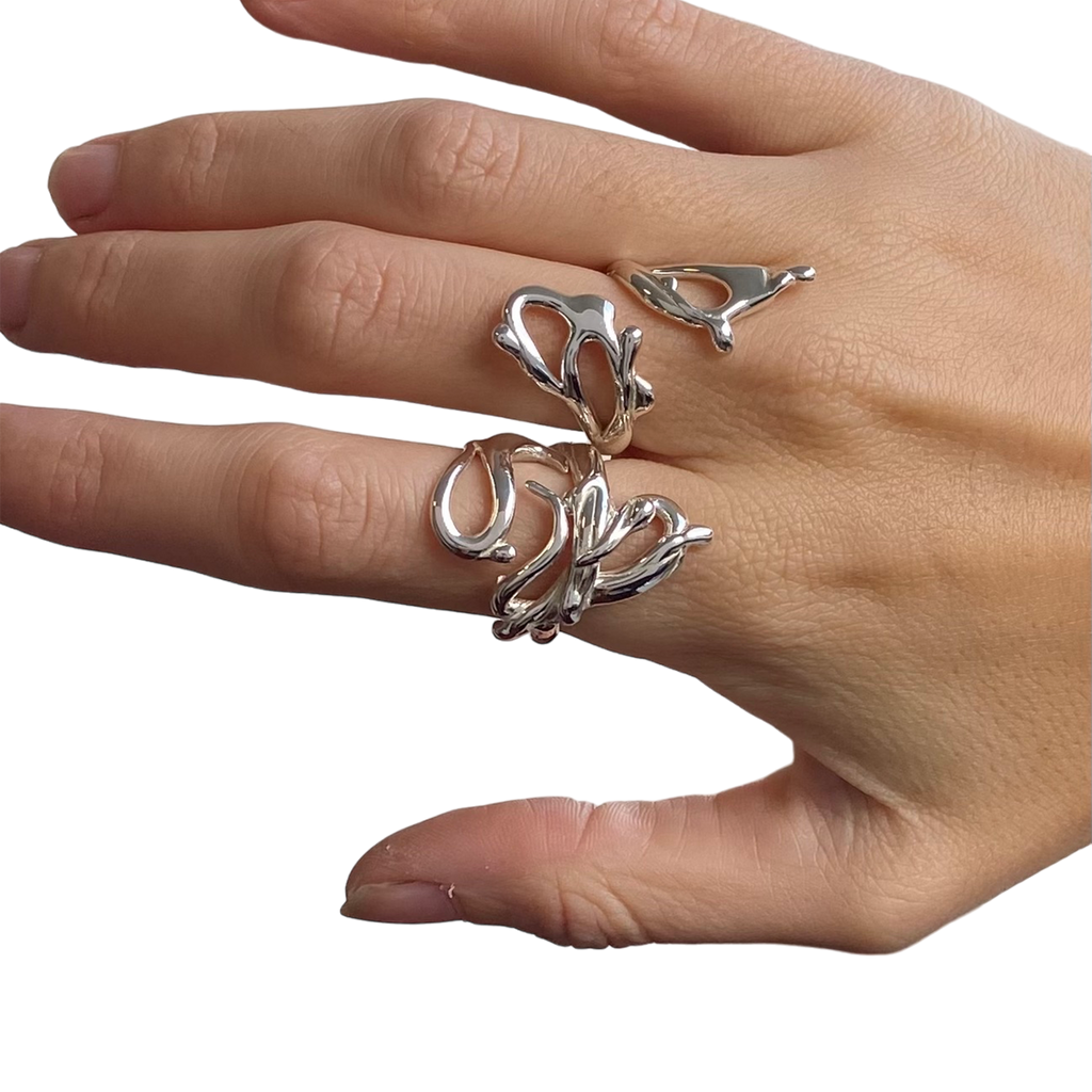 Freya Douglas Ferguson, a London-based sculptor and self-taught jeweler, blends her unique style, influenced by Biomorphism and sci-fi imagery. Collaborating with renowned designers and worn by artists like Caroline Polachek, her one-of-a-kind pieces are handmade in recycled sterling silver, emphasizing process and materiality.