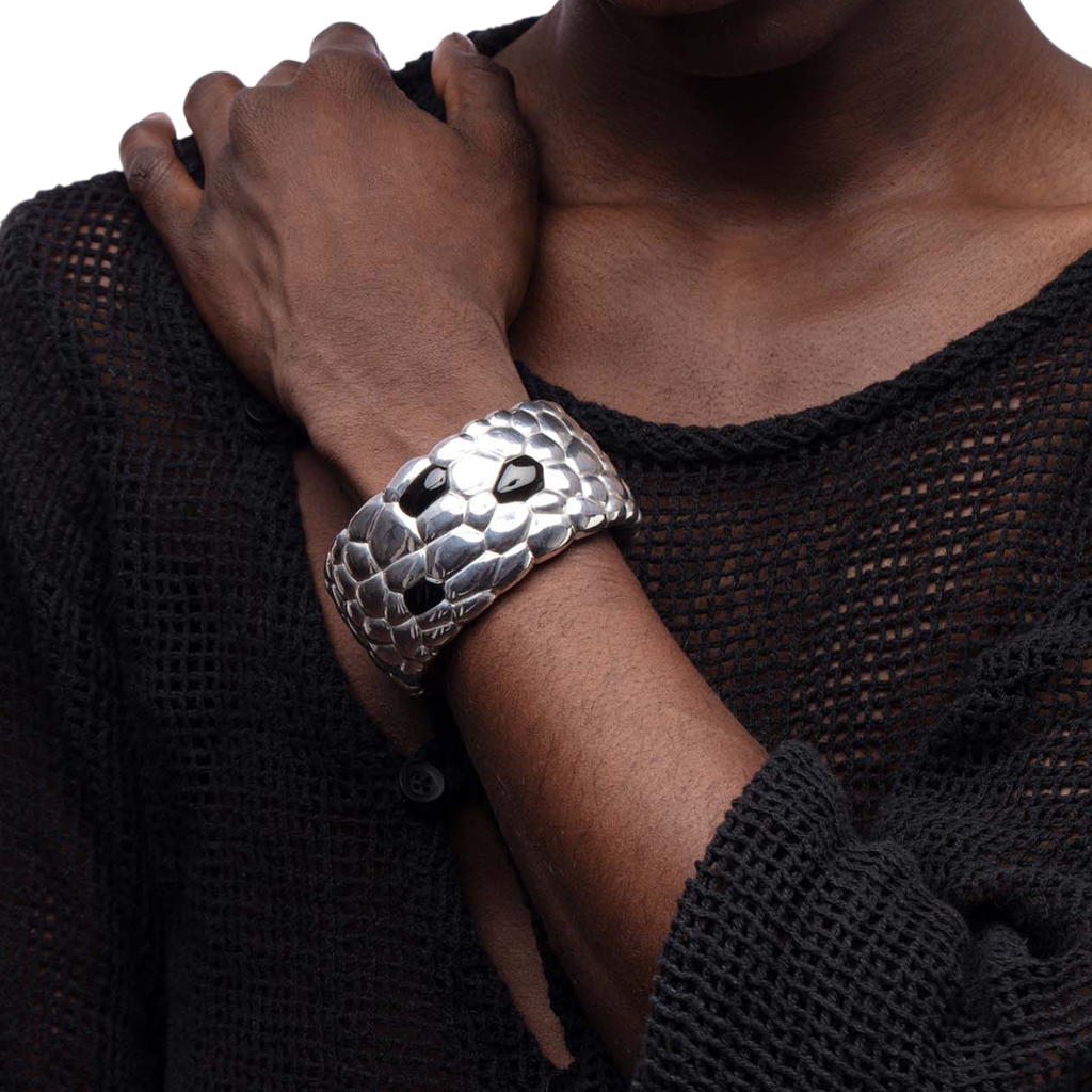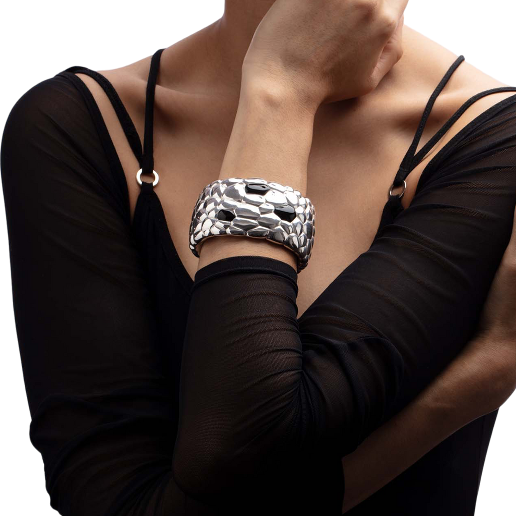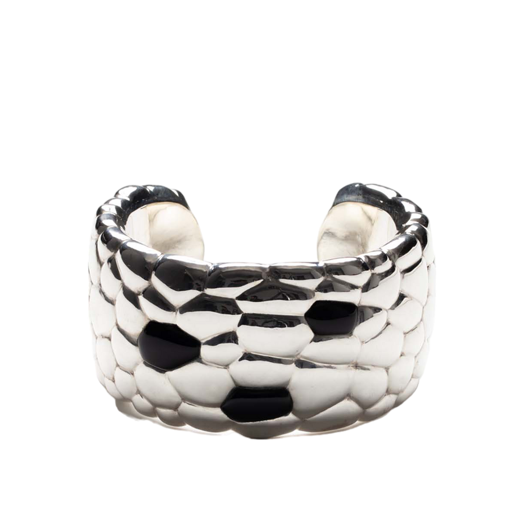 Bracelet based on the walls of Cusco, Peru, and on paYerns of organisaXon of maYer on a biological and cultural level. With three onyx stones inlaid. PaYerns: repXles, cells, natural bark, corn.