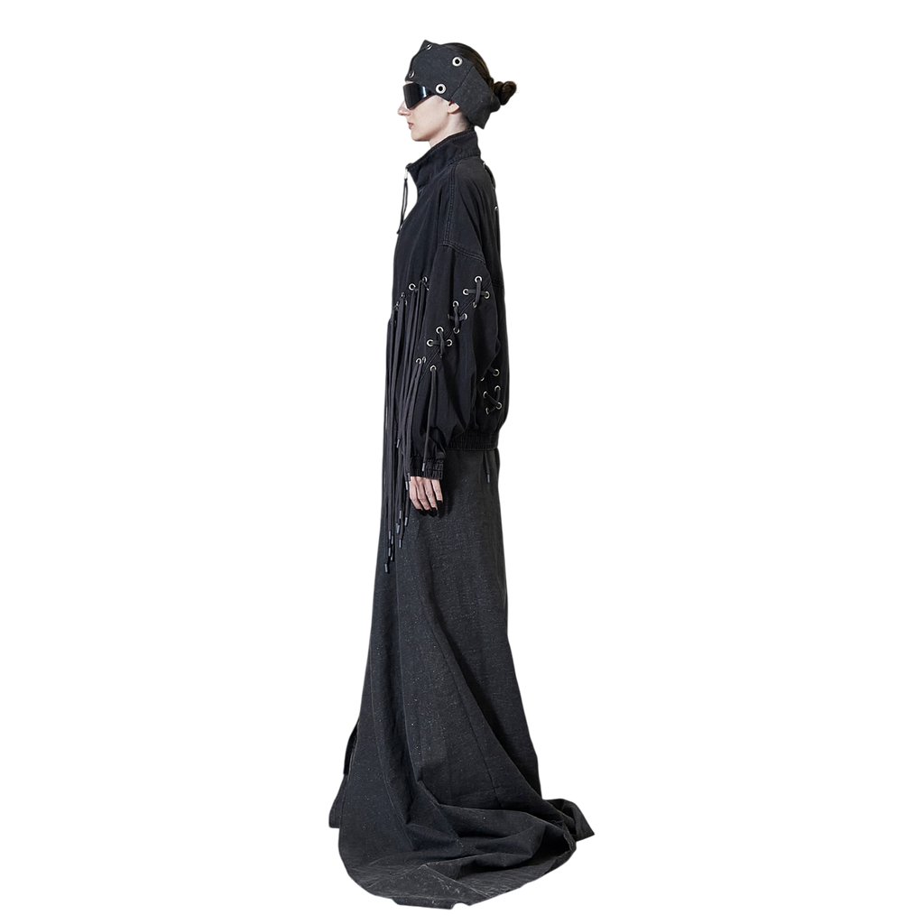 - Corset-style lacing on sleeves and back for a tailored yet bold look