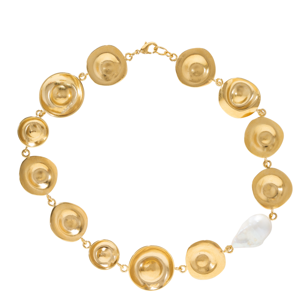 Various hand formed coins inspired by seashell and dried flower shapes frame a disrupting baroque pearl. A neck bone framing ‘collar’ style necklace that sits asymmetrically with the pearl on the right side of the neck. Fastened with a lobster claw and jump ring options for sizing. Each pearl used for this style is one of a kind and ranges in size, thickness and shades of white.