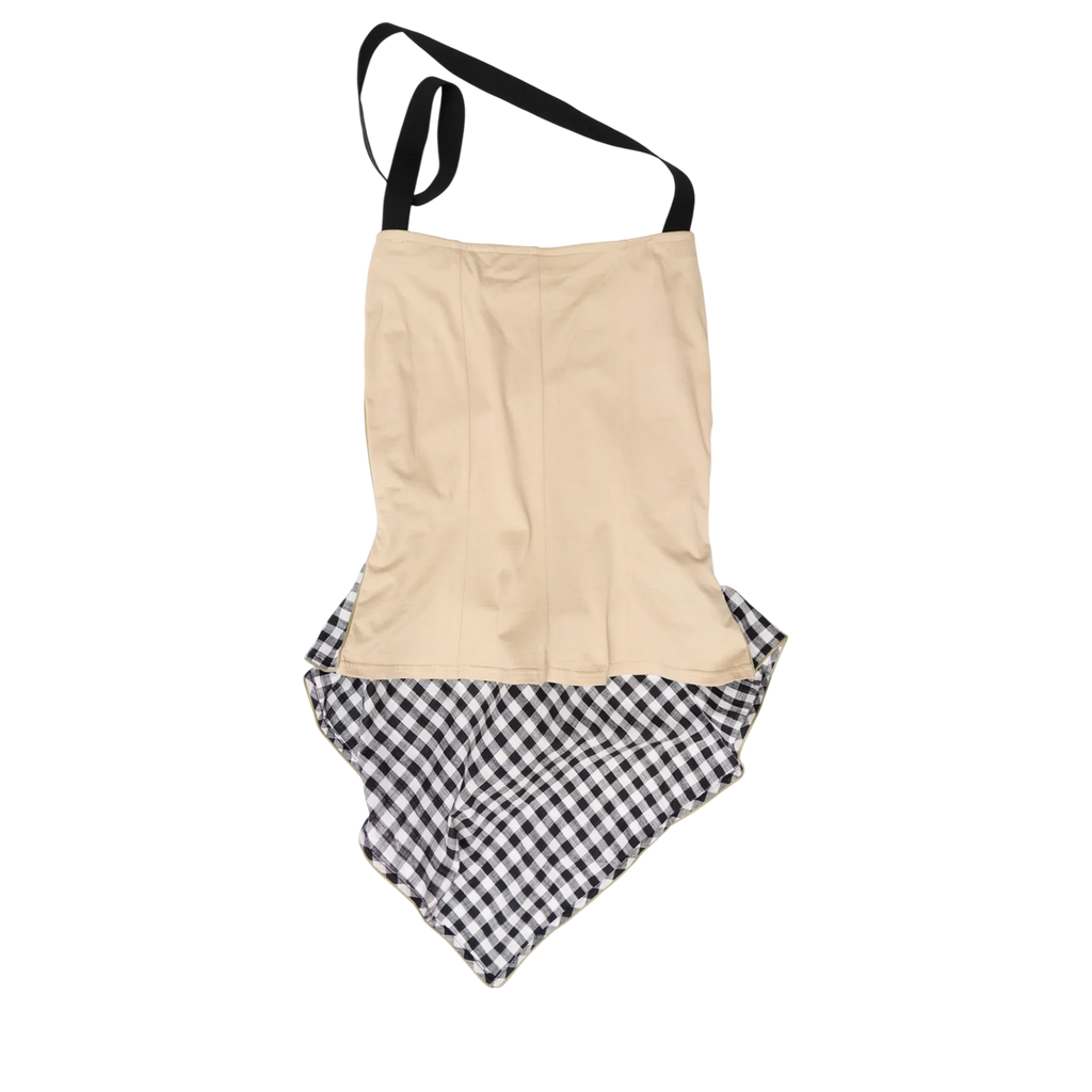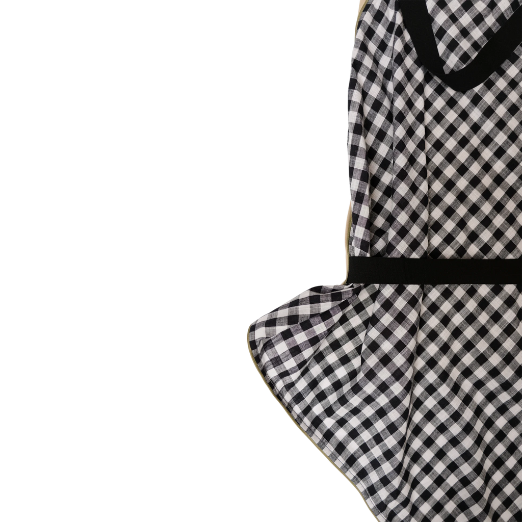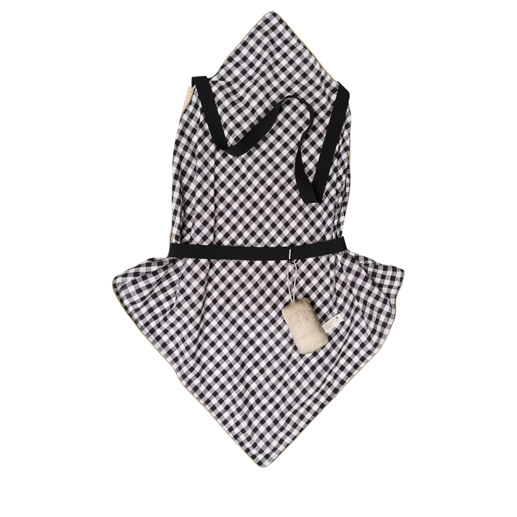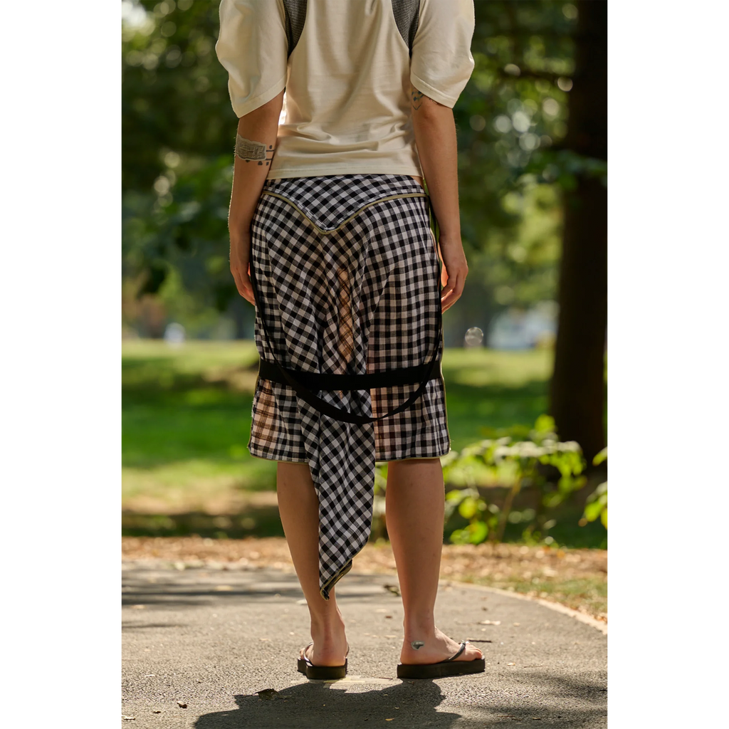 Hybrid skirt with a cotton jersey front panel and a picnic blanket-style cotton gingham back. Designed with attached suspenders that can be worn up or down. Comes with the stone plushies.