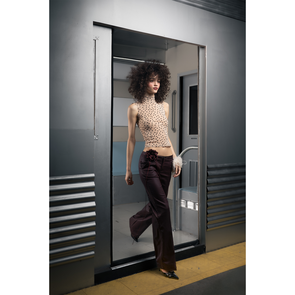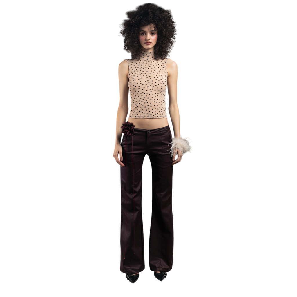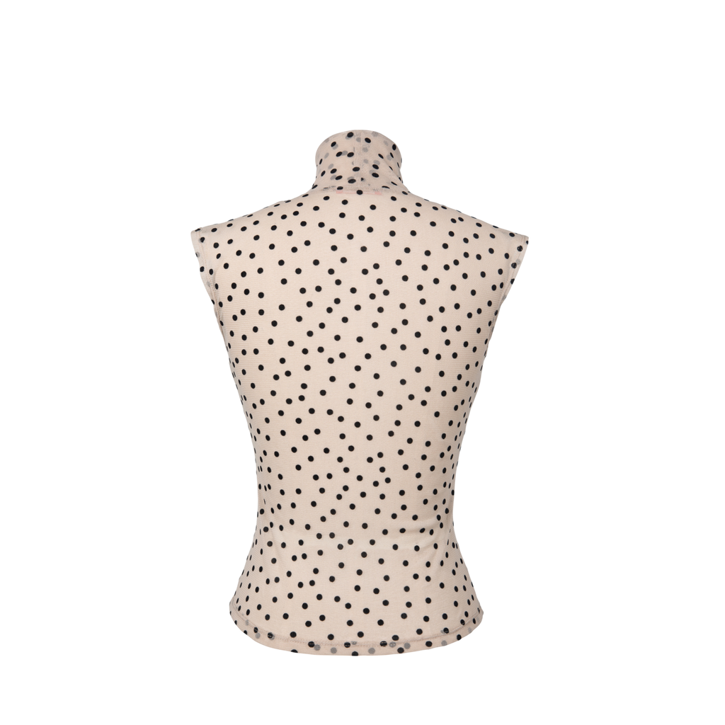 A nude mesh tank featuring all-over flocked velvet polka dots.