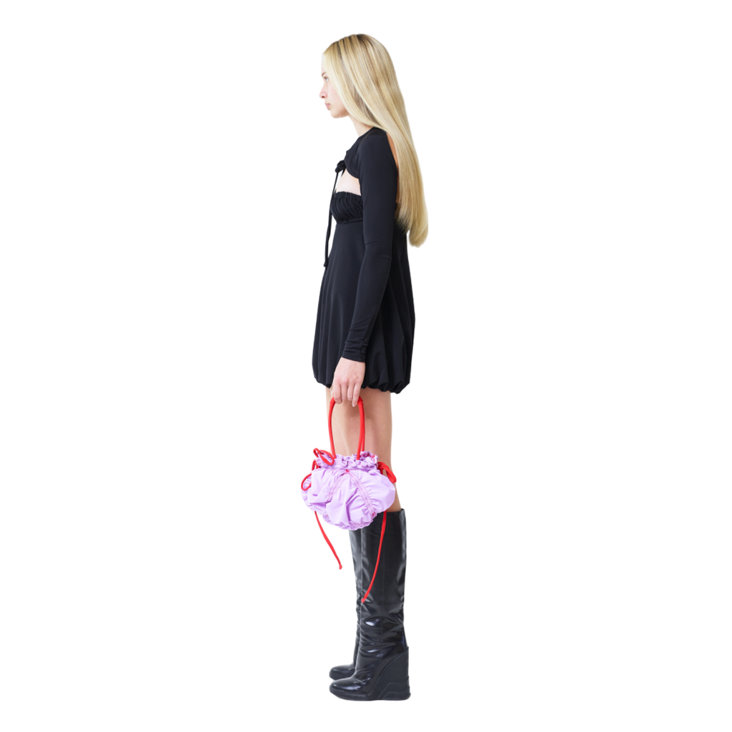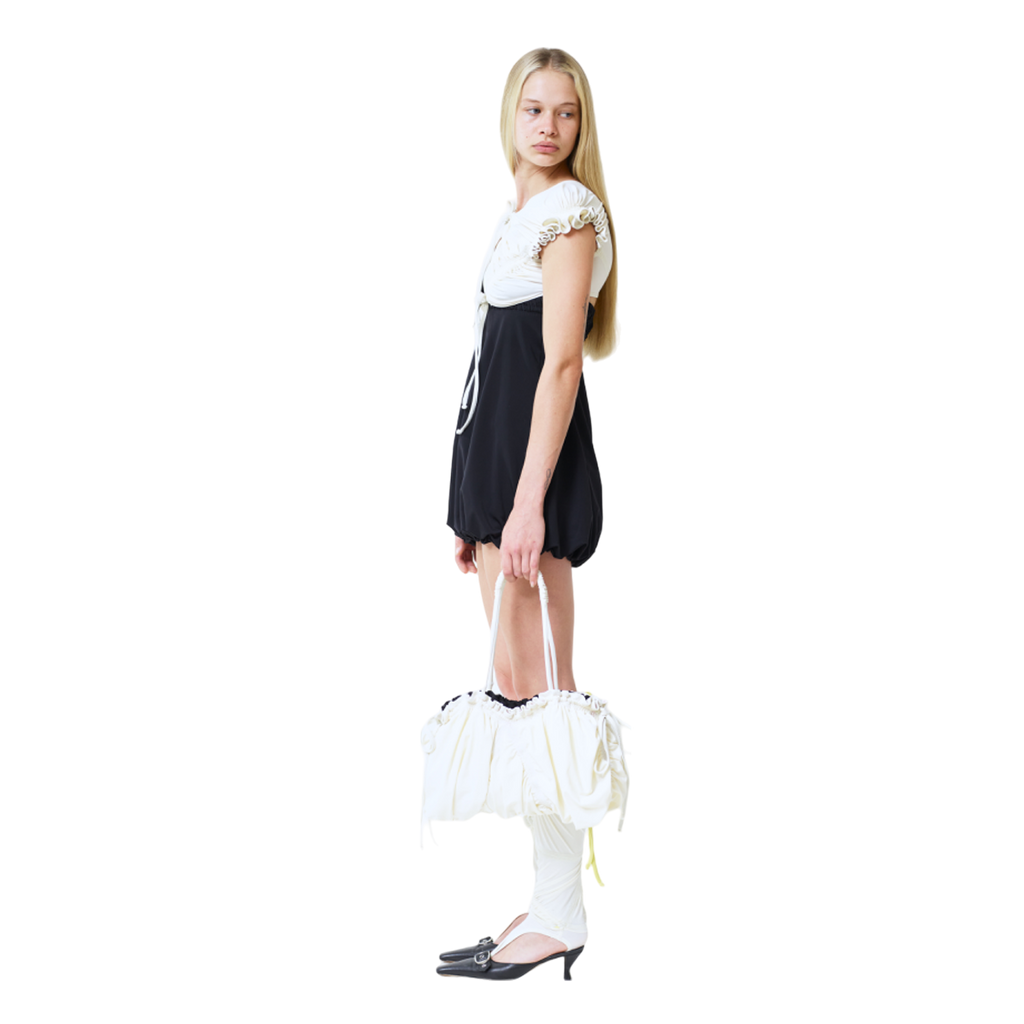 Strapless bubble dress , featuring bustier-style ruched sweetheart neckline, constructed with signature zig zag inseam. Lined skirt. Due to the nature of construction, the skirt does not ride up from movement.