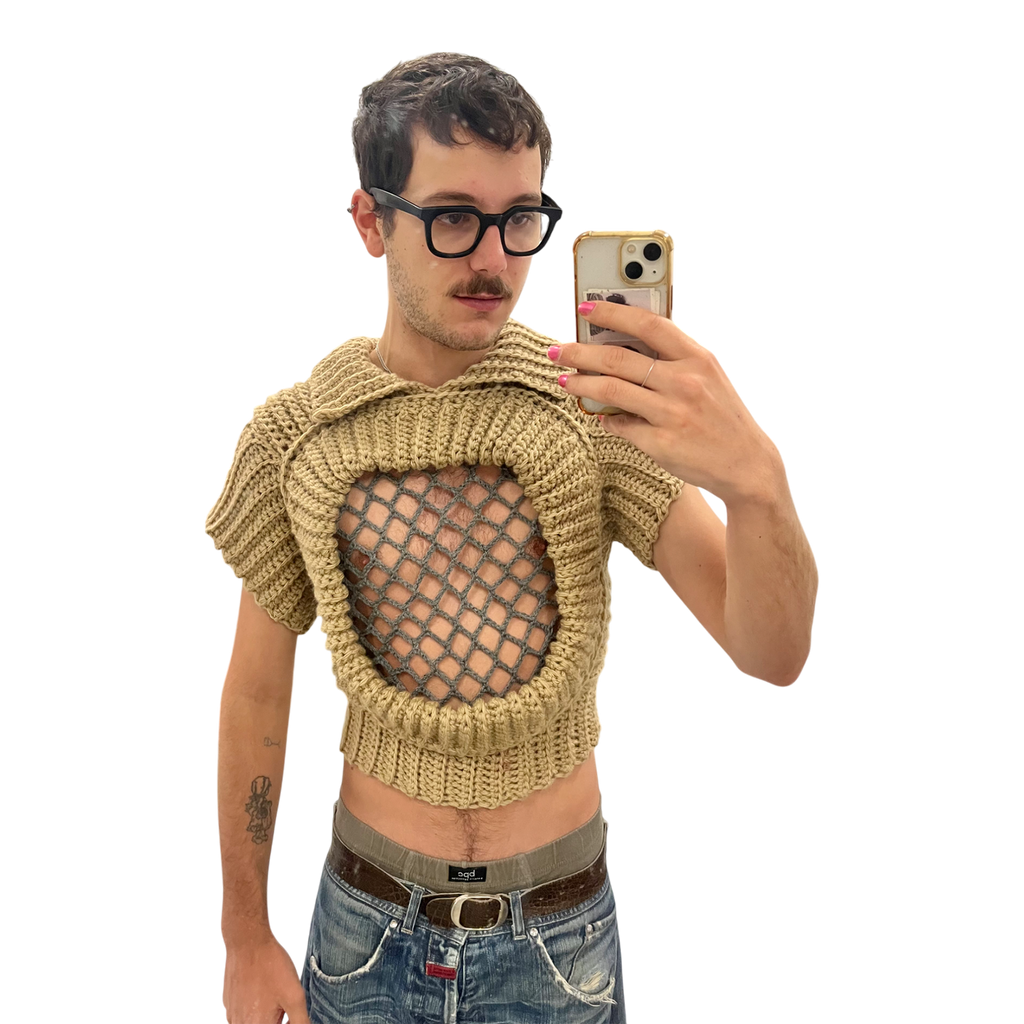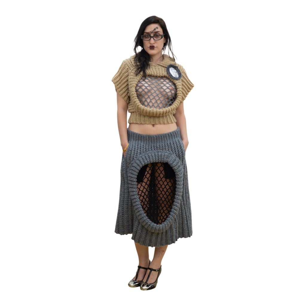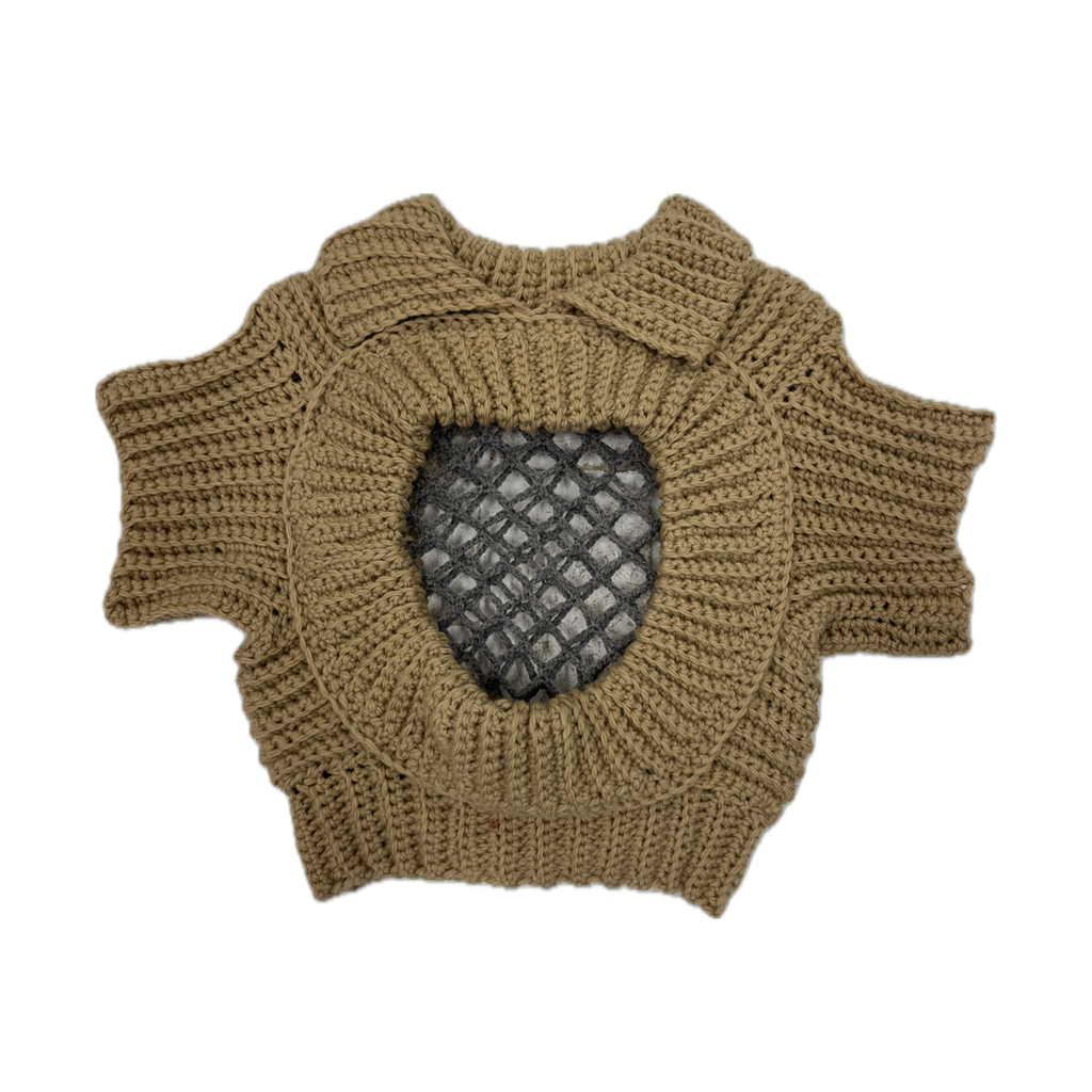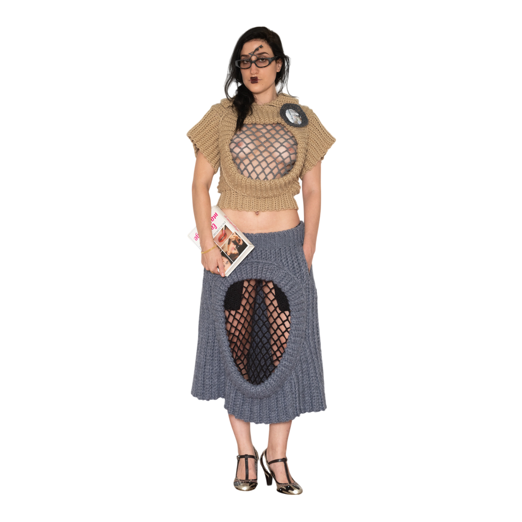 Lewis is a Paris-based French designer specializing in crochet, a technique he likens to "drawing clothes." Embracing spontaneity, he allows the creation process to guide him, resulting in playful and unique pieces. Inspired by the uncanny facets of personality, the transition from adolescence to adulthood, and our connection to the domestic, his recent collection, La Coiffeuse, explored the intimate world of dressing tables and their contents.