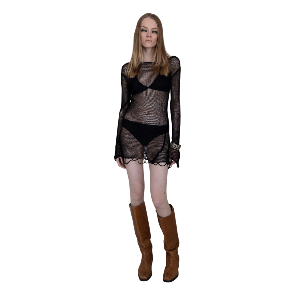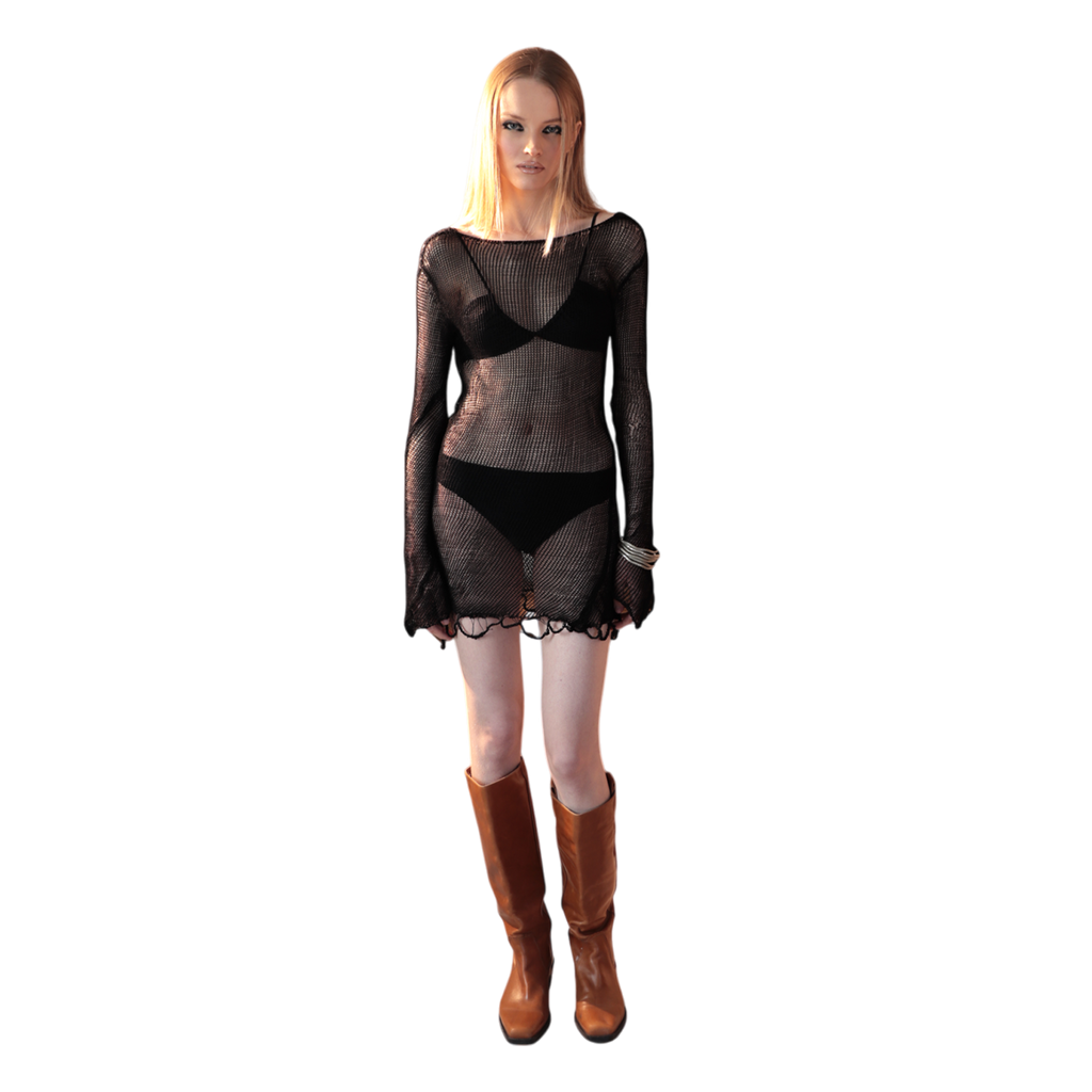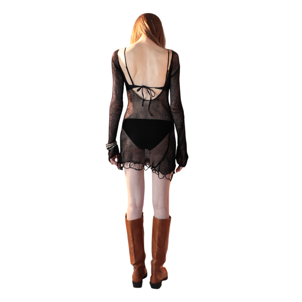 This dress is crafted with a knitting machine, maintaining a loose, carefree aesthetic—a signature of our brand. The asymmetric hemline features unique, hand-knitted detailing inspired by nature, with manually adjusted holes for a distinctive look.
