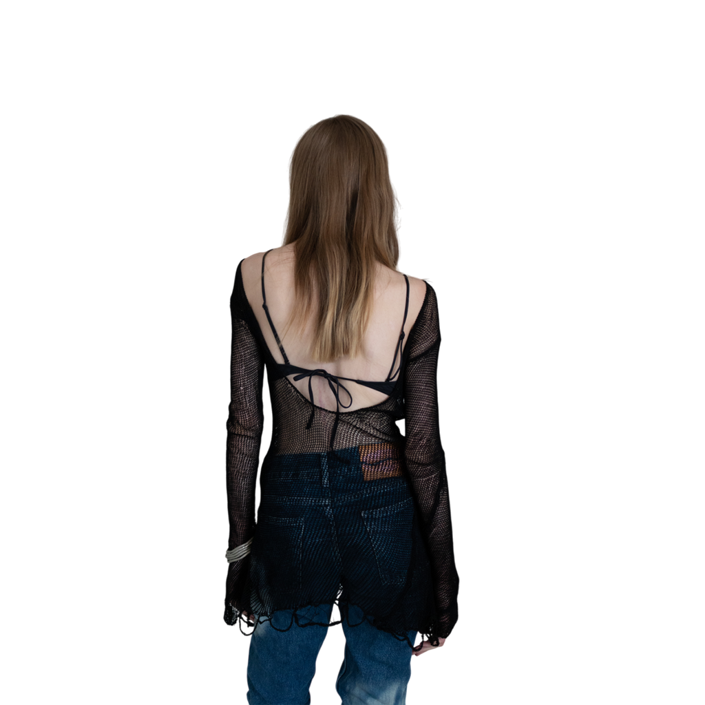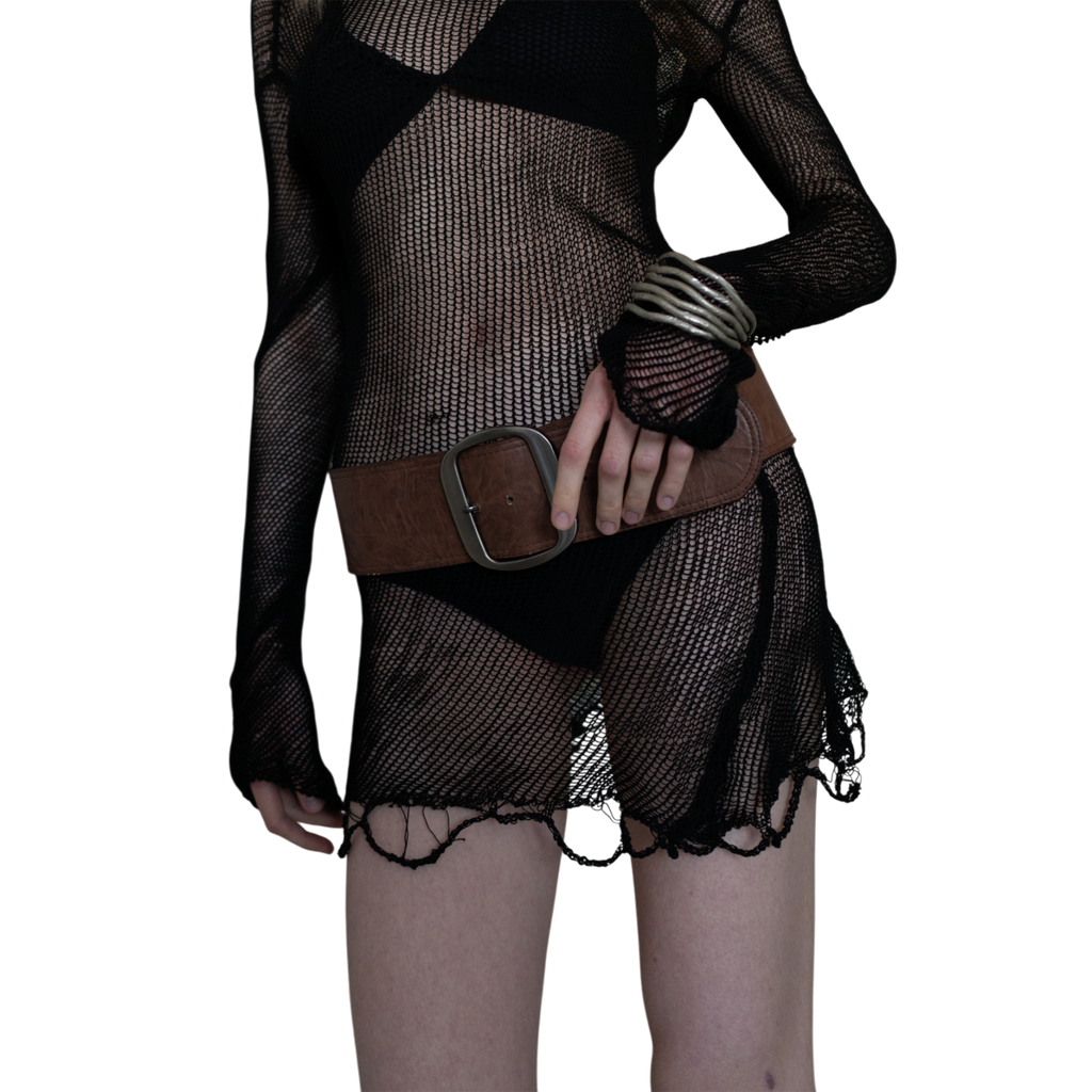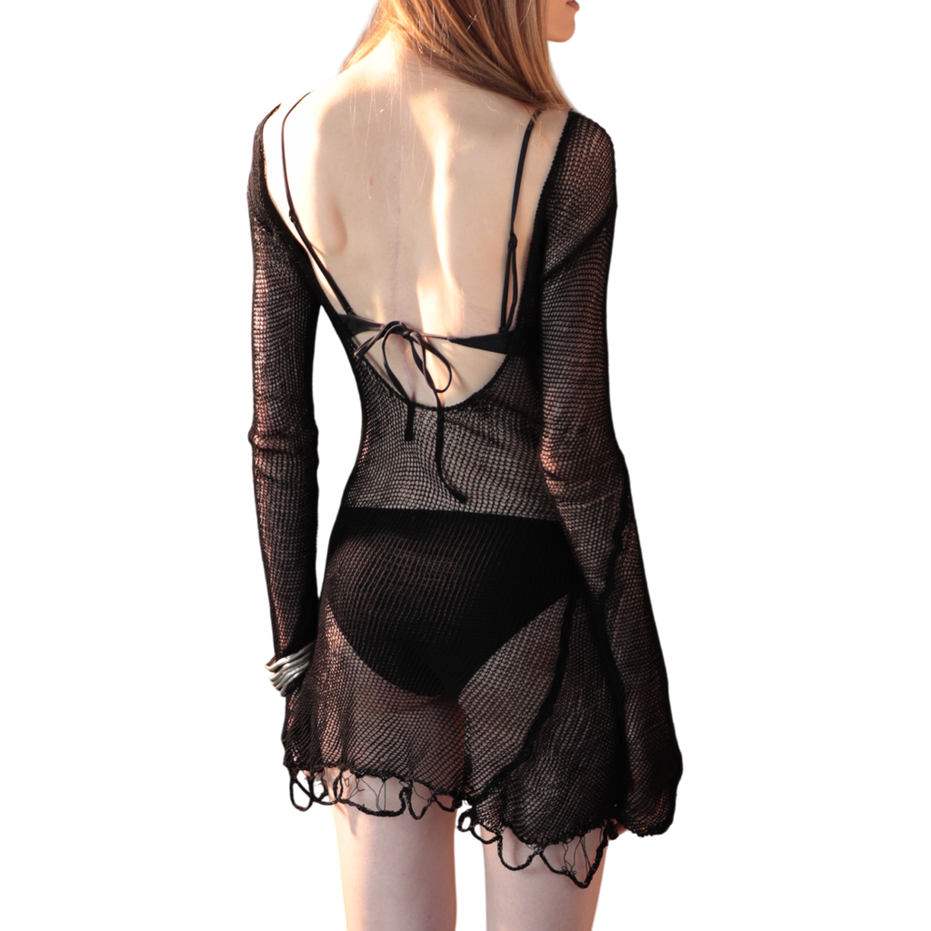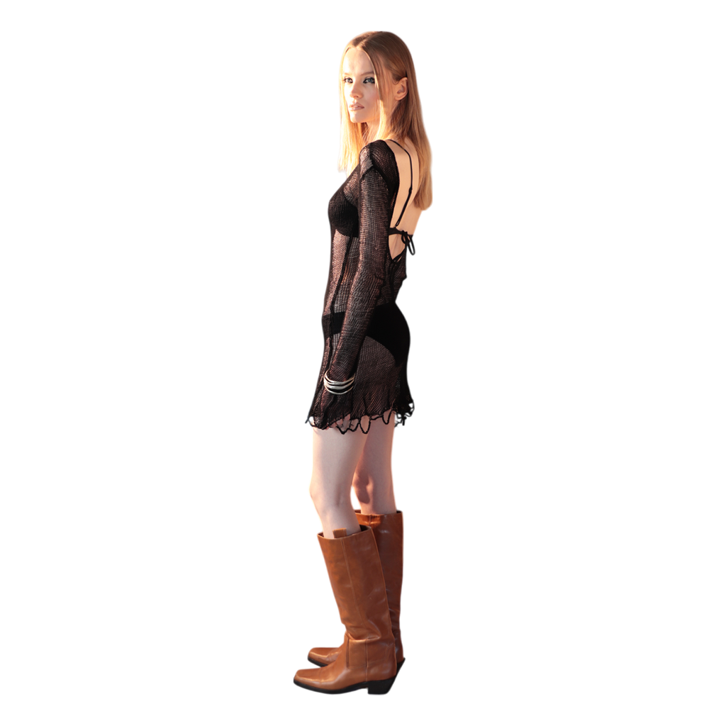 This dress is crafted with a knitting machine, maintaining a loose, carefree aesthetic—a signature of our brand. The asymmetric hemline features unique, hand-knitted detailing inspired by nature, with manually adjusted holes for a distinctive look.