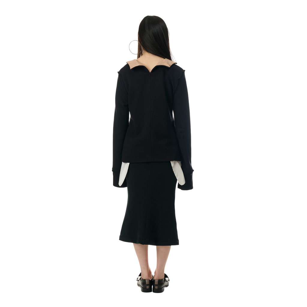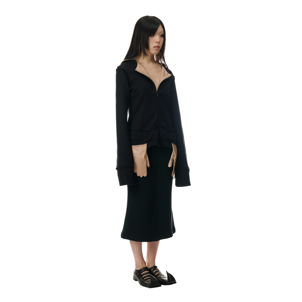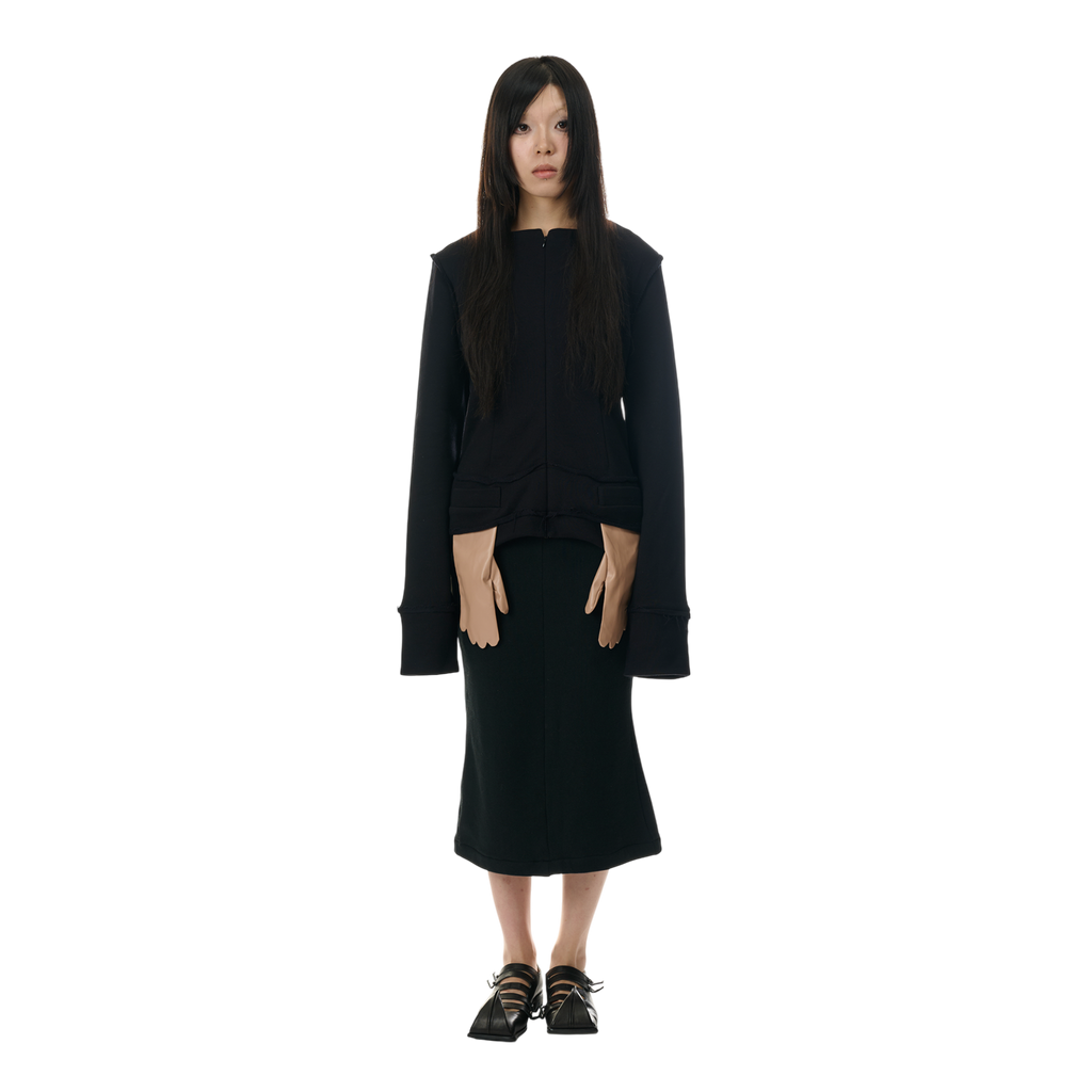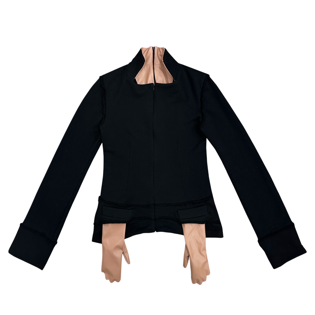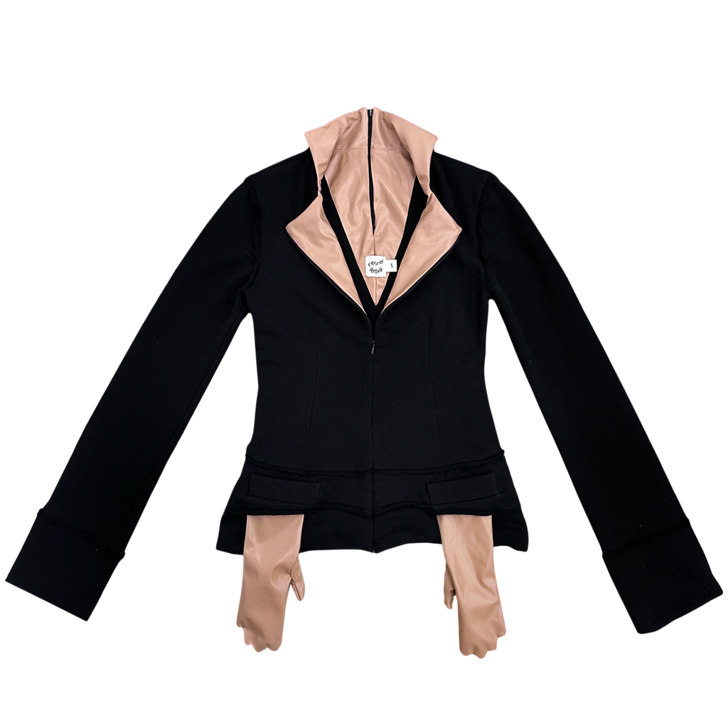 The 100% cotton Sweat Blazer features zippers on both the front and back, allowing customization of the faux leather suit lapels for a versatile look. The glove-shaped pockets serve both as a functional and styling detail.