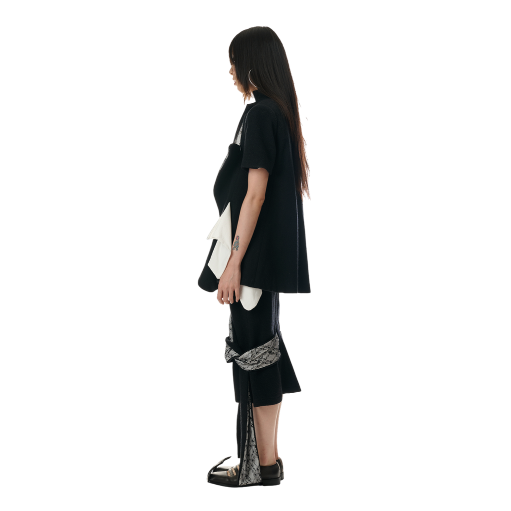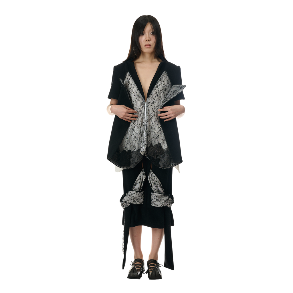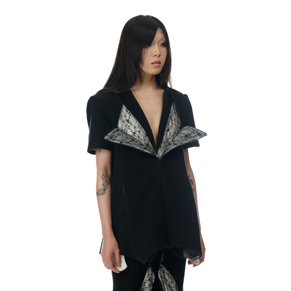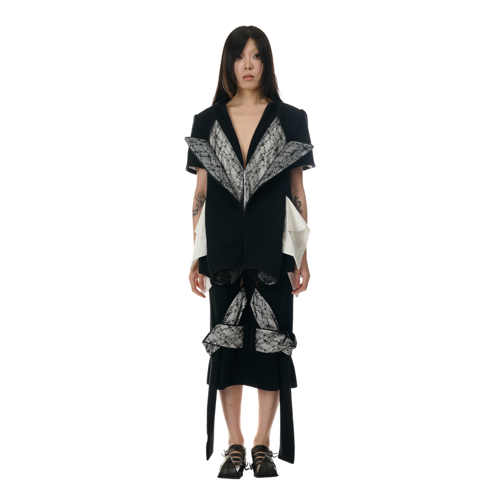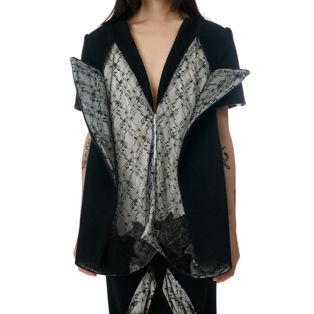 Made of 75% wool and 25% polyester, the Tall House Short Sleeve Jacket features open front panels with the "Tall House" pattern. It can be worn closed for a formal look or opened to reveal the lace lining for a more casual style. The extra-large white pockets add both functionality and contrast to the design.