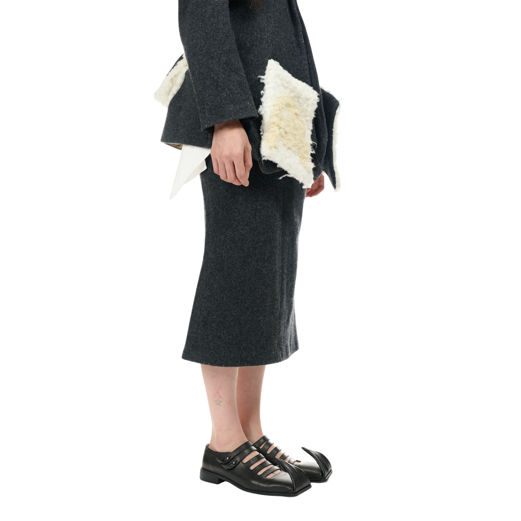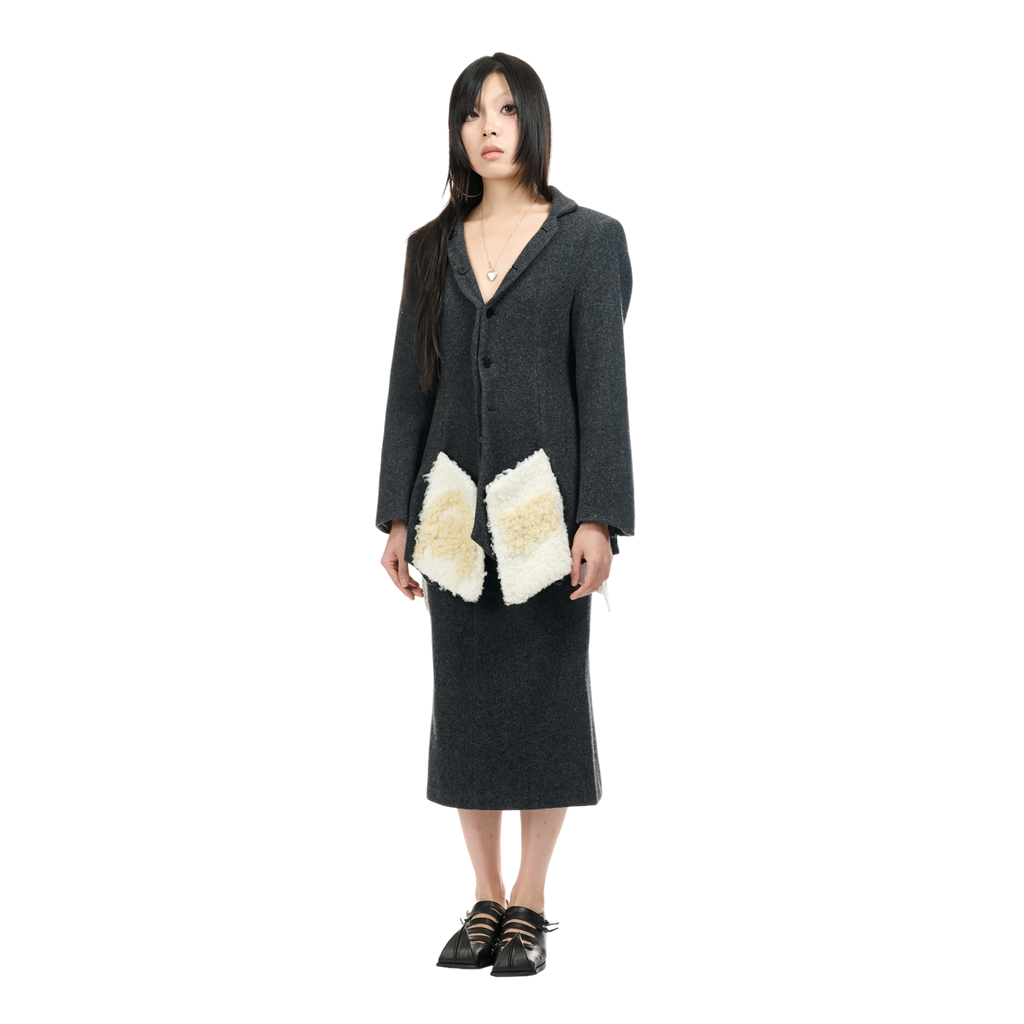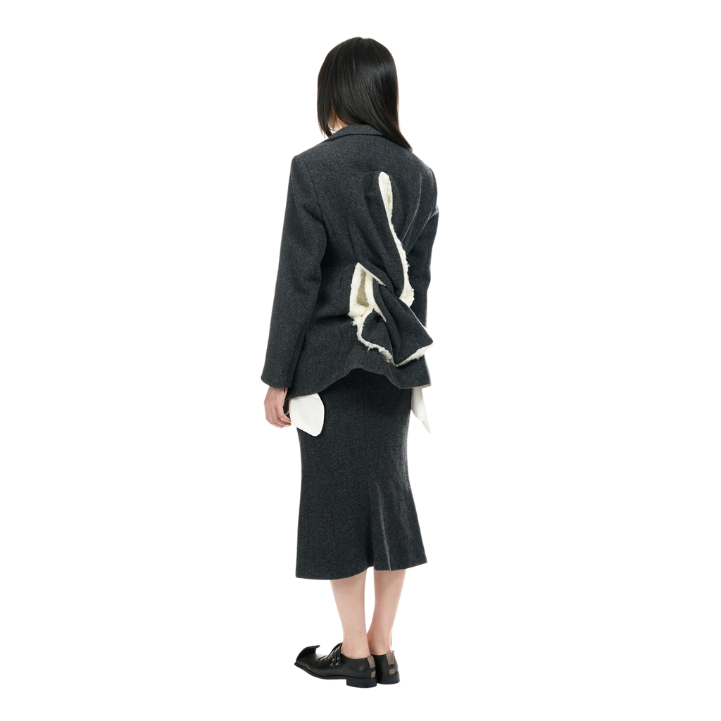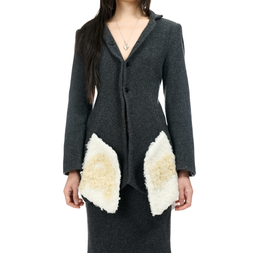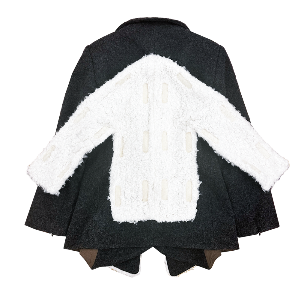 The Snow House Blazer Jacket, crafted from 75% wool and 25% polyester, features an open back panel made of faux lamb fur, offering a bold contrast to the structured front. The back panel includes a velcro closure, which can be fastened for a classic blazer silhouette or left open to showcase the "snow house" effect. The velcro also adds an adjustable element when the panels are twisted, allowing plushies or other creative additions to be attached.