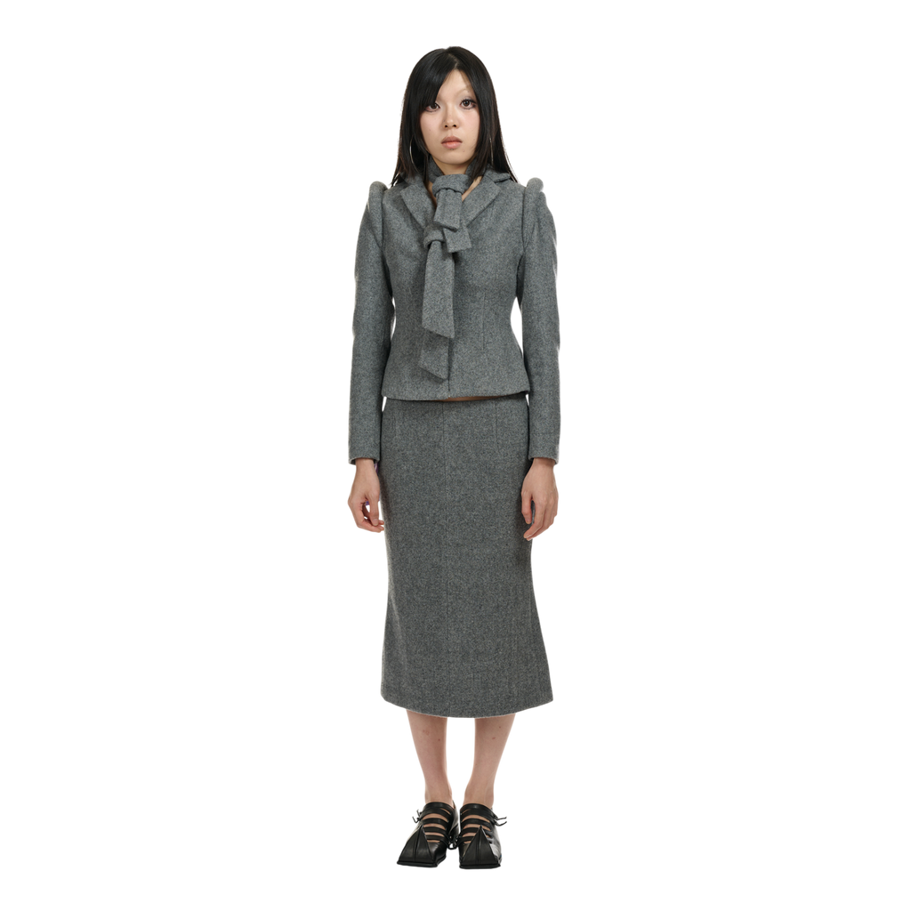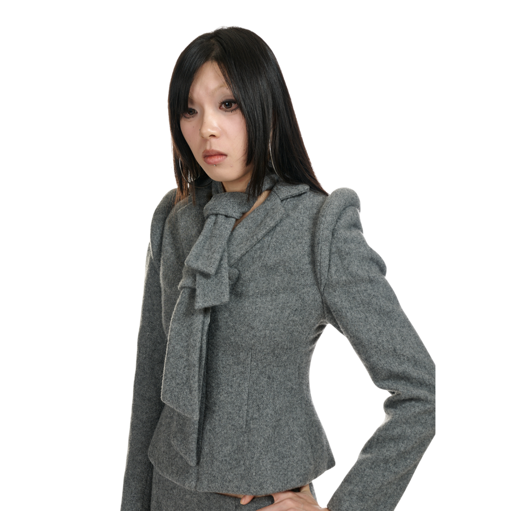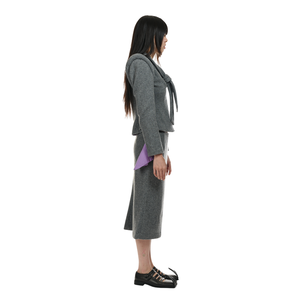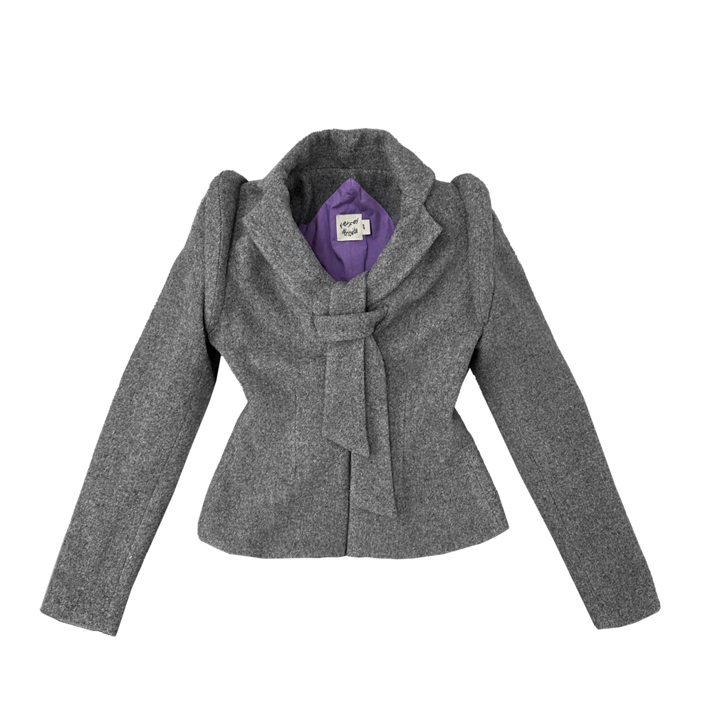 This 75% wool 25% polyester blazer features sculpted shoulders and a tie collar, offering a structured yet refined look. The tailored fit and soft wool fabric provide comfort and versatility, while the contrasting purple lining adds a subtle detail. Suitable for both professional and casual settings. The blazer comes with the Extra Awkward Tie, adding a unique and anti-professional twist to the design.