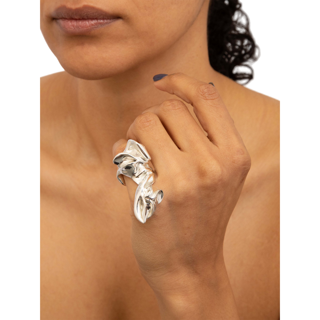 Freya Douglas Ferguson, a London-based sculptor and self-taught jeweler, blends her unique style, influenced by Biomorphism and sci-fi imagery. Collaborating with renowned designers and worn by artists like Caroline Polachek, her one-of-a-kind pieces are handmade in recycled sterling silver, emphasizing process and materiality.