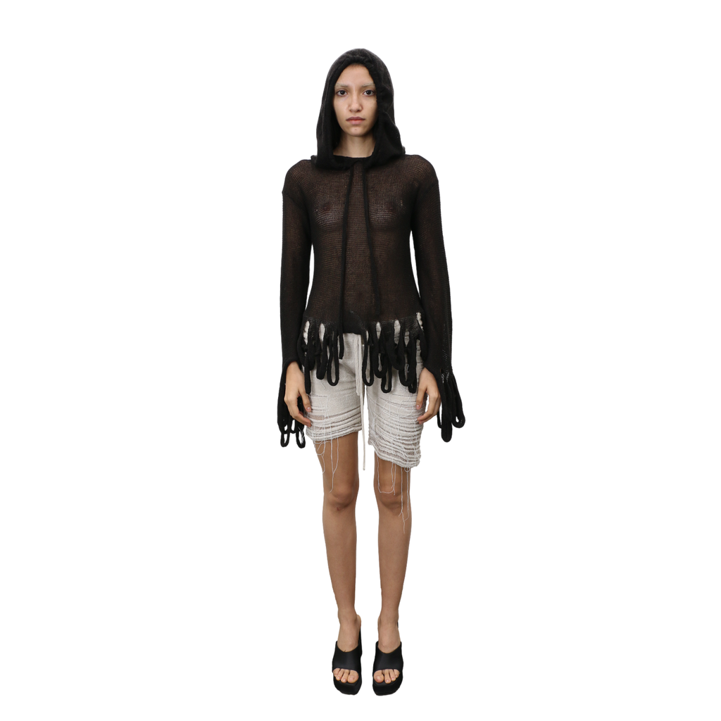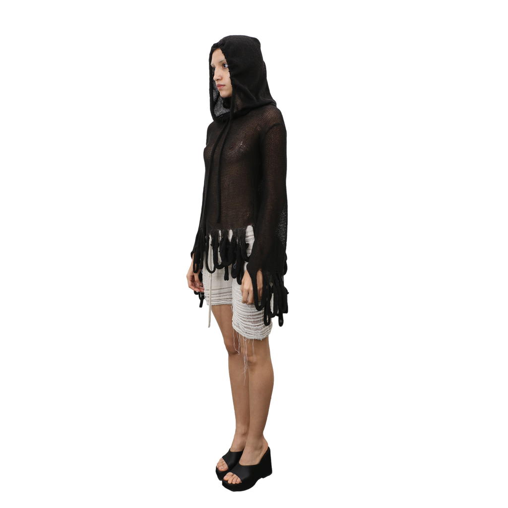 Knitted semi-sheer hoodie with loop details on bottom of sleeve and body