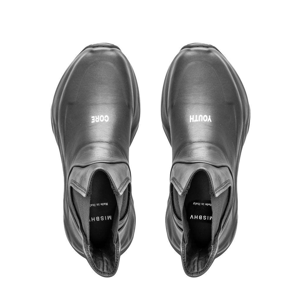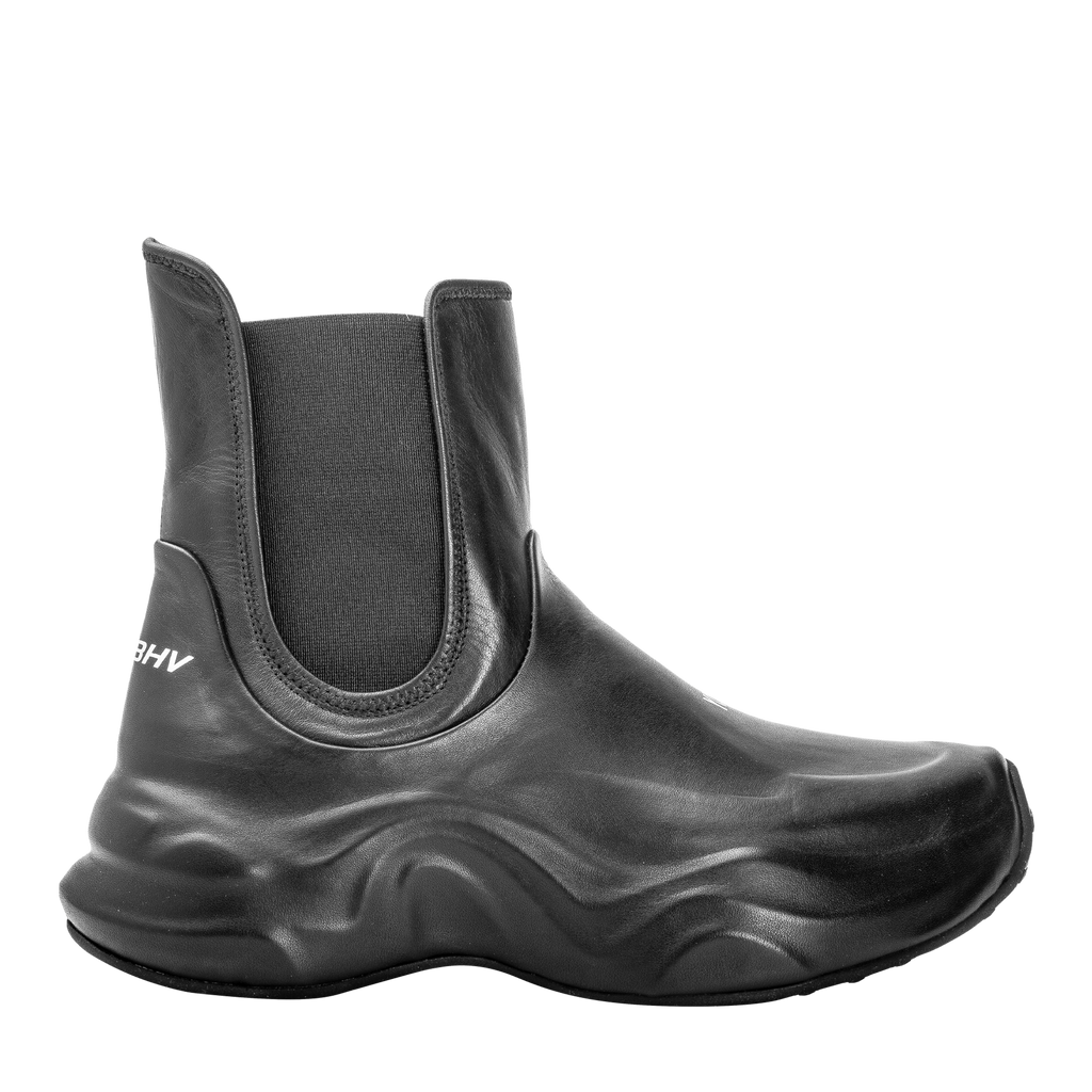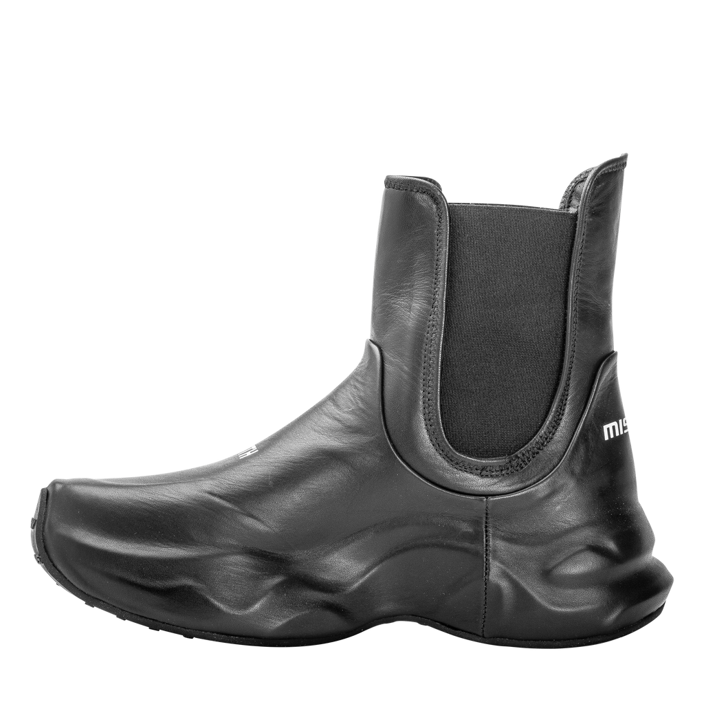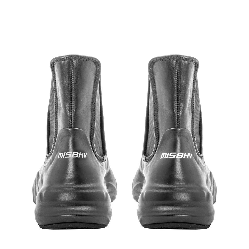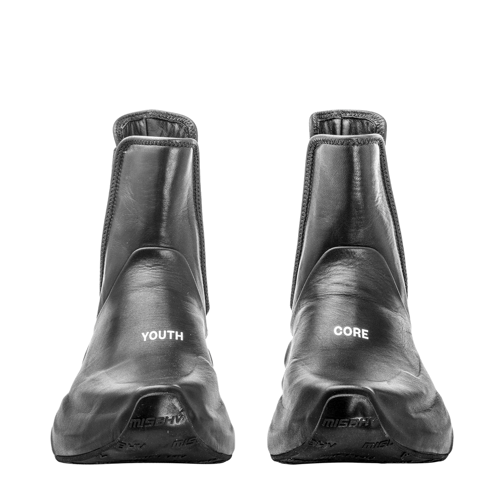 Black leather Youth Core High Moon boots from Misbhv featuring an almond toe, a slogan detail, elasticated side panels, a printed logo to the rear and a rubber sole.