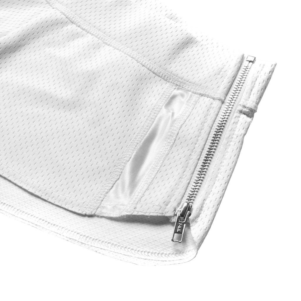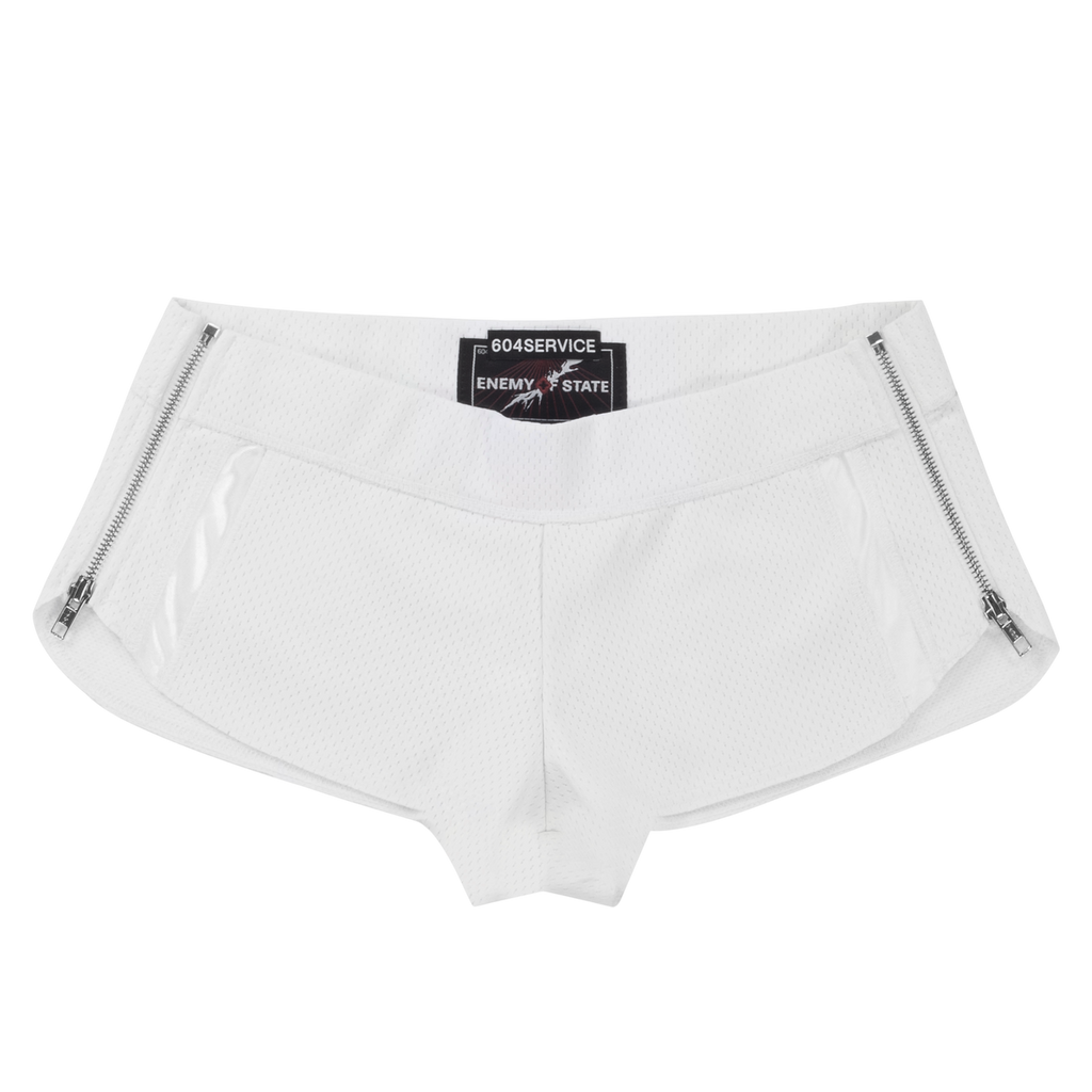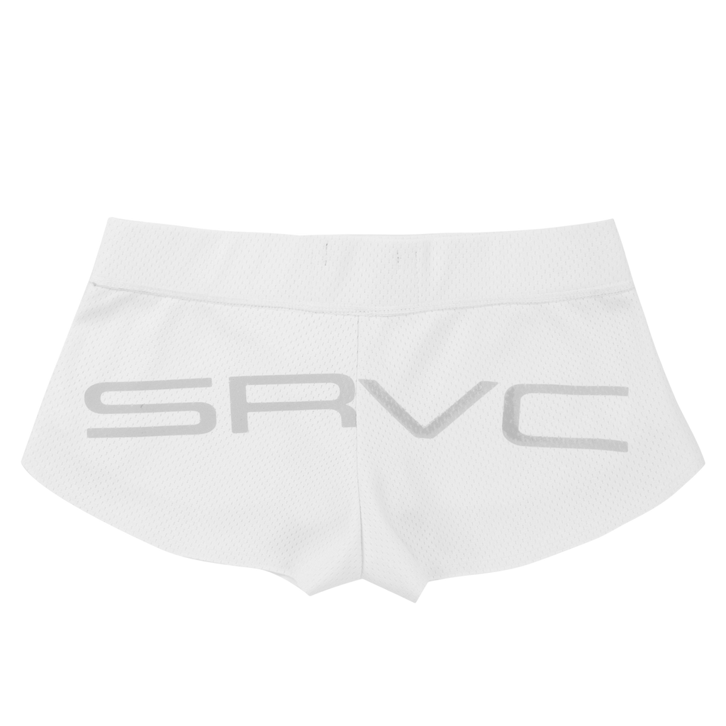 A regular-fit short designed for both style and comfort. Features an inner waist drawstring for adjustable sizing and a side zipper detail for added edge. The back is accented with a reflective 'SRVC' print for visibility and a signature touch.