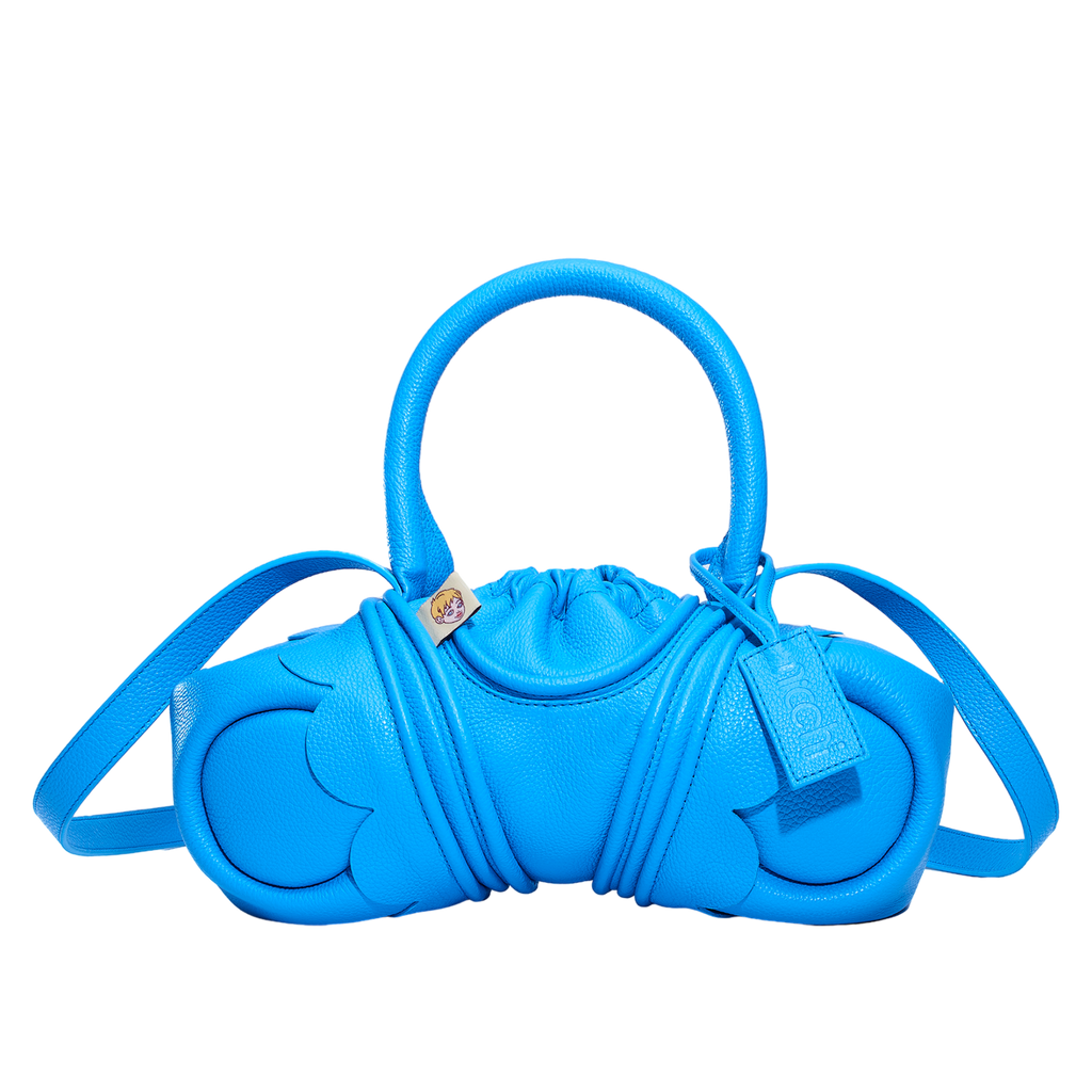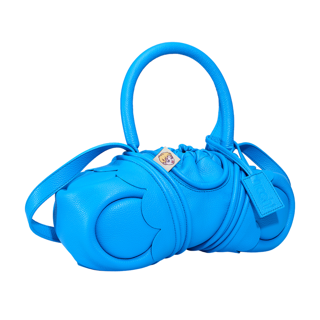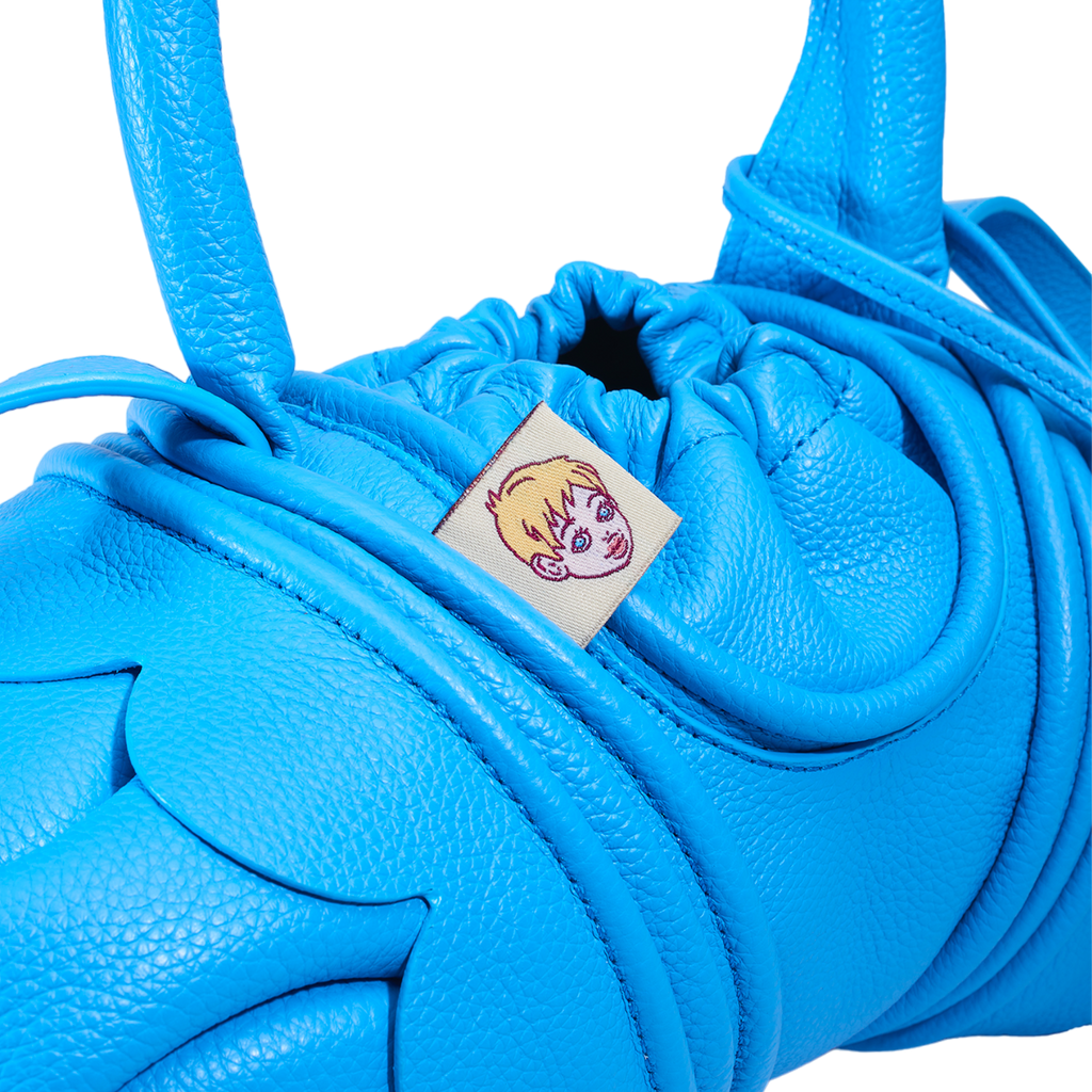 Cow leather bag with black cotton cloth lining, with a simple shoulder strap. Due to the small opening, this bag cannot fit large objects. Made in Spain. Plastic-bag-in-the-ocean-blue medium-weight leather with an embossed grain. Wet and sticky to the touch. This bag is part of our Peanut line: factory-made to a high standard, much more affordable than the exclusive bags made by hand at the nicchi workshop.