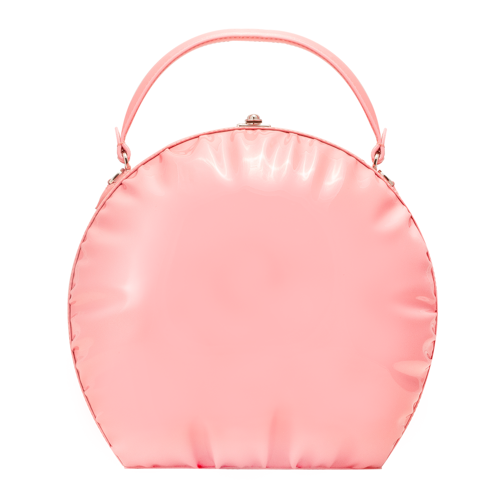 Crafted in pink patent calf leather. Rendered to mimic the silhouette and look of an inflated balloon, this playful style is finished with palladium brass hardware, lined with grey cotton drill. Includes a removable chain-link strap. Approx. 10.82" height x 11.81" width x 3.14" Depth.