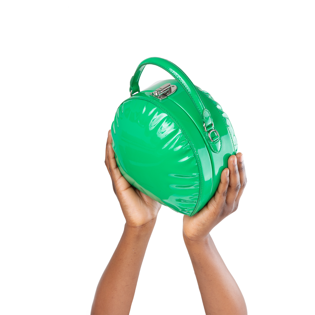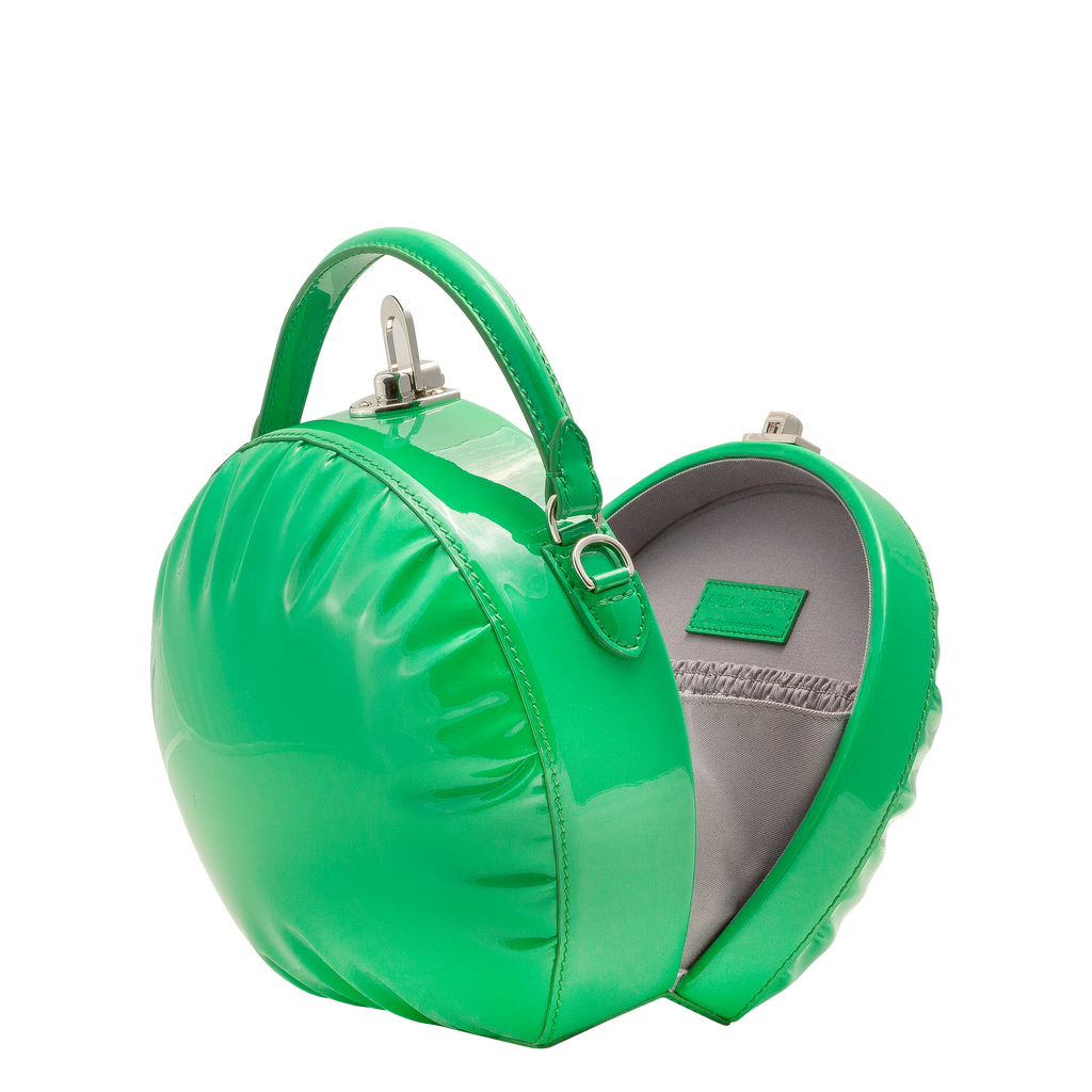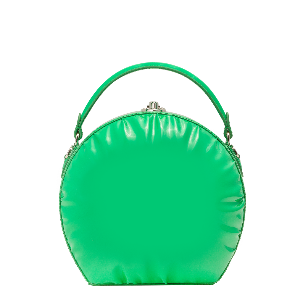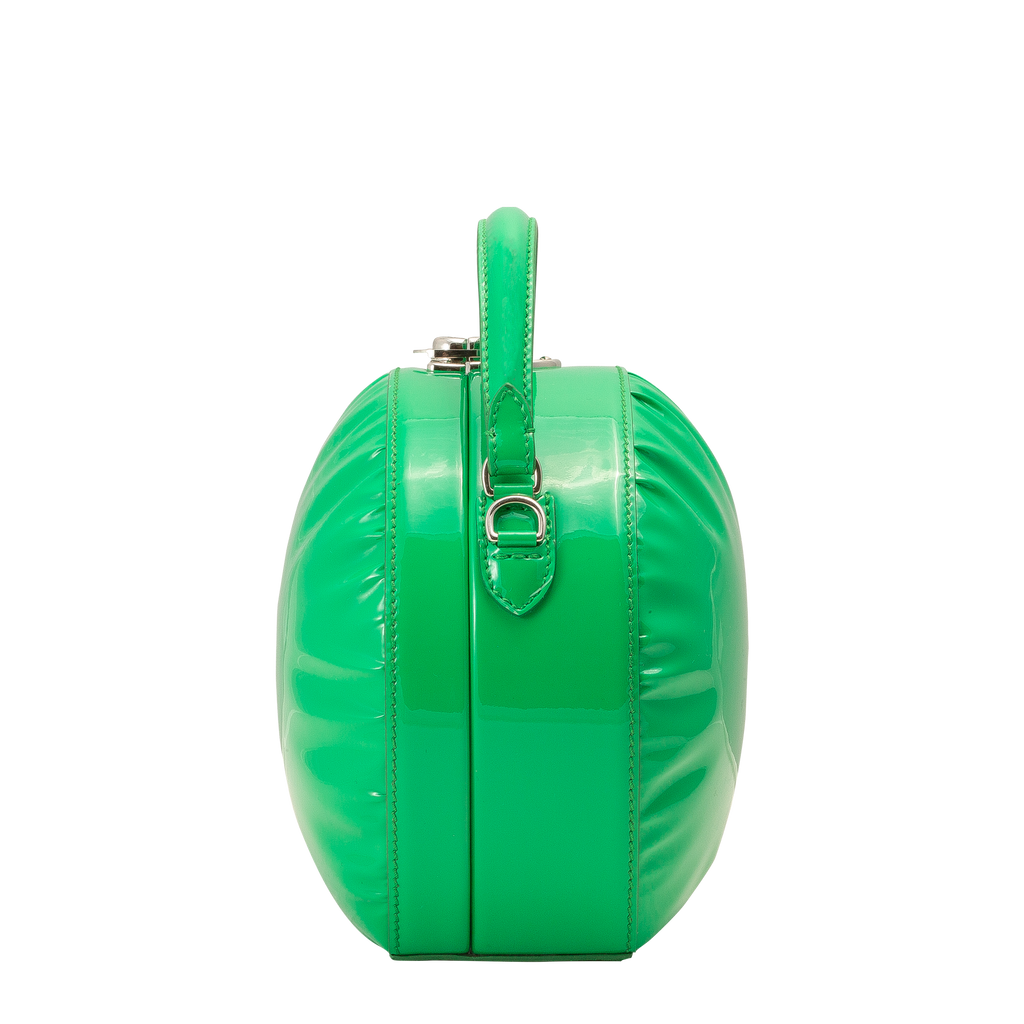 Crafted in green patent calf leather. Rendered to mimic the silhouette and look of an inflated balloon, this playful style is finished with palladium brass hardware, lined with grey cotton drill. Includes a removable chain-link strap. Approx. 8" height x 8.85" width x 2.95" depth.