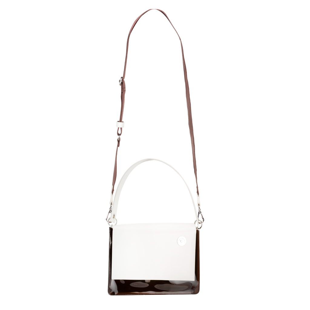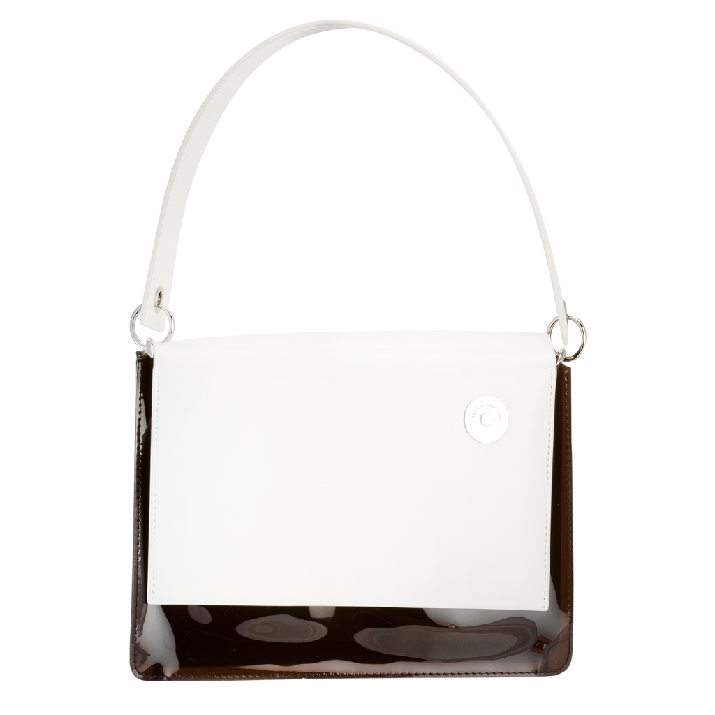 The Pinch Shoulder Bag is Karas take on a sophisticated shoulder bag. The streamlined exterior flap opens to reveal two roomy interior compartments, and a removable crossbody strap for ultra-versatile wear. Ships with dust bag Approx. 8" Height x 10" Width x 4.5" depth. 17.5” handle length. Webbing strap adjusts up to 46.5".