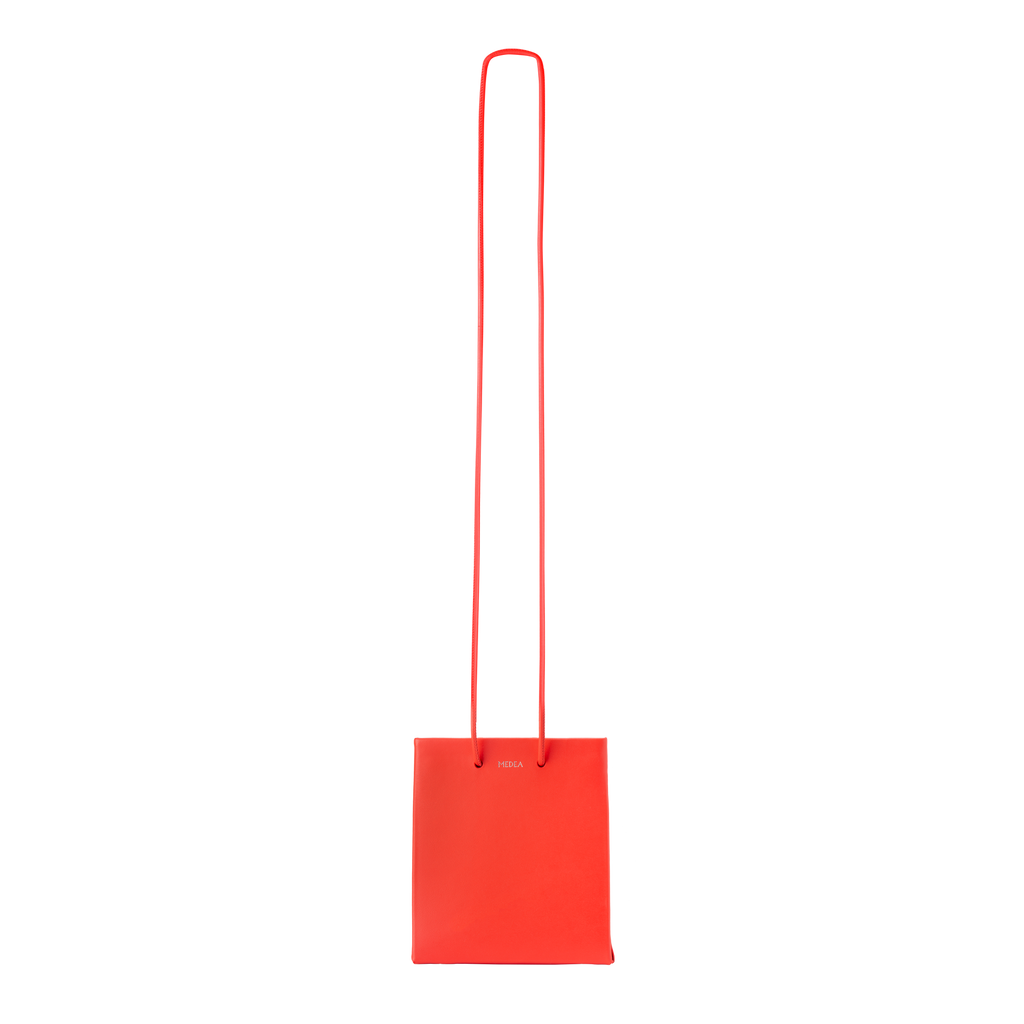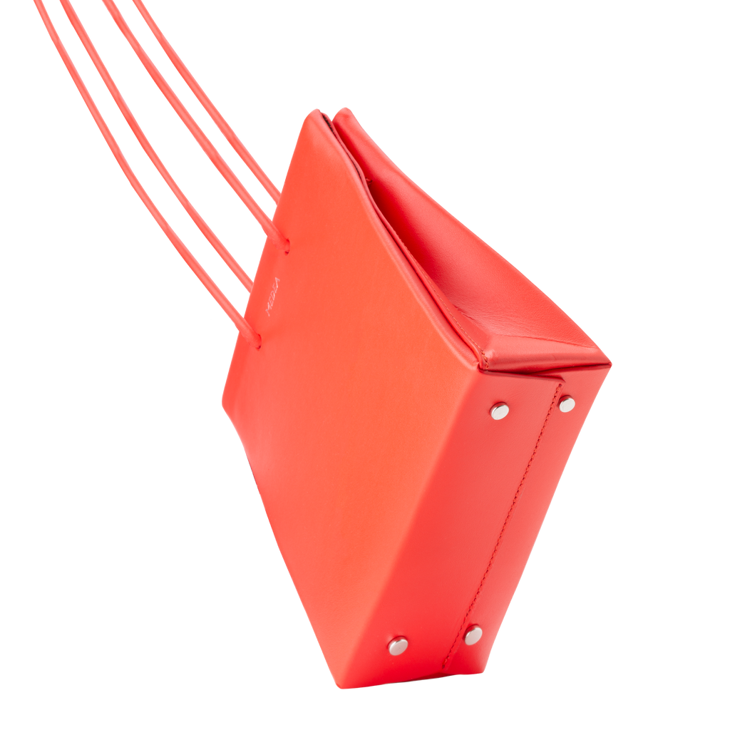 Buffed leather shoulder bag in poppy red. Twin adjustable rolled leather shoulder straps. Logo stamp in silver-tone at face and interior. Accordion panel with magnetic fastening at sides. Twill lining in black. Silver-tone hardware. Approx. 5.75" length x 6.25" height x 2.5" width.
