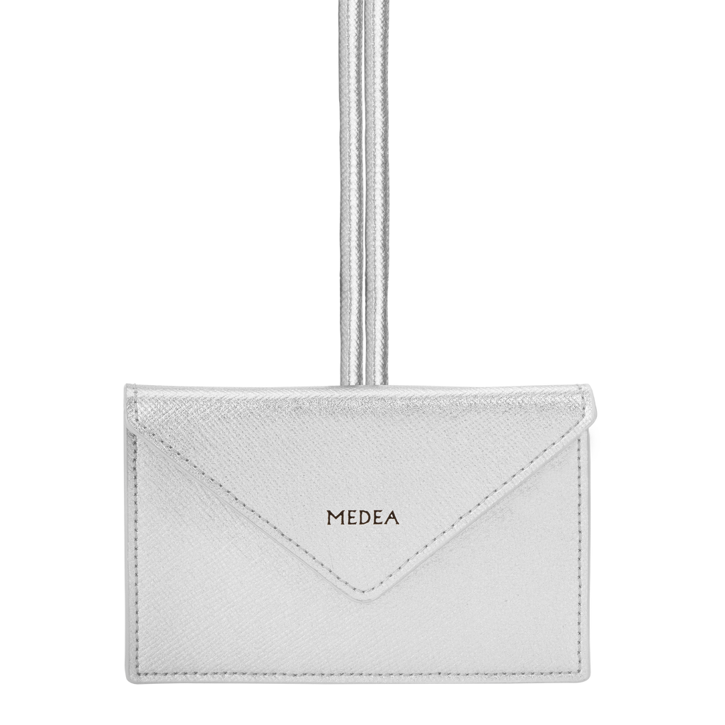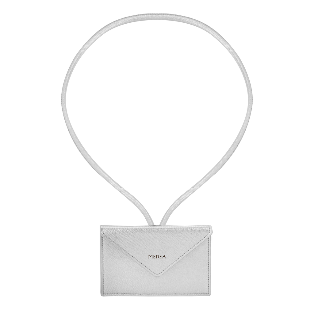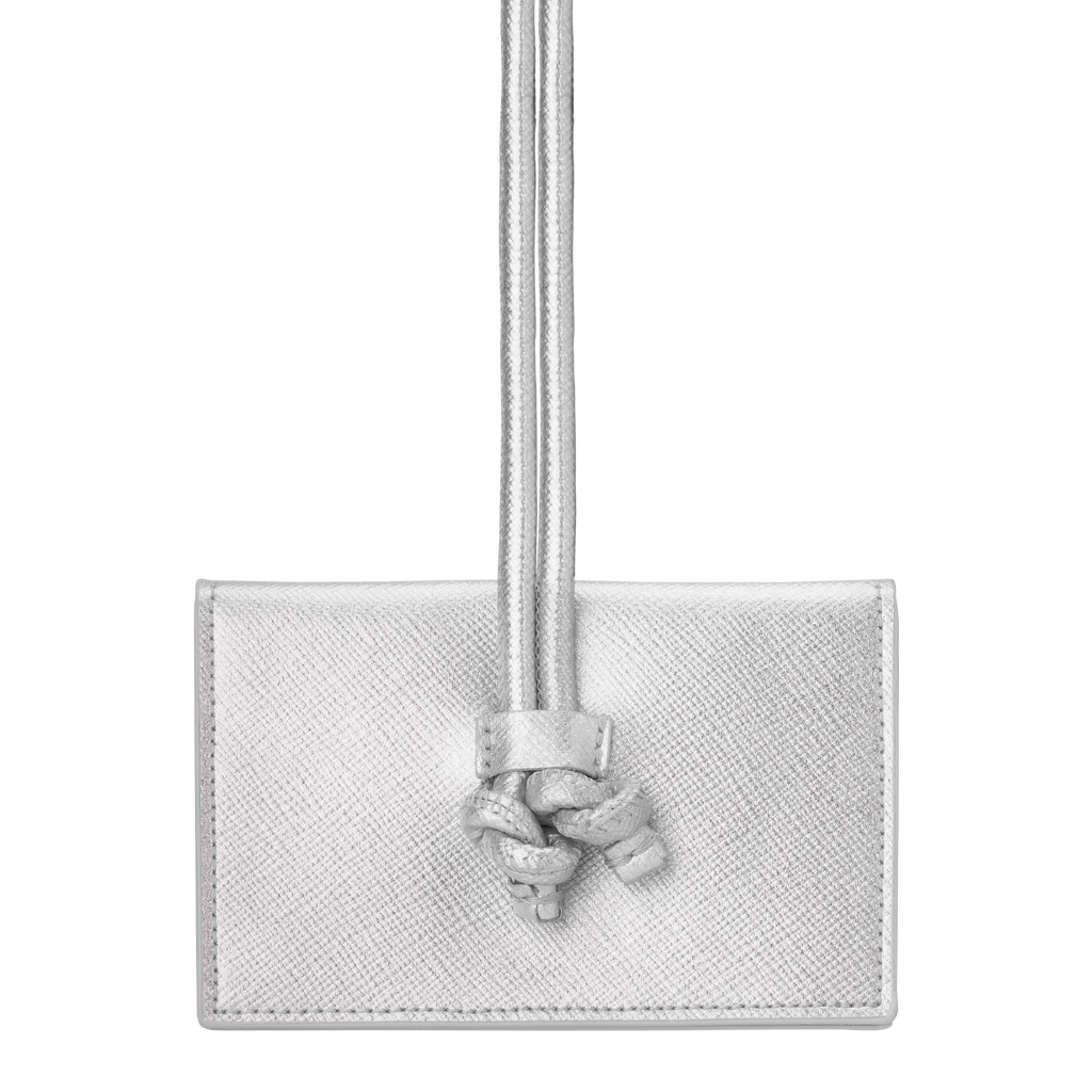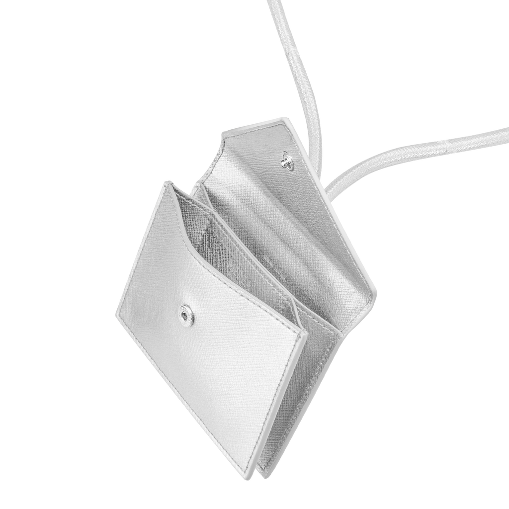 Necklace wallet in fuxia. Logo stamp in silver-tone at face and interior. Envelope design. Twill lining in black. Silver-tone hardware. Approx. 4.3" length x 15.4" Strap x 3.1" width.