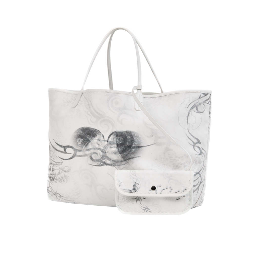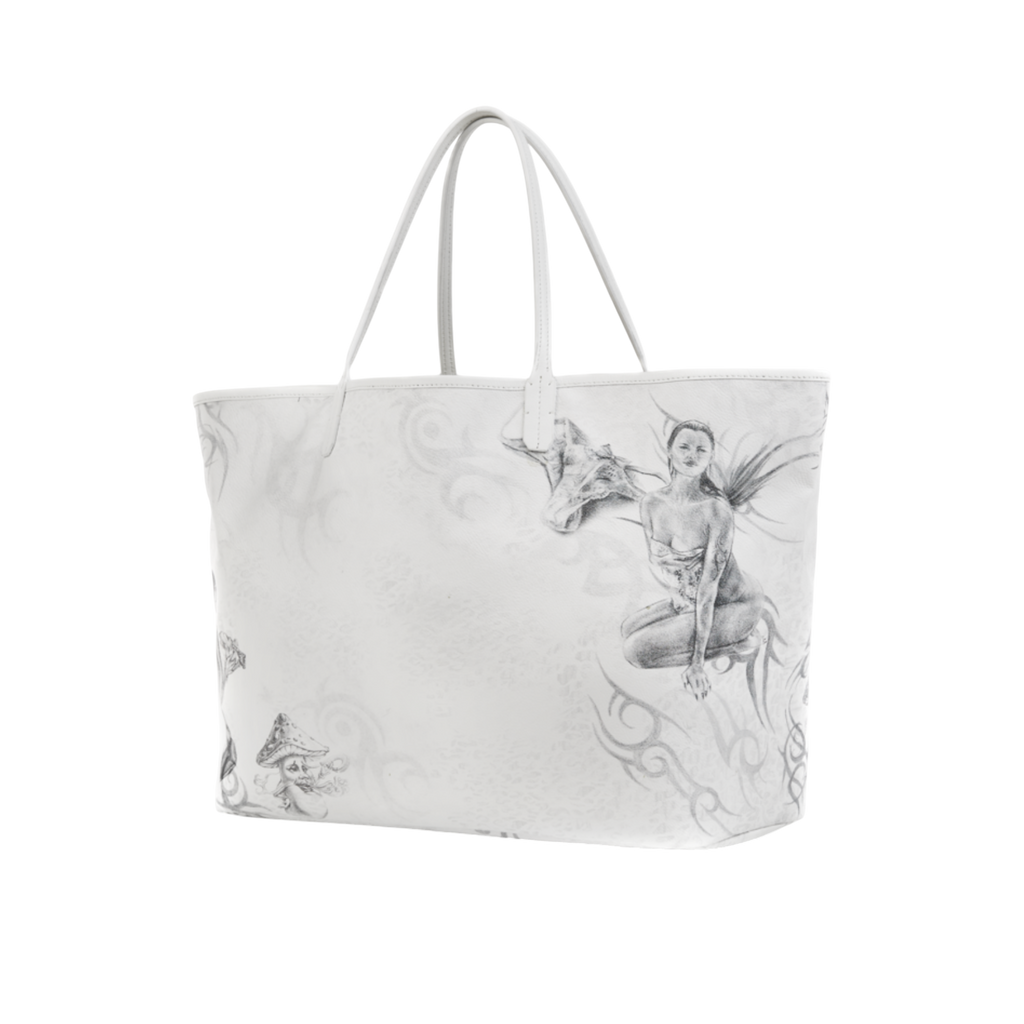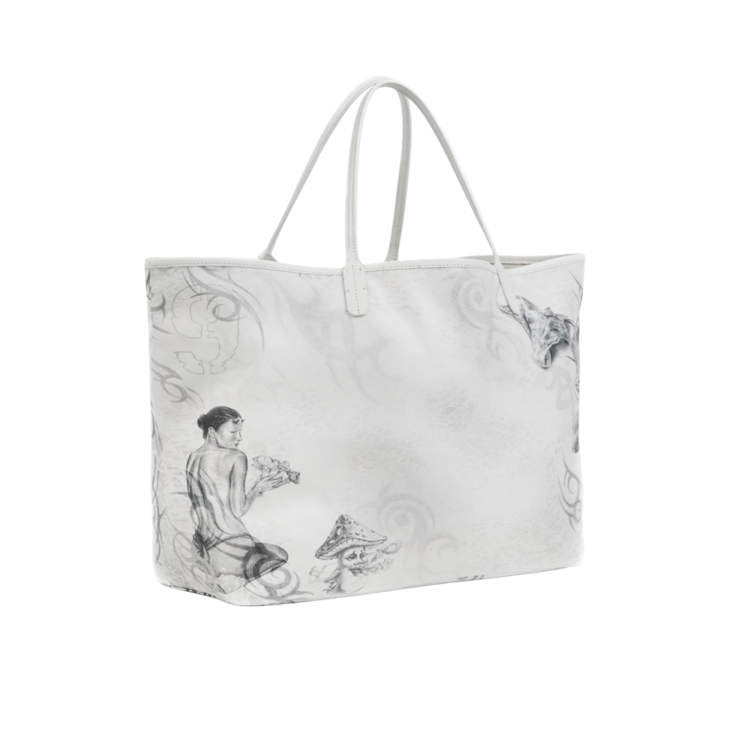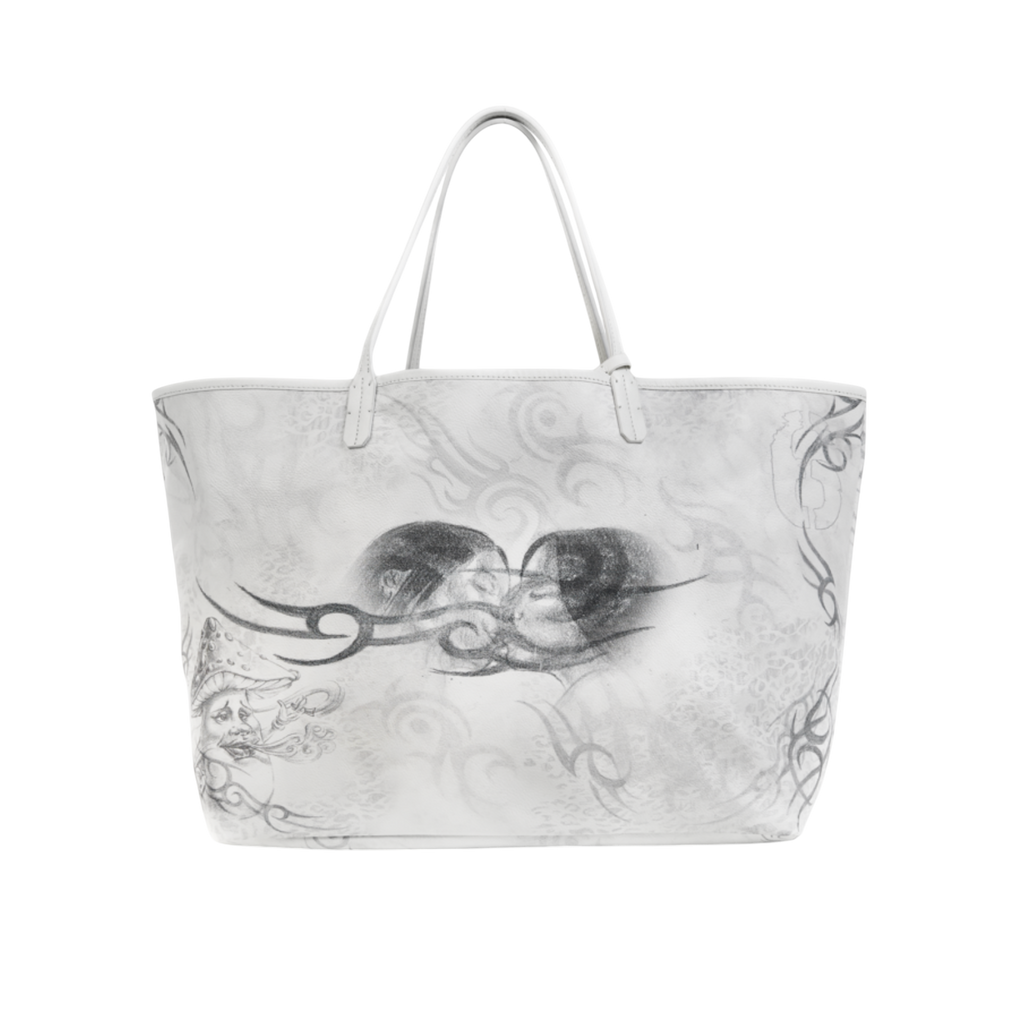 604SERVICE에서 직접 연필로 그린 그래픽이 돋보이는 사계절 활용 가능한 실용적인 쇼퍼백.