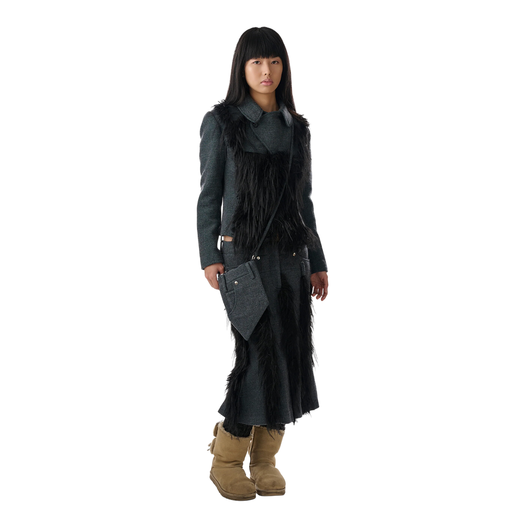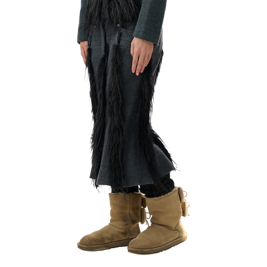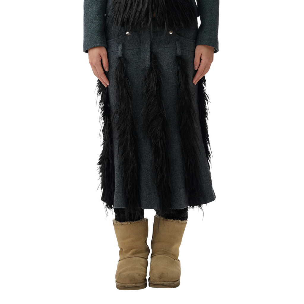 Mid-length skirt in teal-gray wool with black faux fur panels along the front and back.