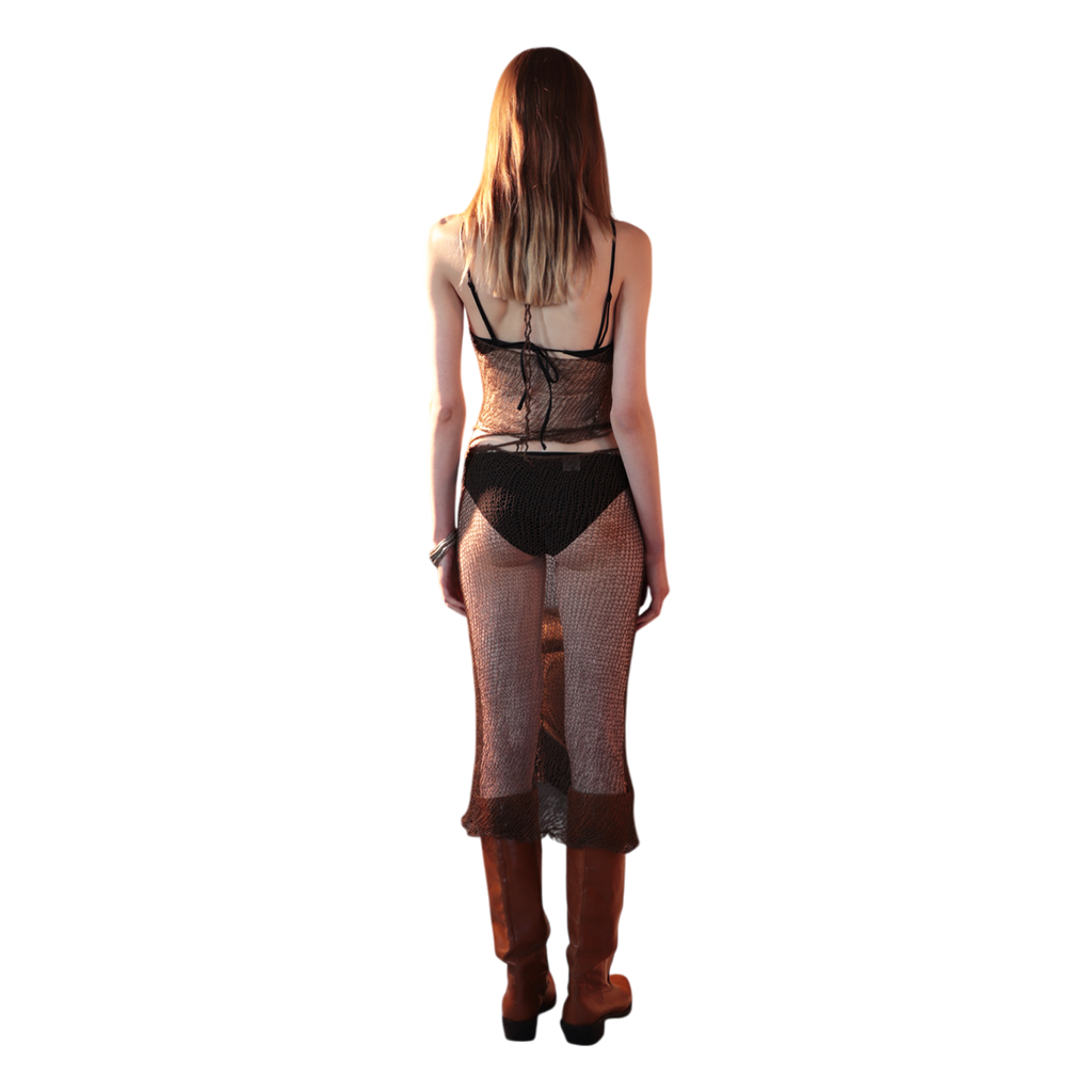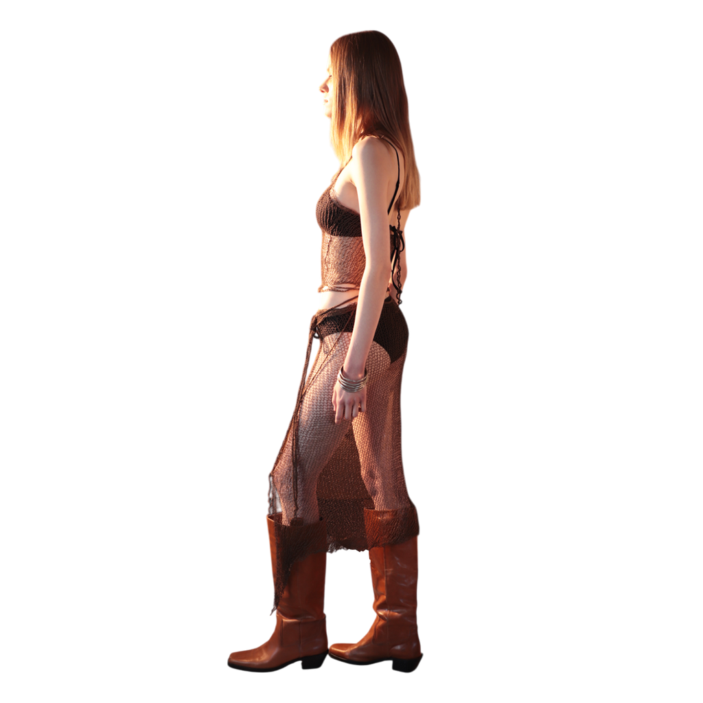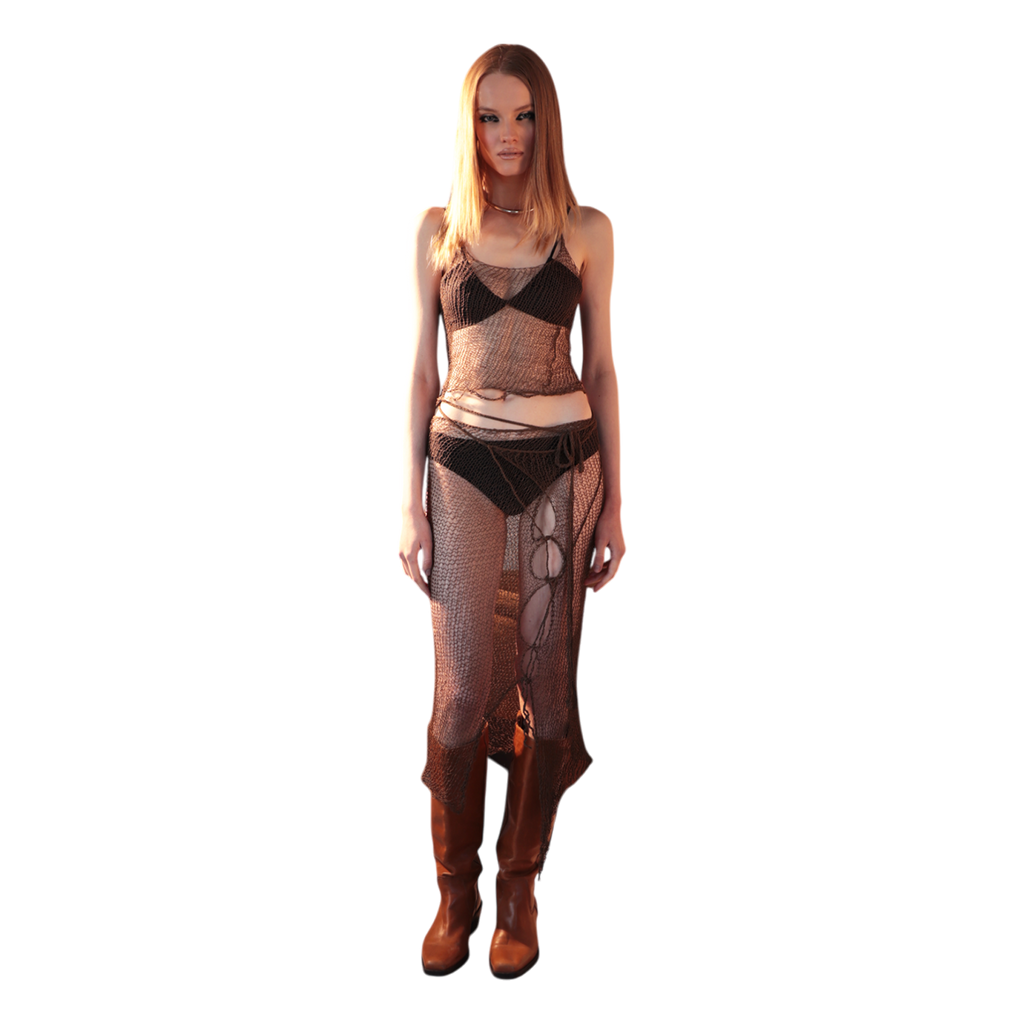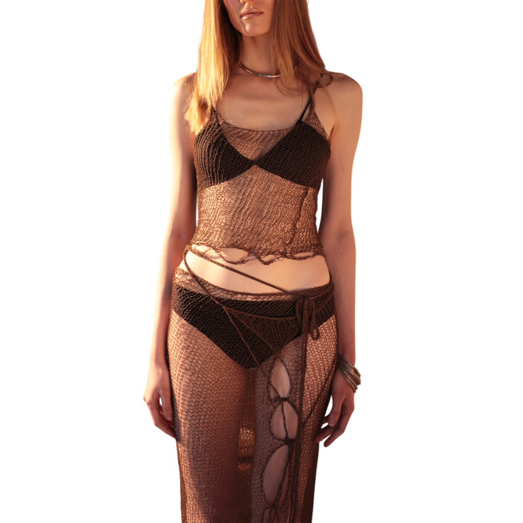 This set features a hand-knitted top and pareo, both crafted from 100% Mercerized Cotton. The top has an asymmetric bottom with an adjustable neck tie, offering a personalized fit. The pareo is designed with multiple ties that allow you to fix it around your hips and create a unique connection between the parts, making you the designer of your own piece. The hand-crafted knitting pattern adds a natural, flowing look, maintaining its shape over time. The Mercerized Cotton is soft, strong, and perfect for any season.