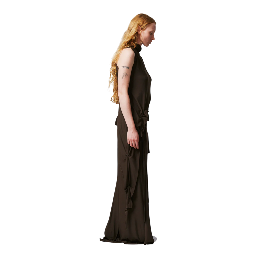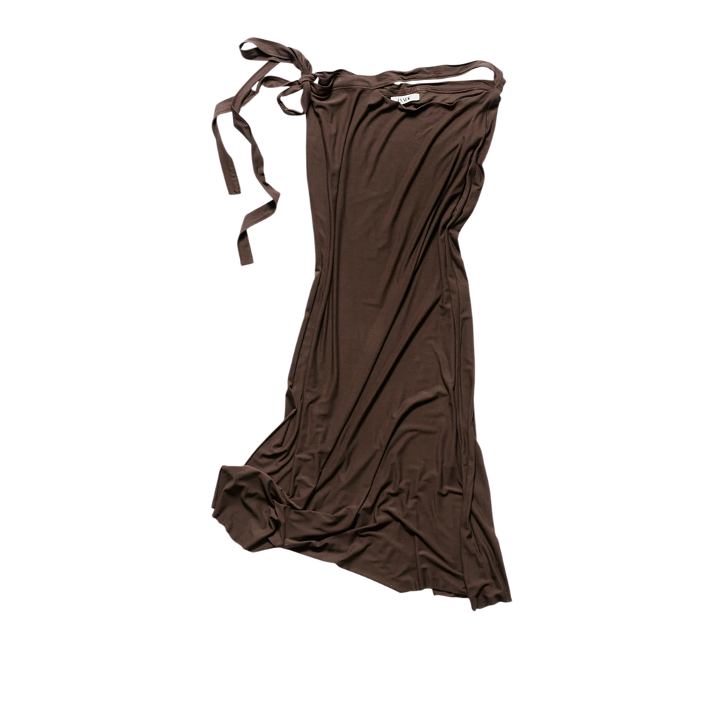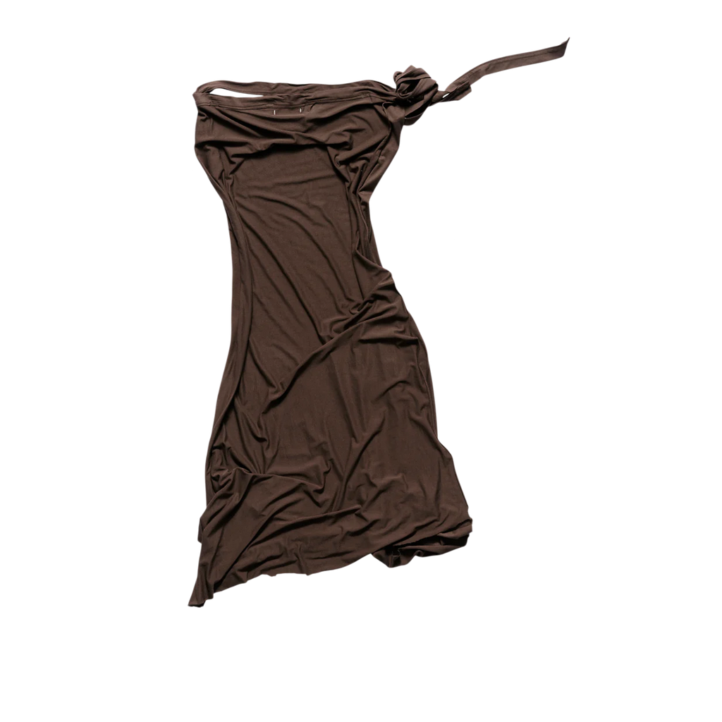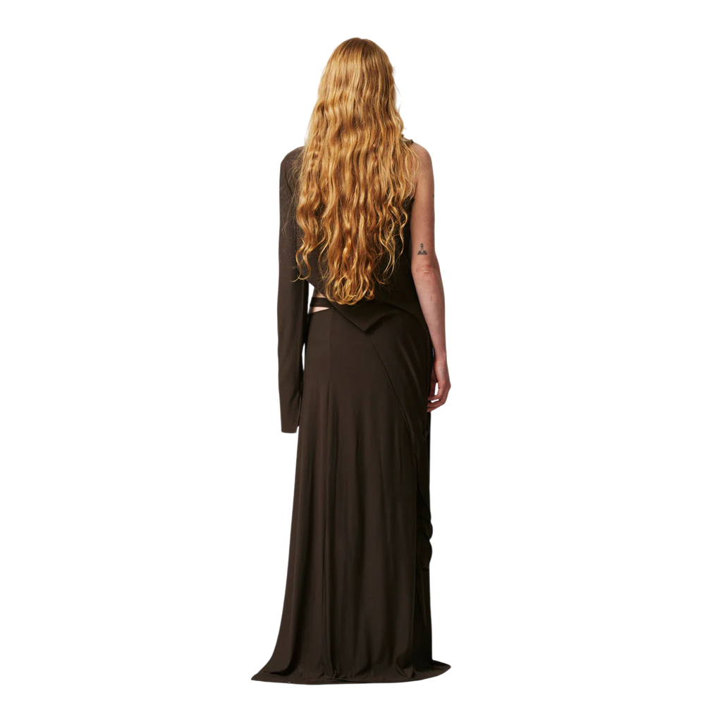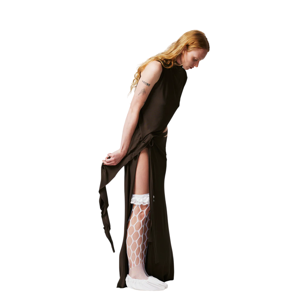 Handcrafted in our Madrid studio, the Rick Skirt is a floor-length, sheer skirt in a rich brown hue. Made from locally sourced fabric, it features an open side for ease of movement and a cut-out detail on the opposite side. The adjustable waist, secured with a knot lace, ensures a flattering, customizable fit.