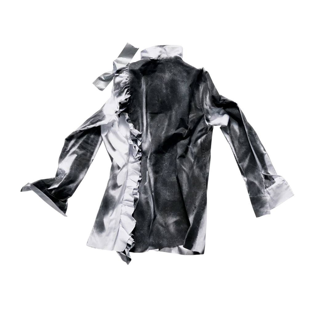 Each shirt is hand-dyed after construction, leaving subtle traces of the original fabric and ensuring every piece is one of a kind.