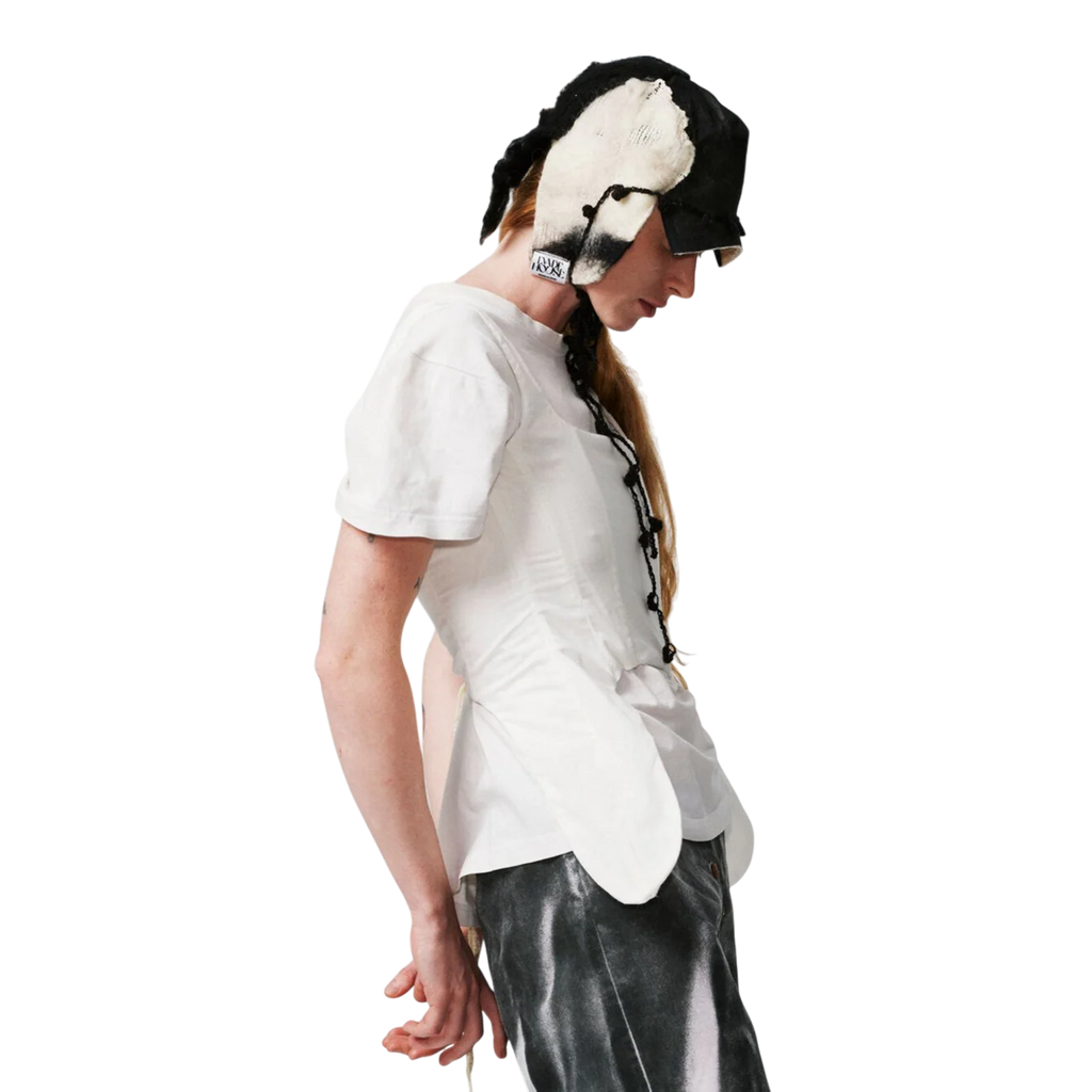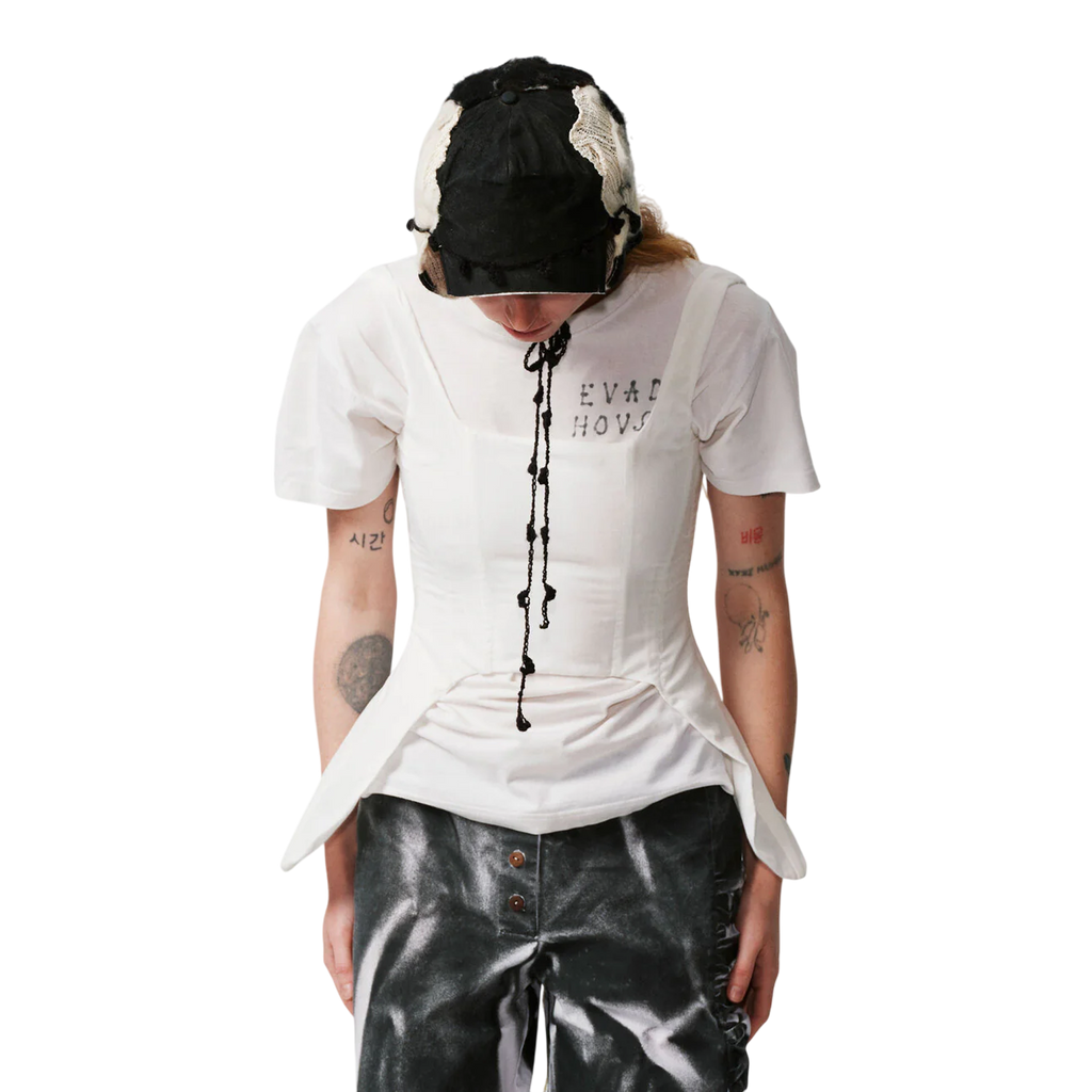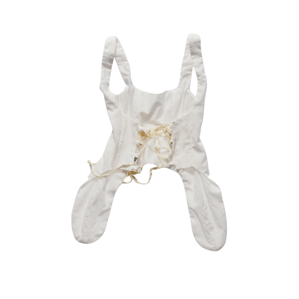 This structured corset features a square neckline with exaggerated lapel-like extensions, adding boldness to its design. The delicate lace-up closure at the back ensures a customizable fit, making it both a statement piece and a versatile garment.