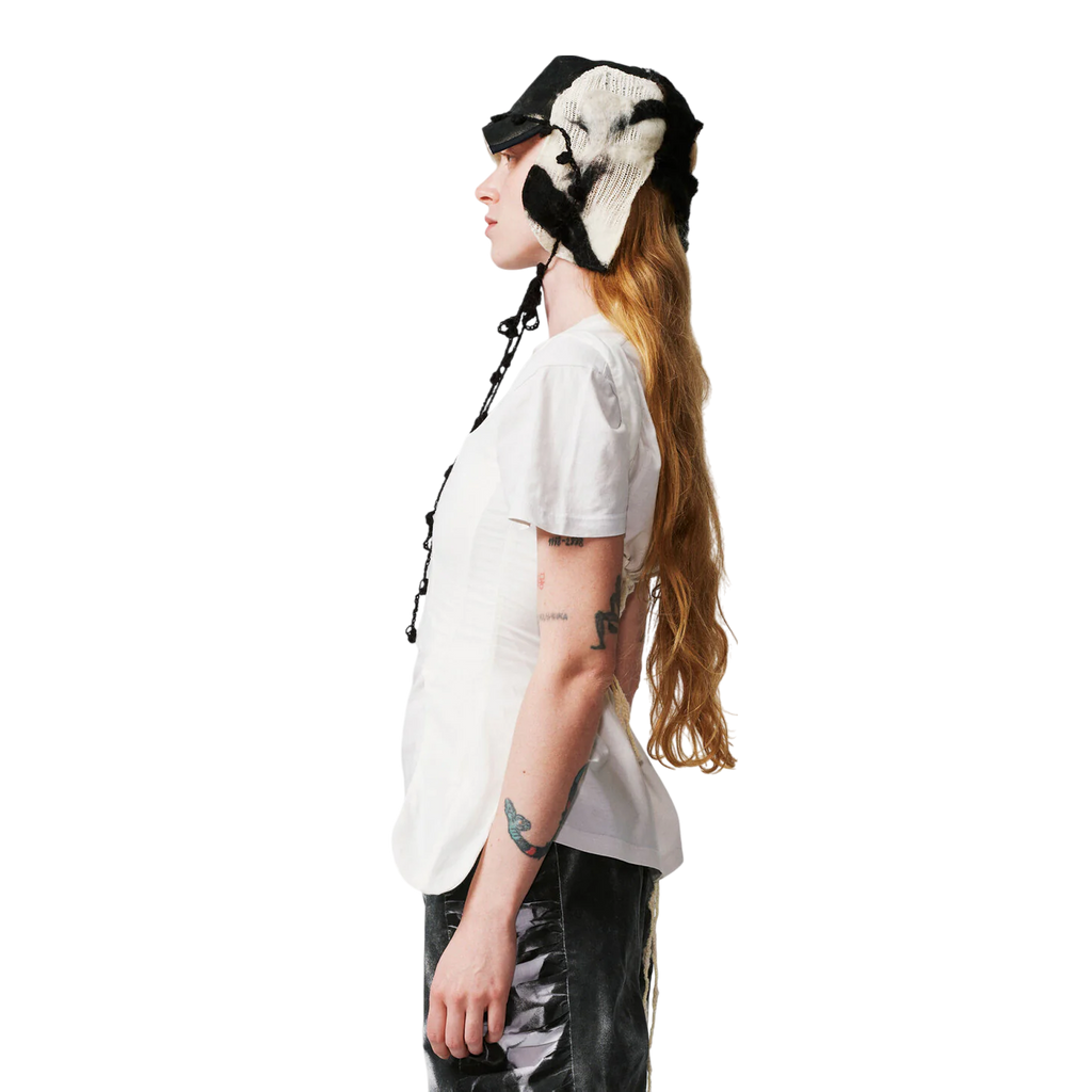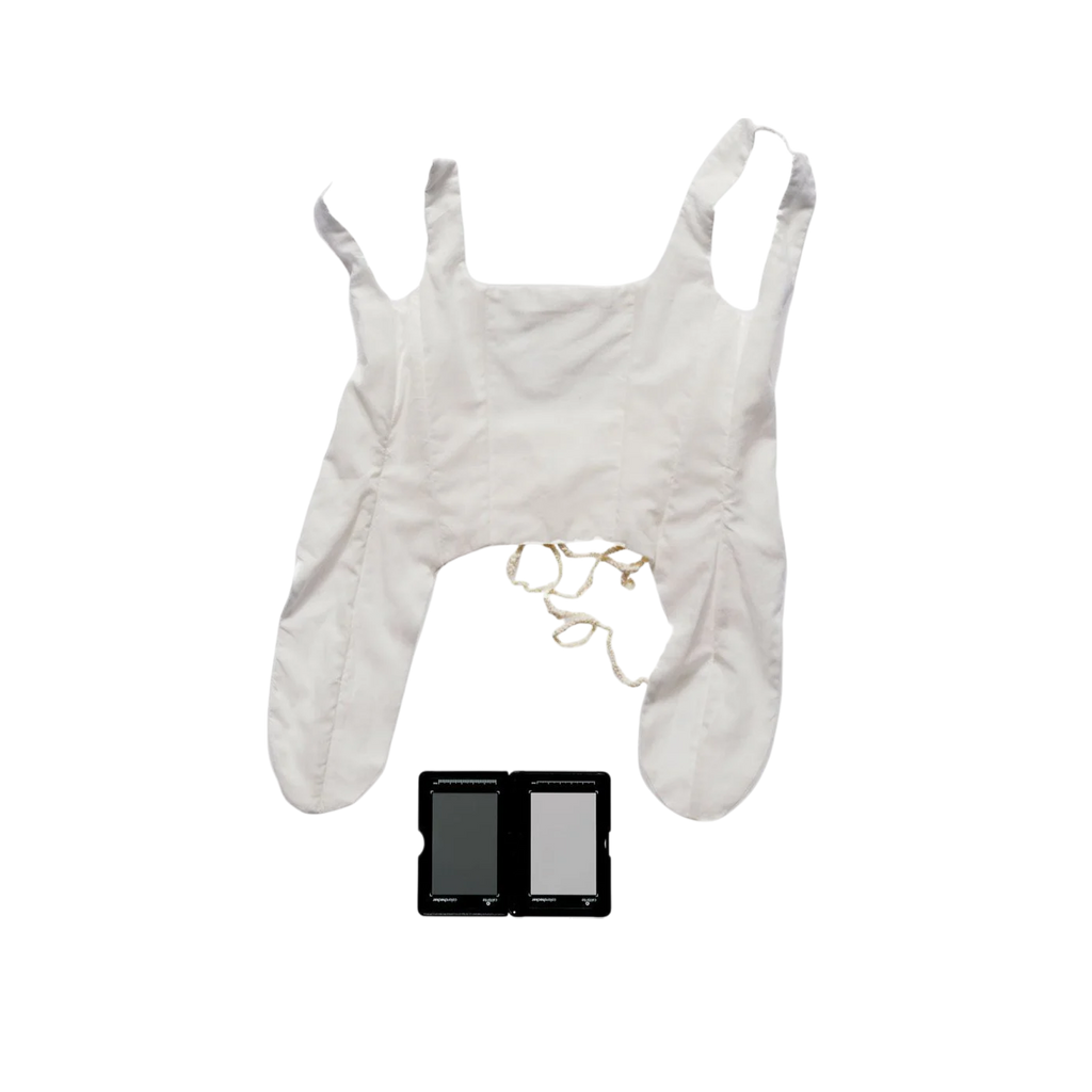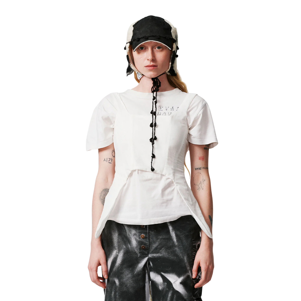 This structured corset features a square neckline with exaggerated lapel-like extensions, adding boldness to its design. The delicate lace-up closure at the back ensures a customizable fit, making it both a statement piece and a versatile garment.