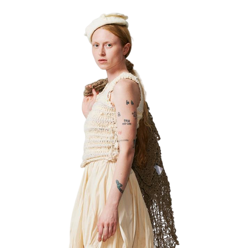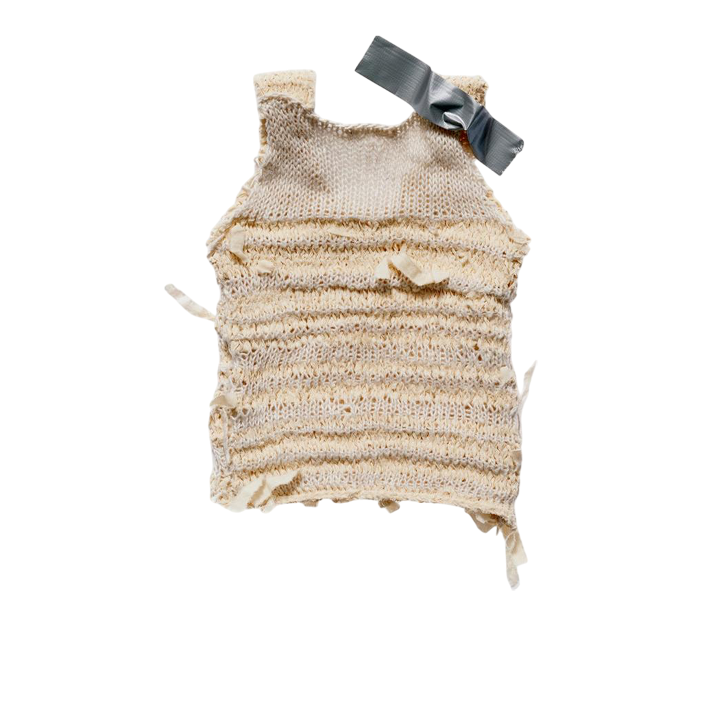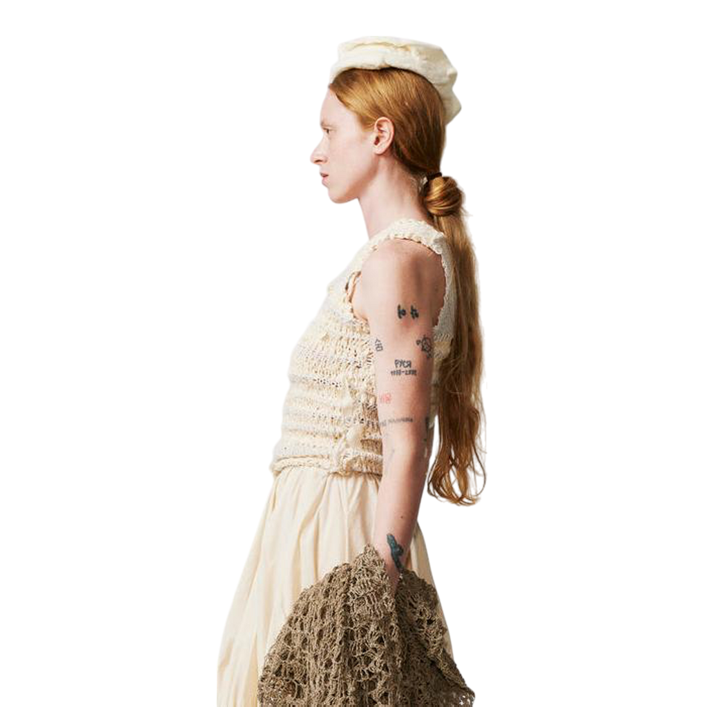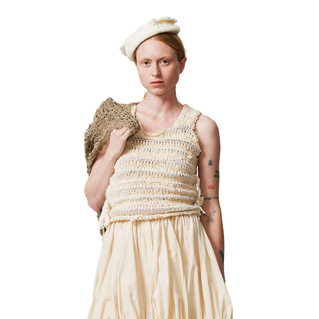 Handcrafted in our Madrid studio, the Lu Top is a fitted, hand-knitted tank top adorned with pieces of retor thread throughout. Made entirely by hand using repurposed retor scraps and organic cotton yarn, each top is unique, celebrating artisanal craftsmanship and sustainability.