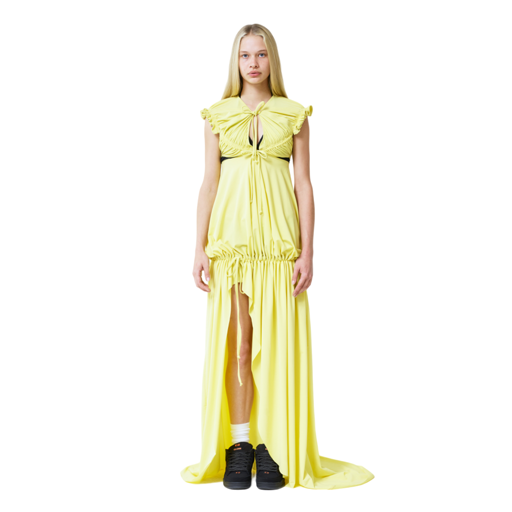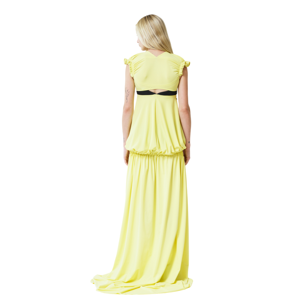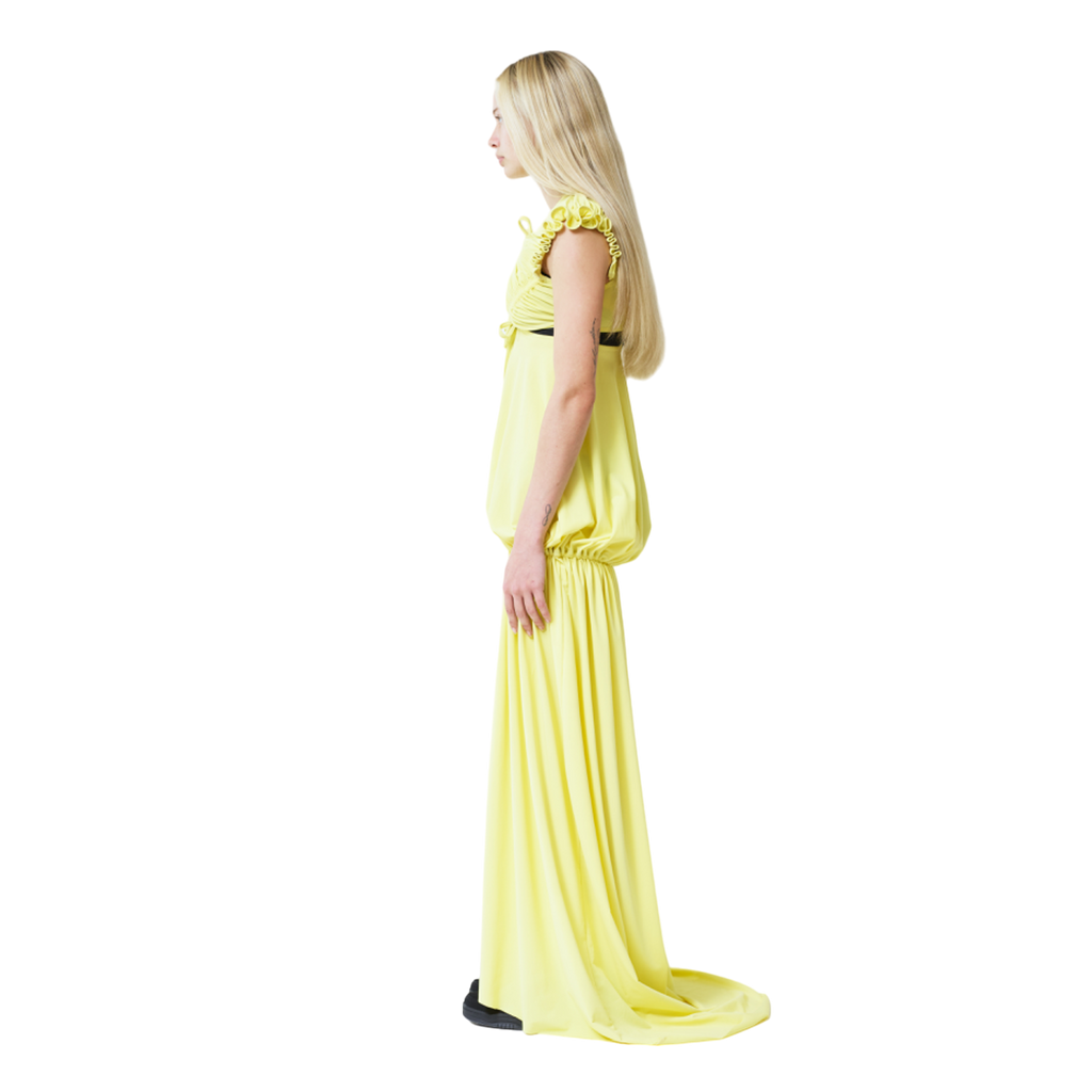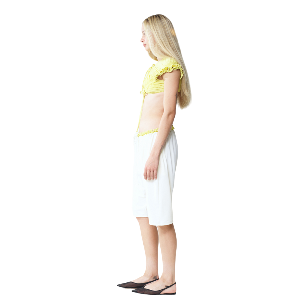 Cropped bustier style fitted bolero with micro frilly cap sleeves. Elaborate ruched, gathered and flat panelling throughout. Constructed with signature 2 part inseam detail and decorated with zig zag stitching. Double front tie closure. May be worn open or tied closed.