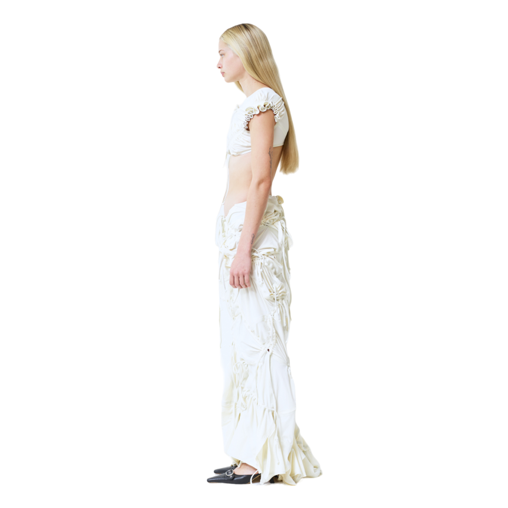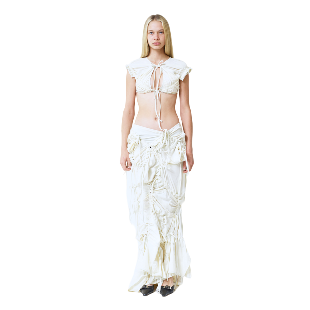 Cropped bustier style fitted bolero with micro frilly cap sleeves. Elaborate ruched, gathered and flat panelling throughout. Constructed with signature 2 part inseam detail and decorated with zig zag stitching. Double front tie closure. May be worn open or tied closed.