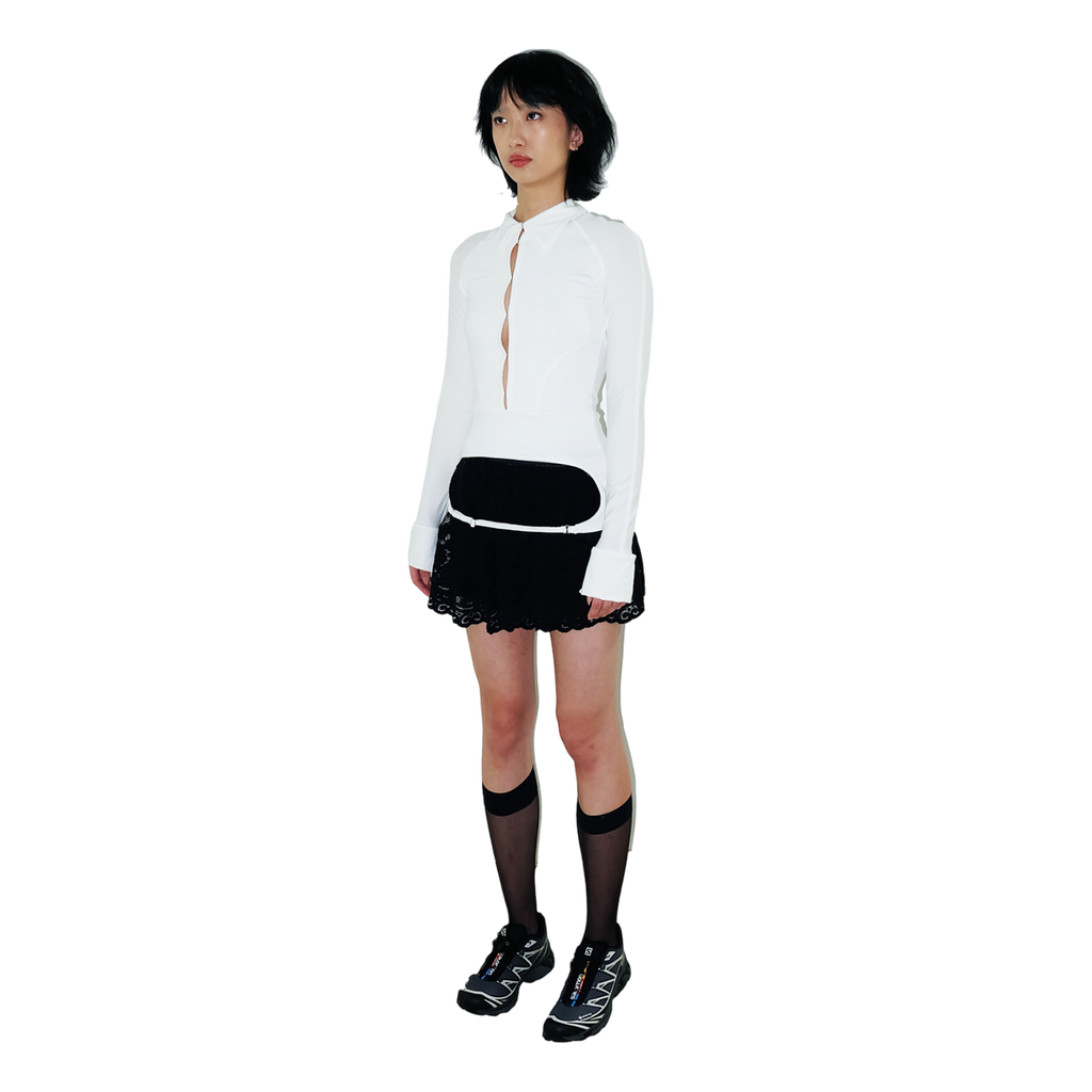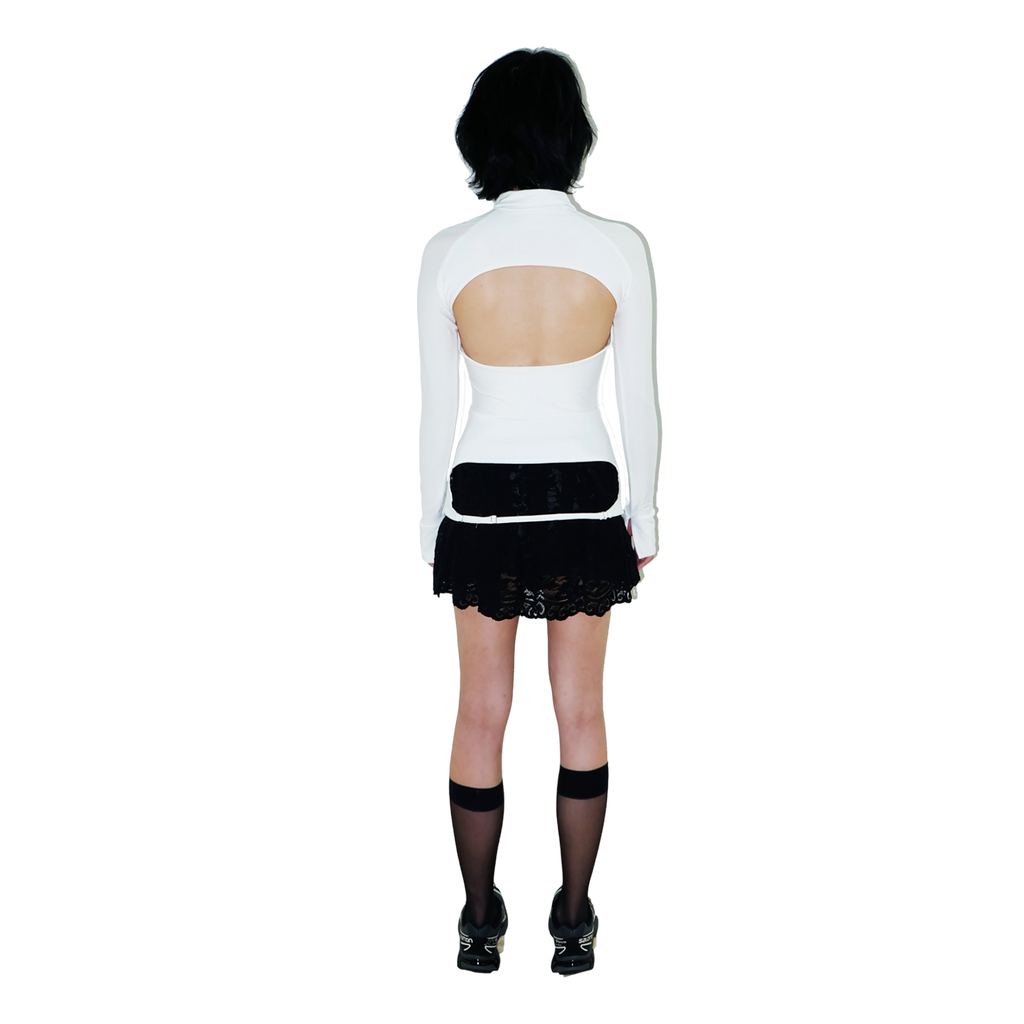 Fitted Jersey Shirt featuring a waist-up hook & eye closure. The back steals the show with a backless cutout detail. Plus, the clever addition of waist straps, convertible into thigh straps, ensures your shirt stays in place without riding up.