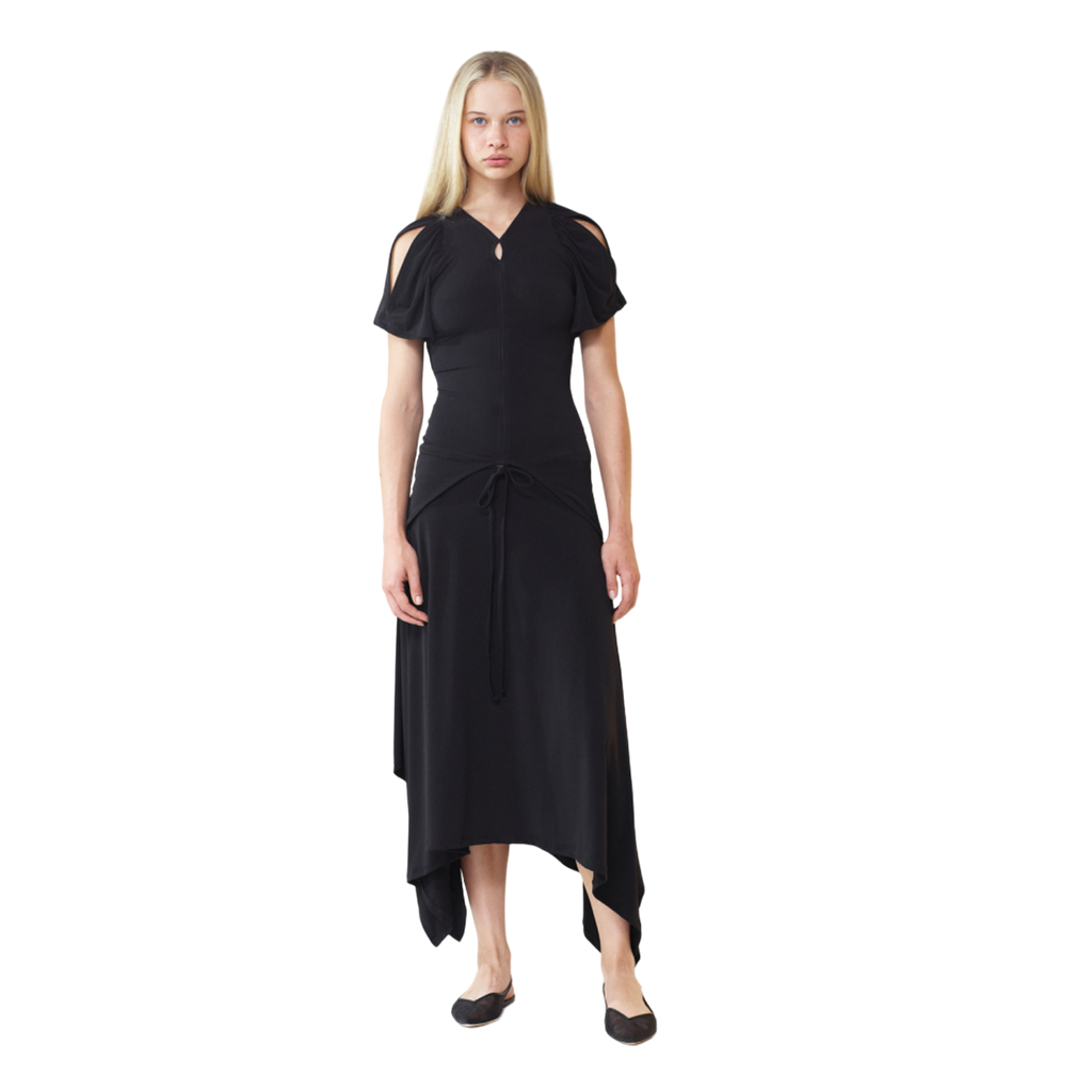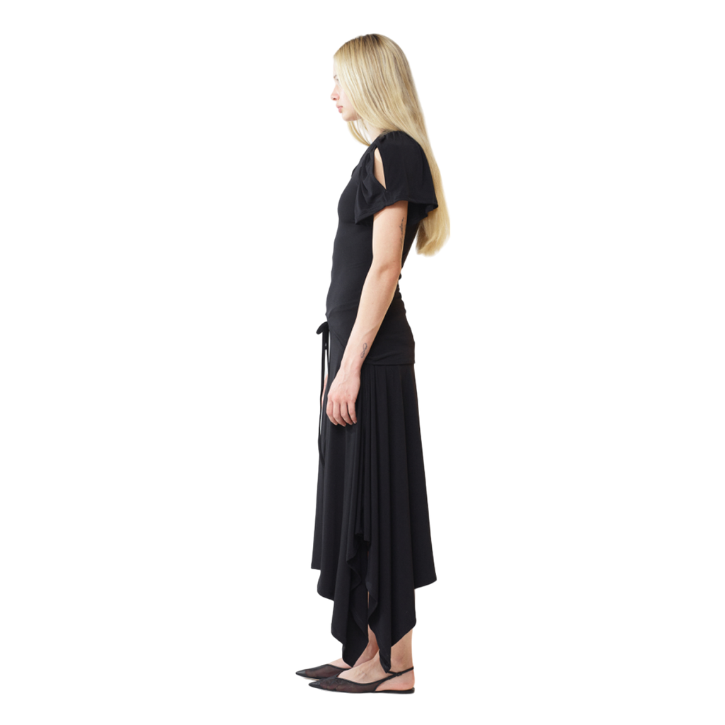 Mid-Low rise long Handkerchief skirt with triangular waistband. Featuring signature 2 part top- stitching at waist and side seam. Faux tie-closer at CF. Can be worn as a dress also.