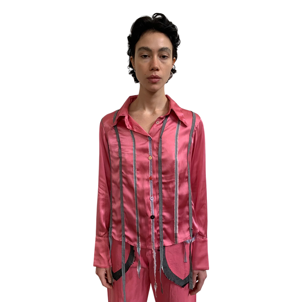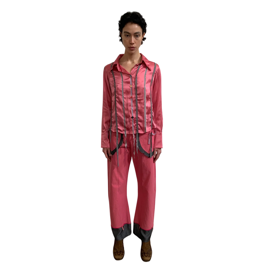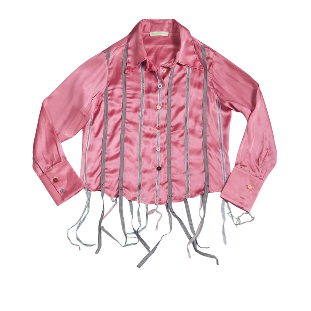 Shirt with applied ribbons crafted from scraps.