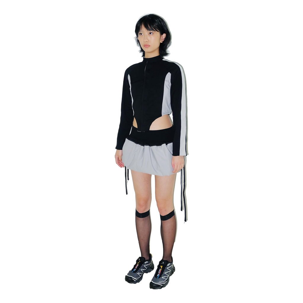 An A-line skirt with a comfortable ribbed waistband and adjustable hem. Transform the hem into a balloon skirt for a playful look. The sporty symmetrical contrasting design adds a touch of athleticism to this versatile piece.
