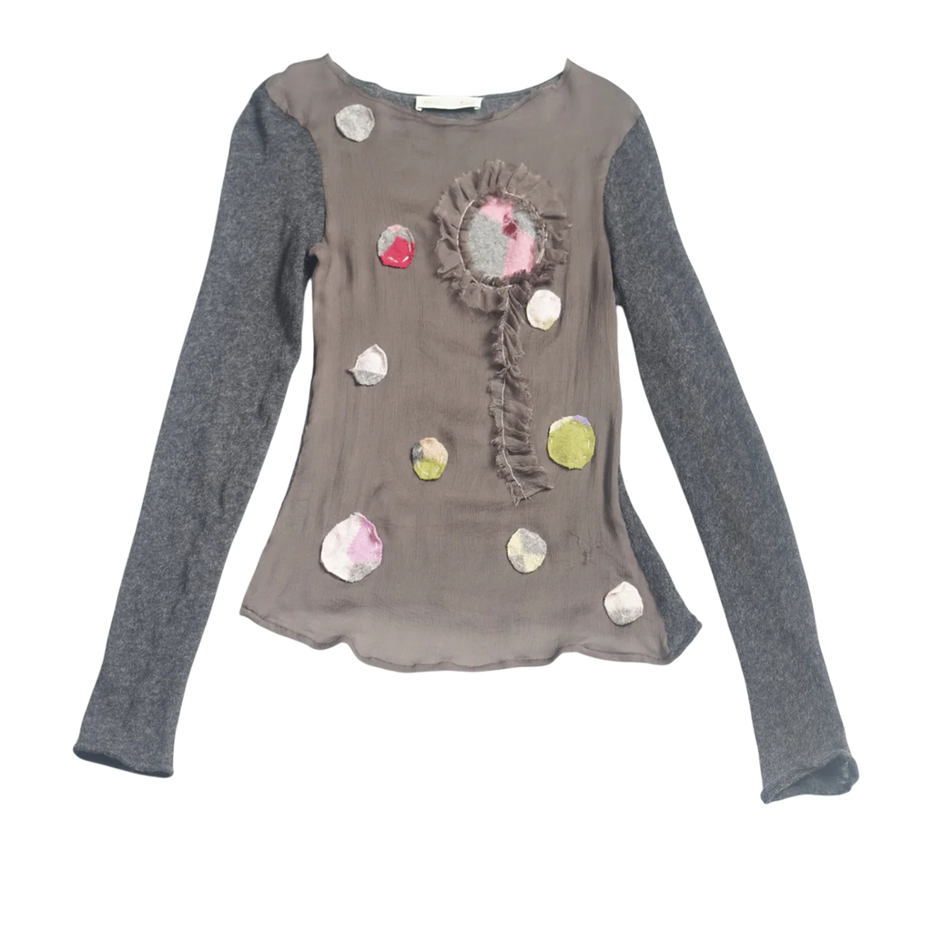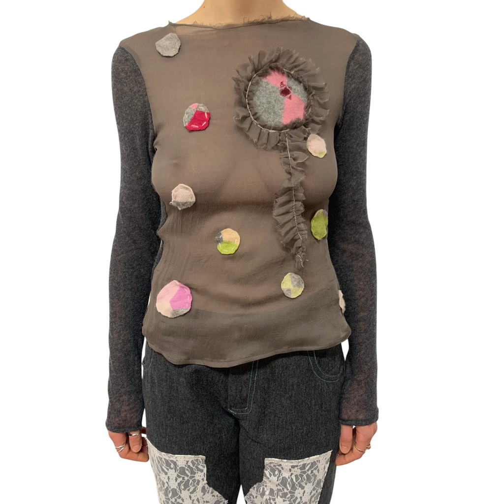 Features felted knit polka dots on the front, crafted from upcycled materials.