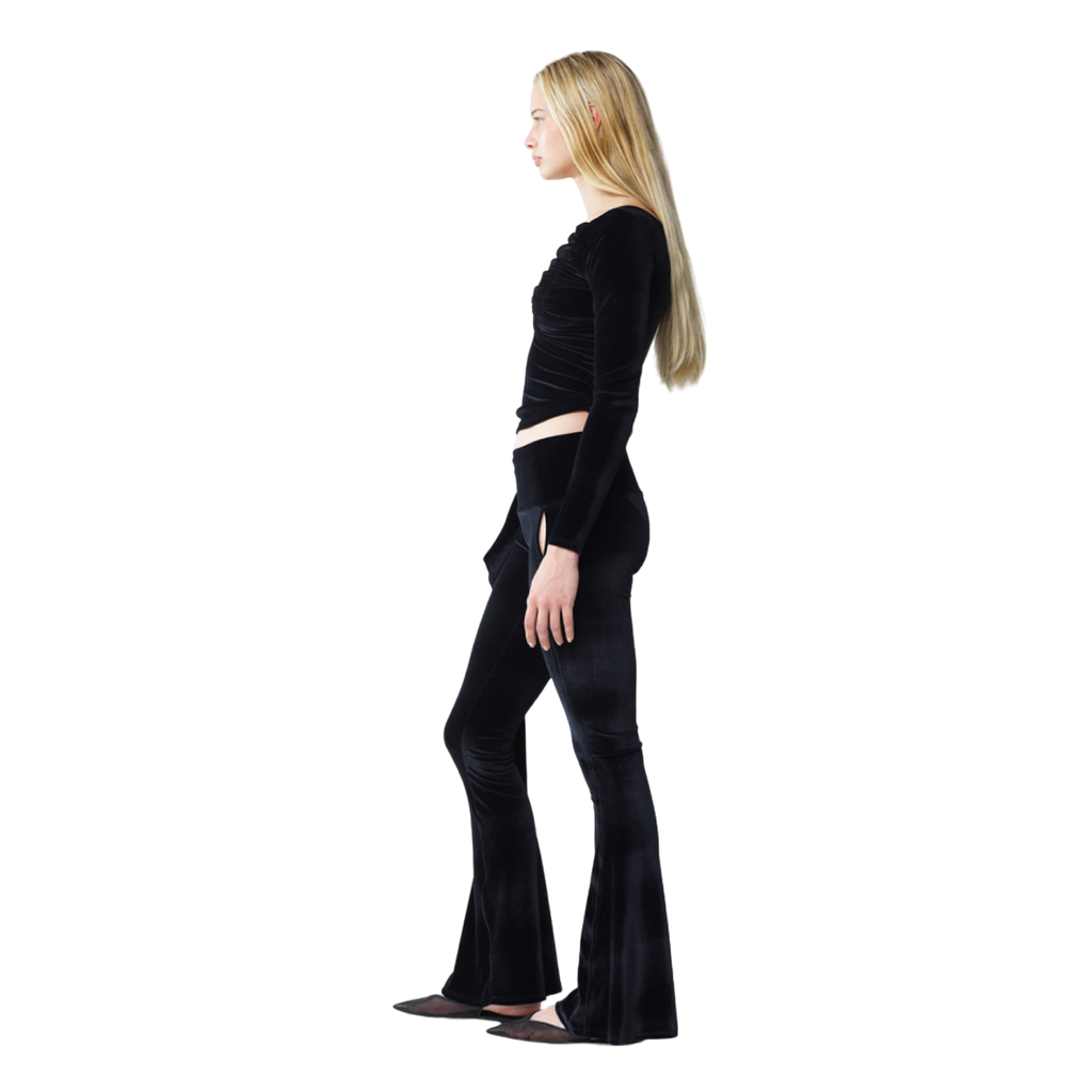 Long sleeve top with ruched v- neck panel detail on front. Constructed with signature 2 part top stitching detail. Gently scooped back neckline. Made in a thick, premium velour. Soft and heat retaining.