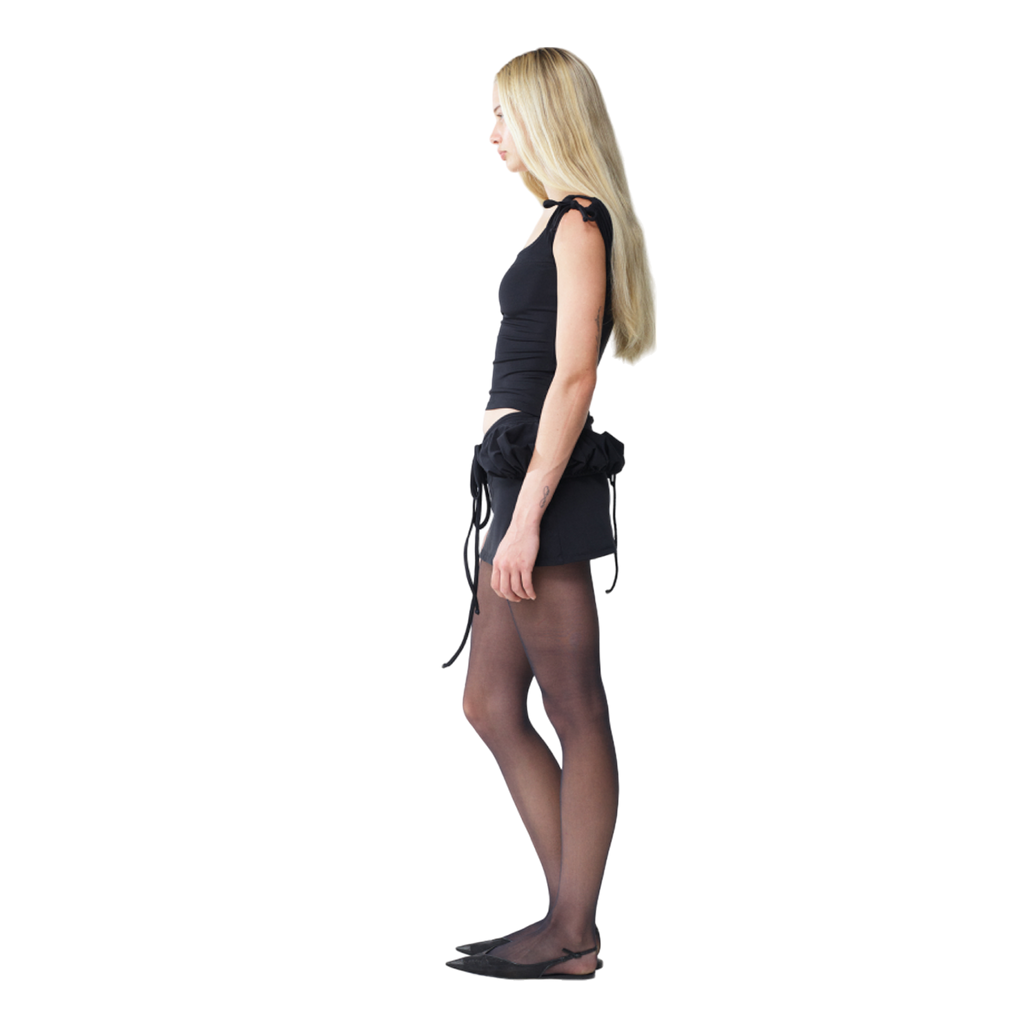 Lined Mini Skirt with adjustable puff panels at hip. Double elasticated waistband constructed with intricate zig zag top stitching. Rubbered ties loop through puff panel and may be fastened at front / back opening if desired. The puff can be transformed into a flounce by loosening the Ruch.